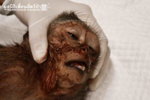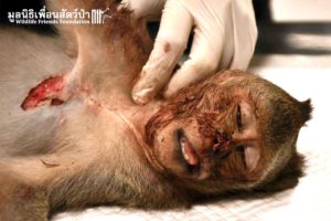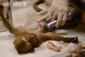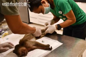 Upon returning back to the Wildlife Hospital, the Veterinary Team did an initial examination and found the monkey had large wounds around his body with heart arrhythmias.