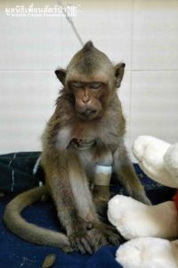 เมื่อนำกลับมาที่โรงพยาบาลทีมสัตวเเพทย์ได้ตรวจร่างกาย พบว่าเจ้าลิงมีรอยเเผลขนาดใหญ่บริเวณหน้าอกเเละมีอาการหัวใจเต้นผิดปกติ เบื้องต้นได้ทำการให้น้ำเกลือเเละทำเเผลเป็นที่เรียบร้อย