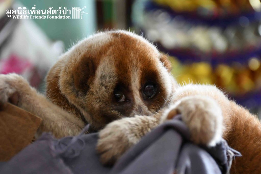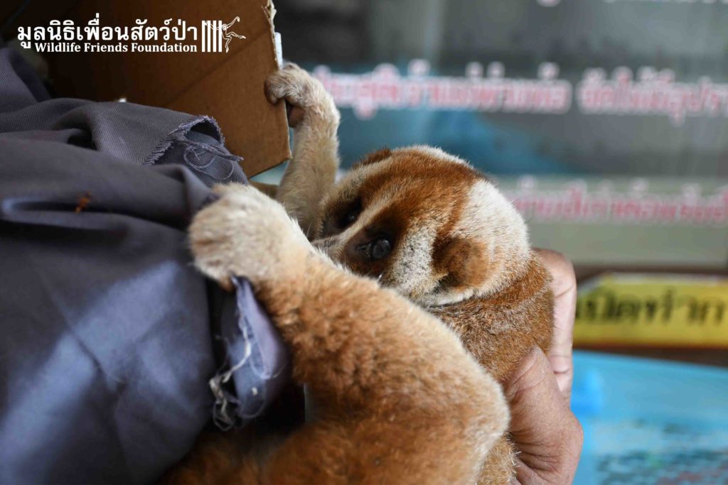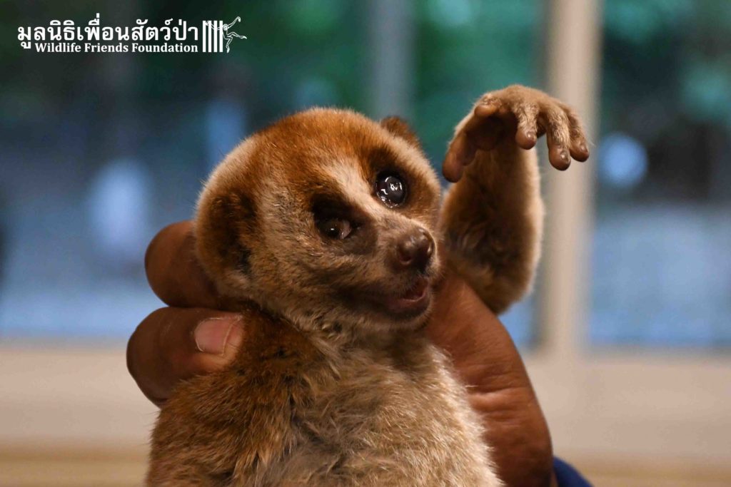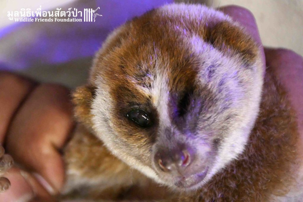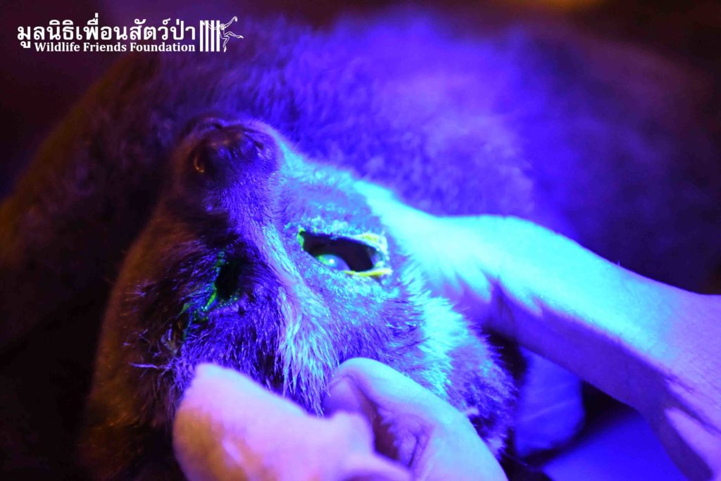 This week the WFFT Rescue Team headed to the Sawang Sanpetch Foundation, 30 minutes away from the WFFT headquarters. We had received a phone call about a wild Bengal Slow Loris that had been found seeking shelter in a building. After a medical examination, our team discovered inflammation in Mike’s eyes this might due to Insects bites.