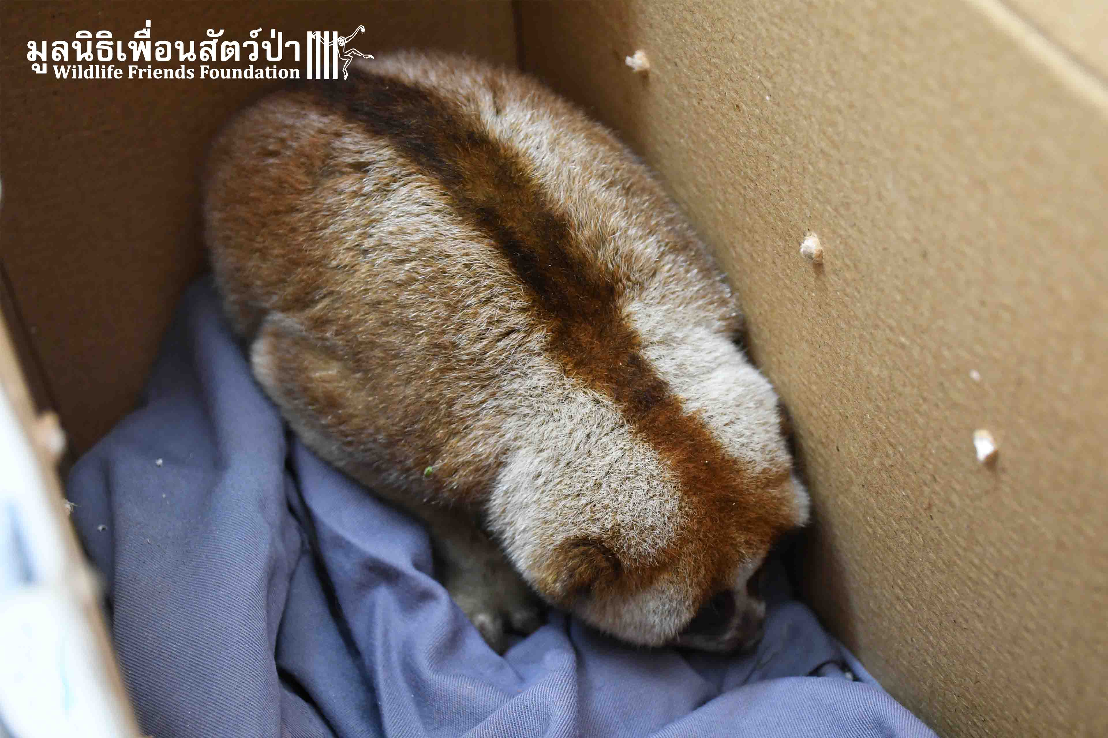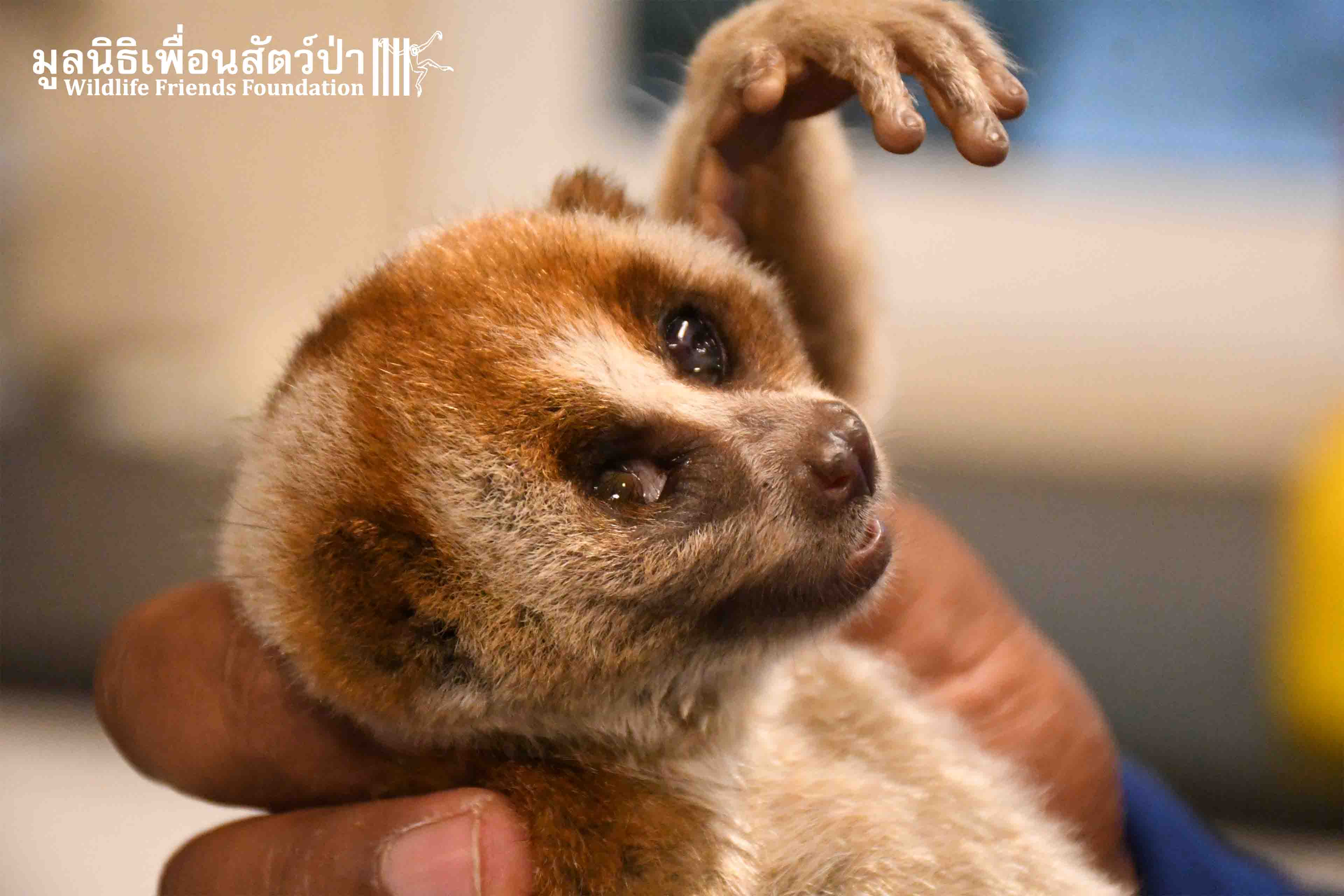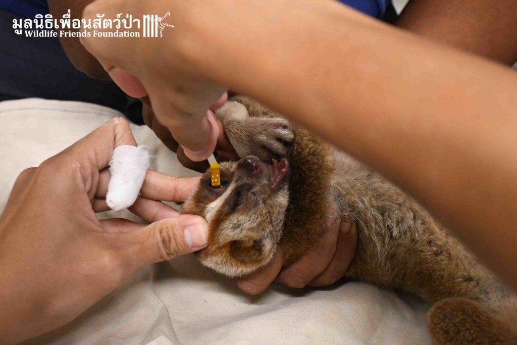 This week the WFFT Rescue Team headed to the Sawang Sanpetch Foundation, 30 minutes away from the WFFT headquarters. We had received a phone call about a wild Bengal Slow Loris that had been found seeking shelter in a building. After a medical examination, our team discovered inflammation in Mike’s eyes this might due to Insects bites.