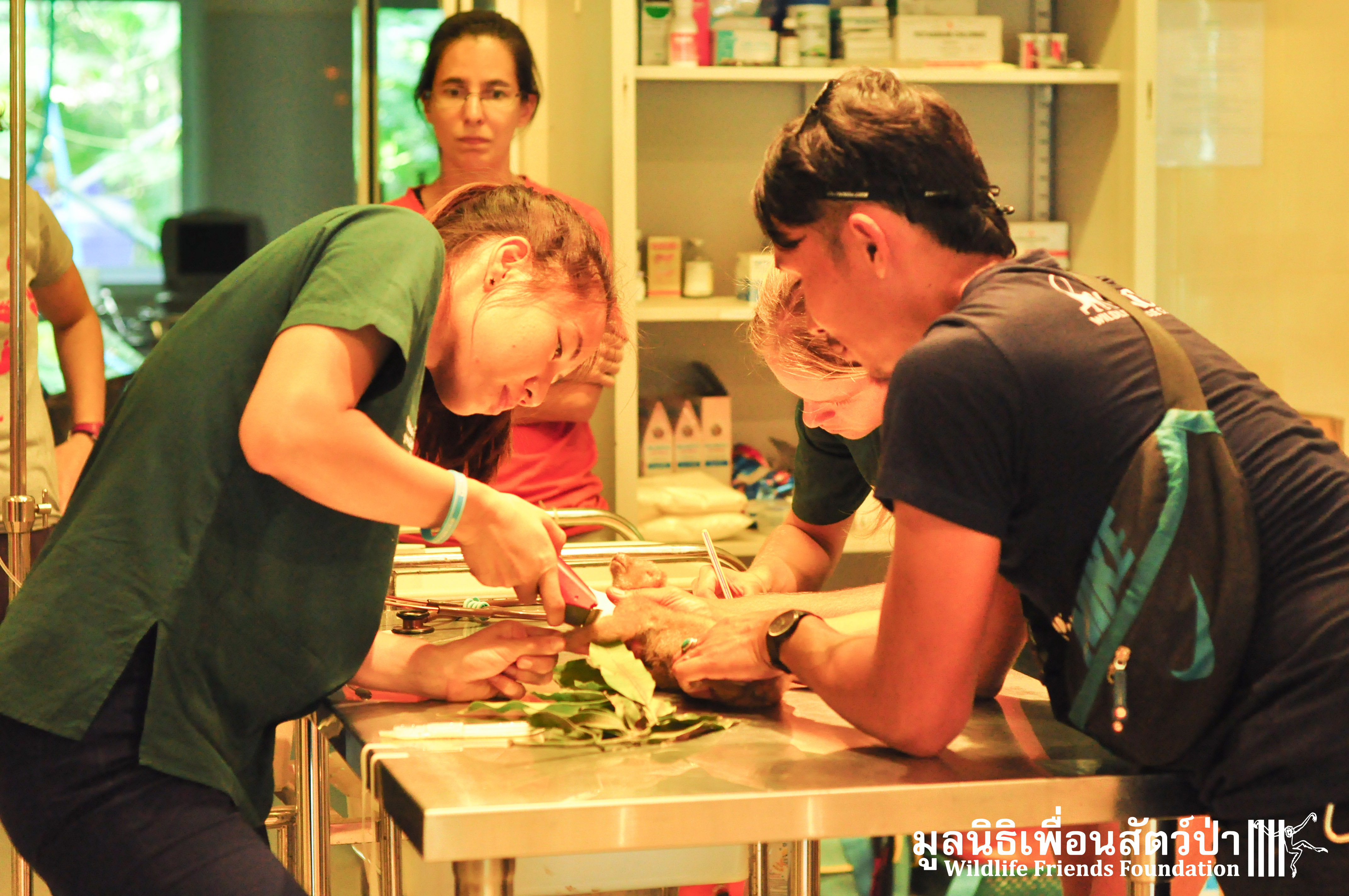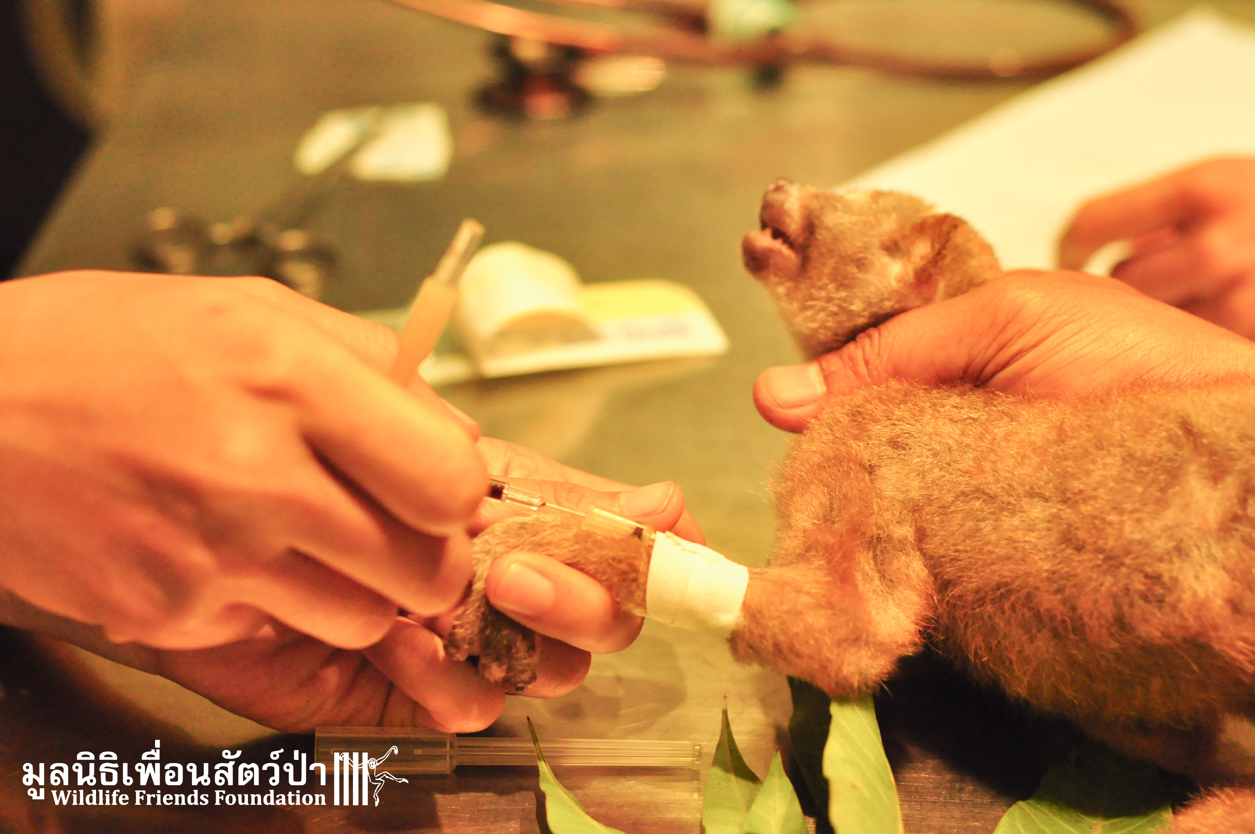 A slow loris that was rescued by Junie and her team at Lanta Animal Welfare (LAW) in Koh Lanta has been brought into the WFFT Wildlife Hospital. The loris was found weak and severely malnourished by a public road. As LAW specilize in the care of dogs and cats, not wildlife, they contacted us for assistance with rehabilitating this loris. Junie and her team made the journey up to our centre to hand over the loris. The loris is an adult female of around 6-7 years old, at the moment we are not sure as to why she was found in the state she is in, beside a road. She is eating well and is currently under close observation of our vet team.