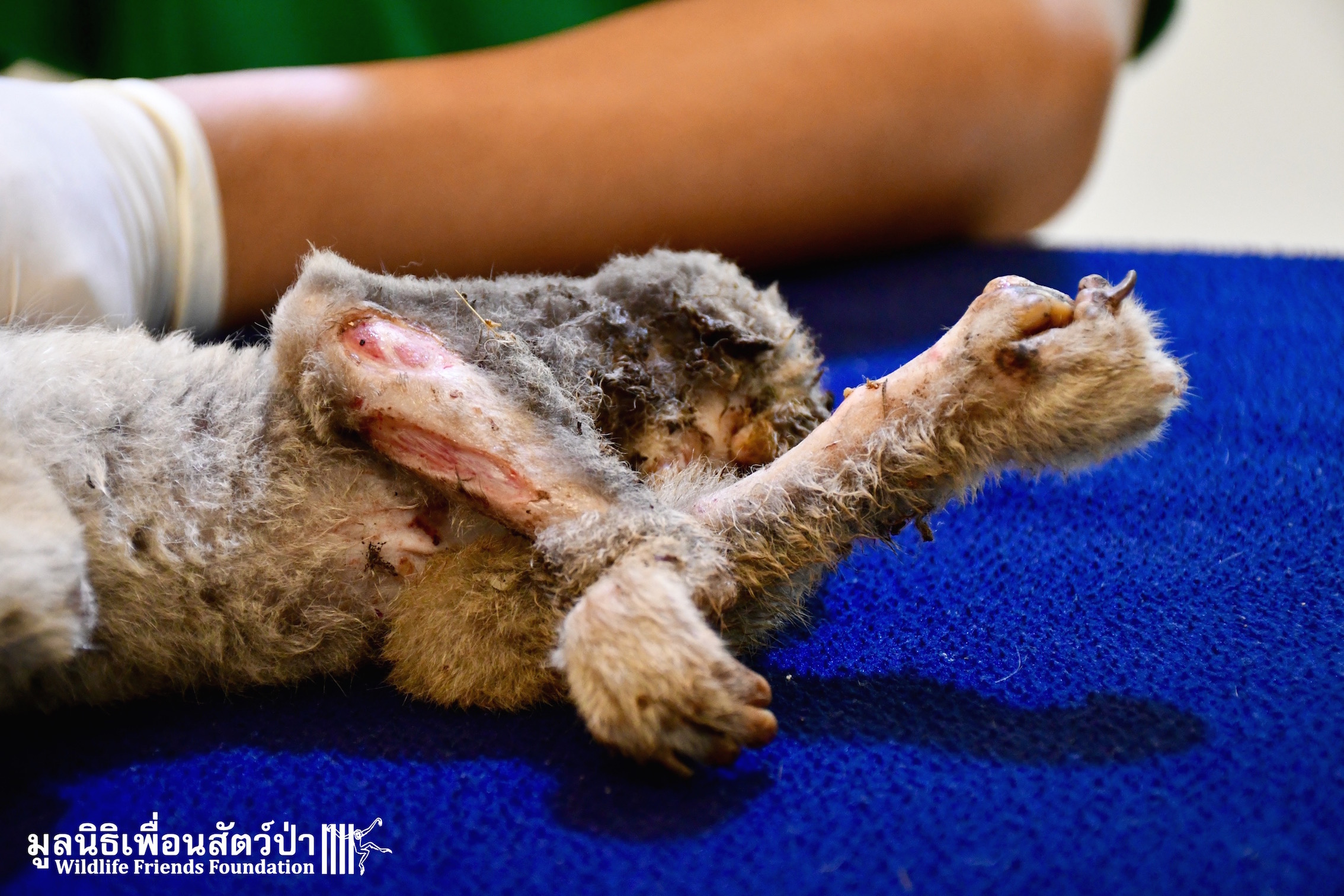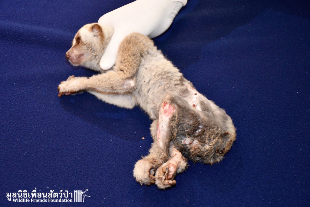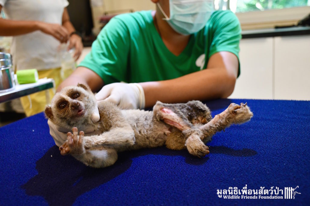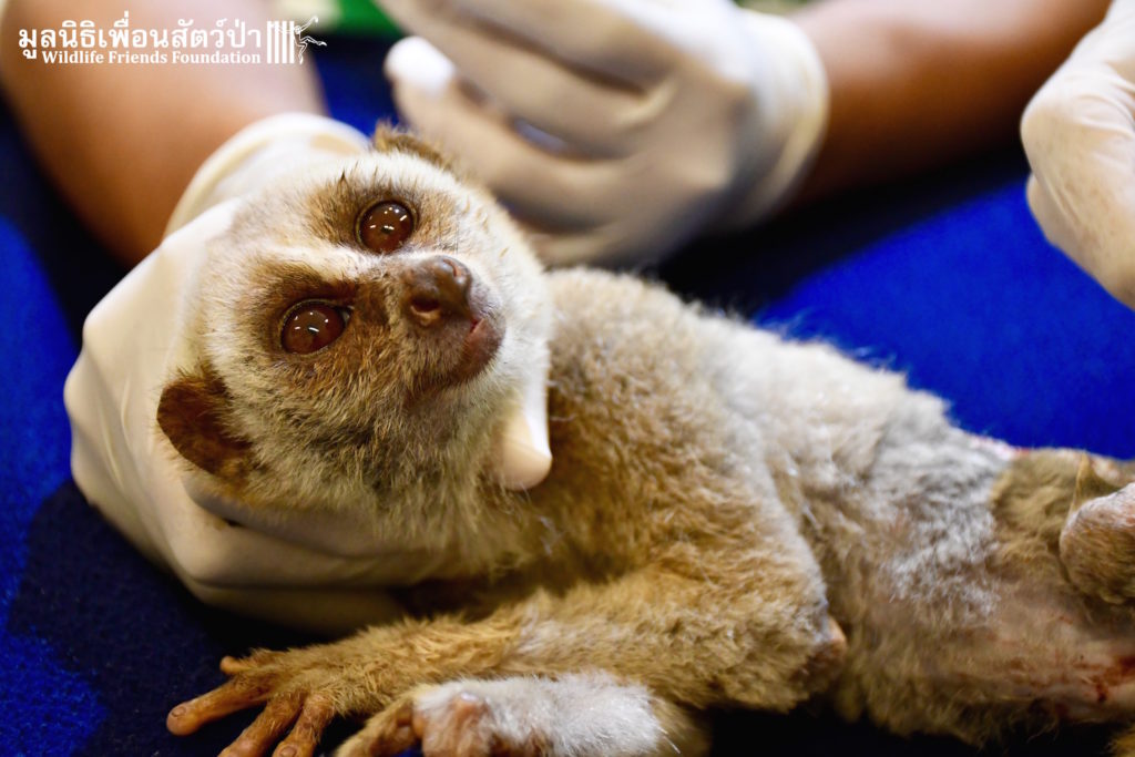 We received a telephone call from the police department in the village next to WFFT. An injured slow loris had been found inside the building seeking refuge after either sustaining burns from electrical wires or from a forest fire. The WFFT Vet Team cleaned him up and he has been recovering very well over the last few days. We are experiencing an extreme hot dry season at the moment; animals have to venture out of the forest in search of food and water. We are hoping ‘Police’, as we have named him, makes a full recovery. Once the rains have started he will be released back to a protected area and hopefully stay away from humans.