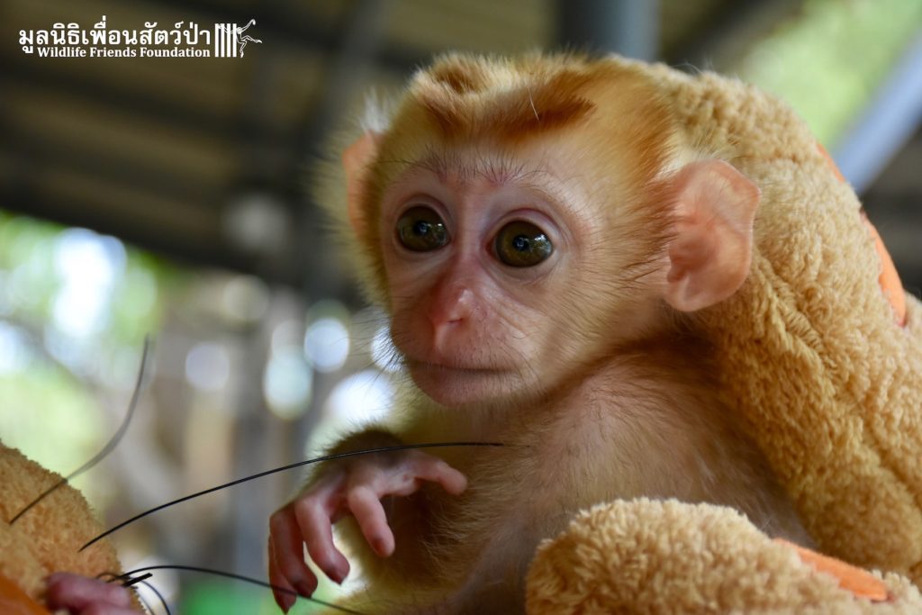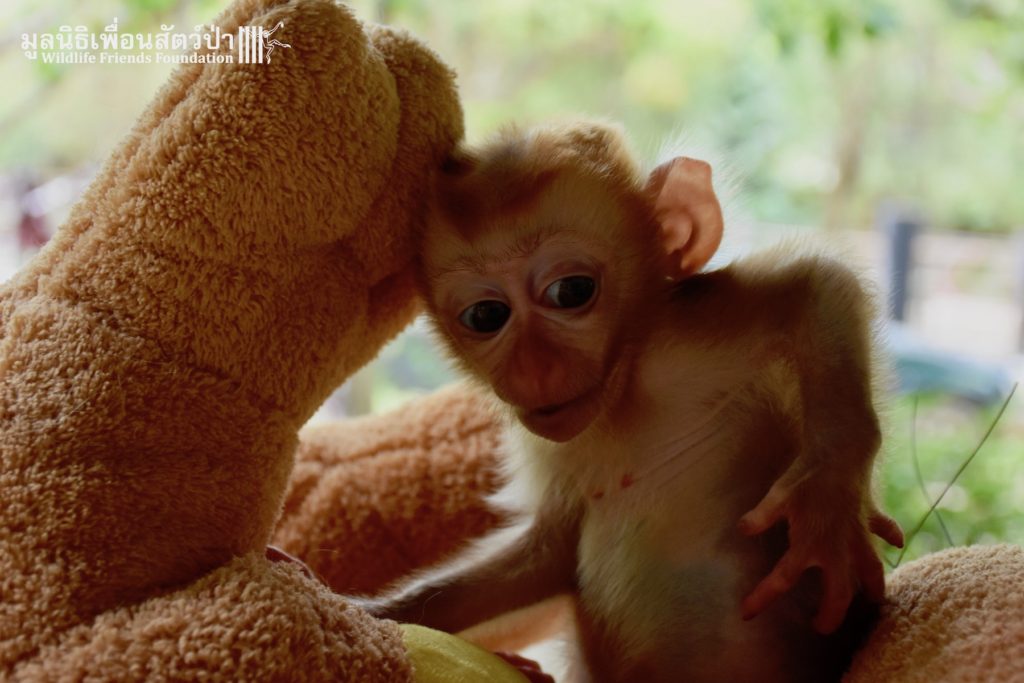 Meet ‘Mongkood’ (English: Crown) the very small infant northern pig-tailed macaque (Macaca leonina). He was rescued 2 days ago after being kept as a pet for a very short period of time. We estimate that this little one is no older than 2 months. Sadly, he will have been poached from the wild, witnessing the murder of his family and then sold on the be a pet. Luckily he was saved and brought to the WFFT Wildlife Hospital.