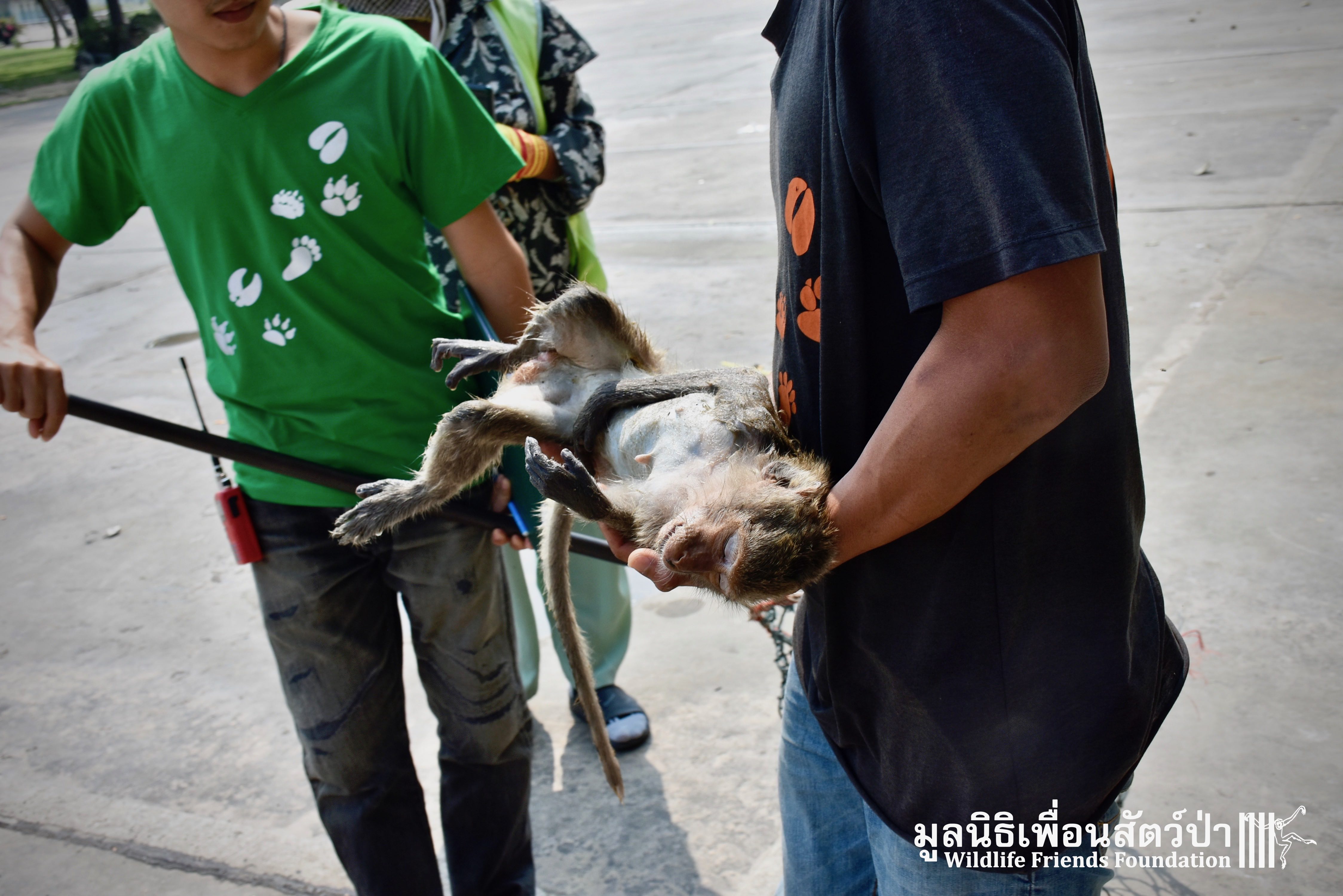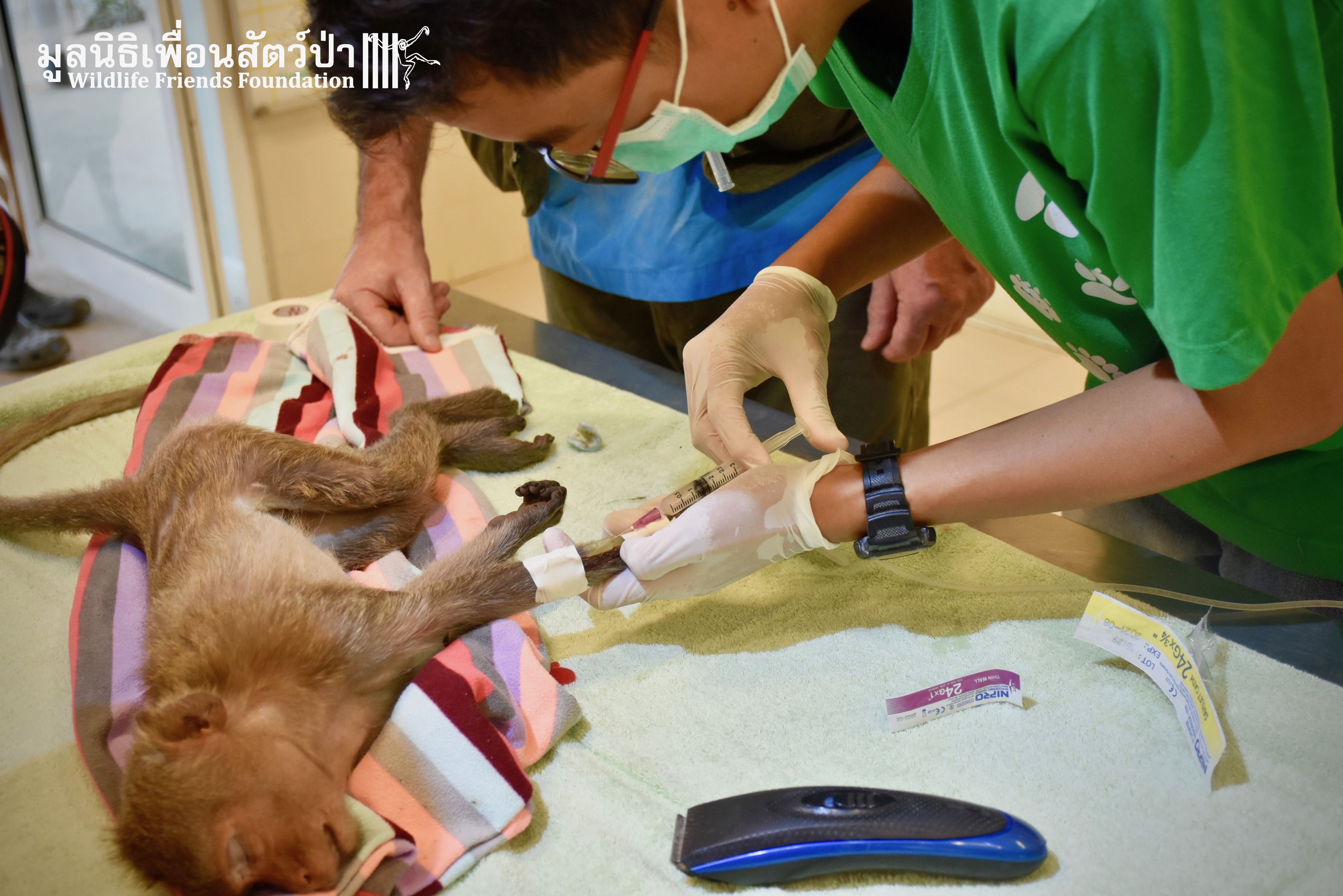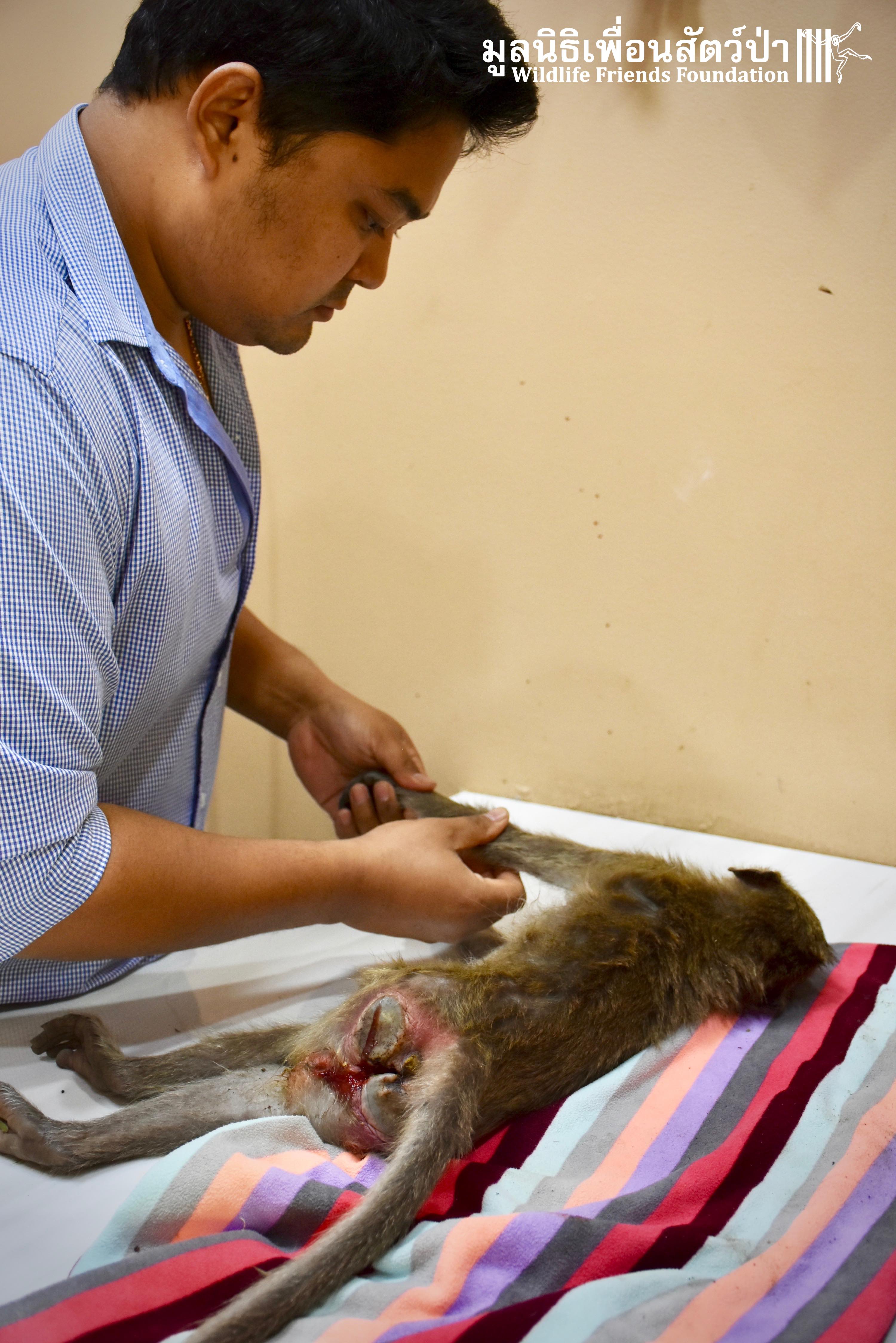 Recently the WFFT Wildlife Hospital Rescue Team were called by a local woman working at Khao Yoi Temple about a female long-tailed macaque who fell from a tree and could not move. The macaque in question had a young infant so the situation was even more urgent. When the Rescue Team arrived on site, they found a poor monkey laying in a gutter. The woman who called us and kept an eye on the injured mother macaque told us the baby was now holding onto another female that we could see walking away with the infant. She was in bad condition. Fast breathing, almost unanimated, the Vet Team decided to give her a light sedative to ensure her safety.