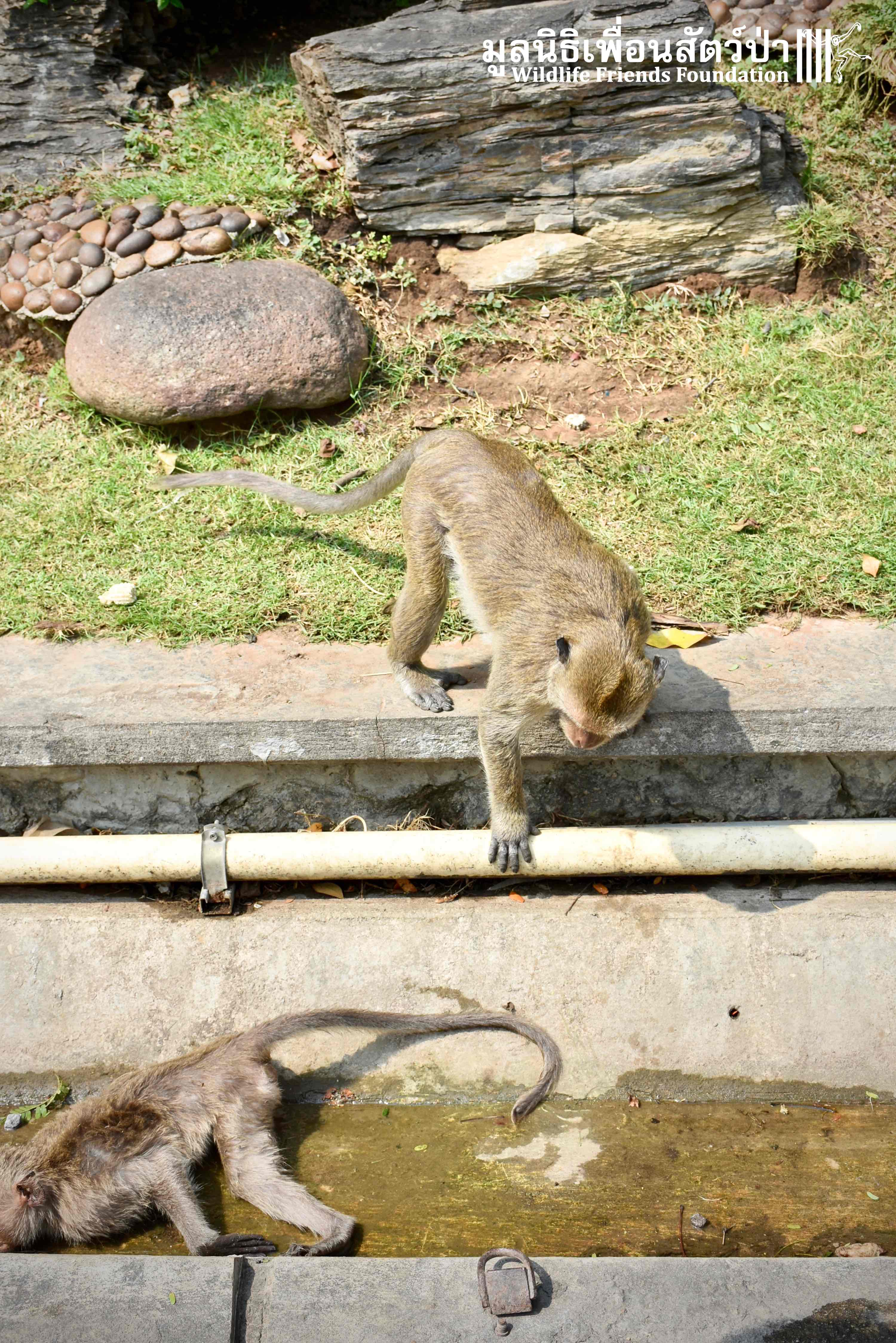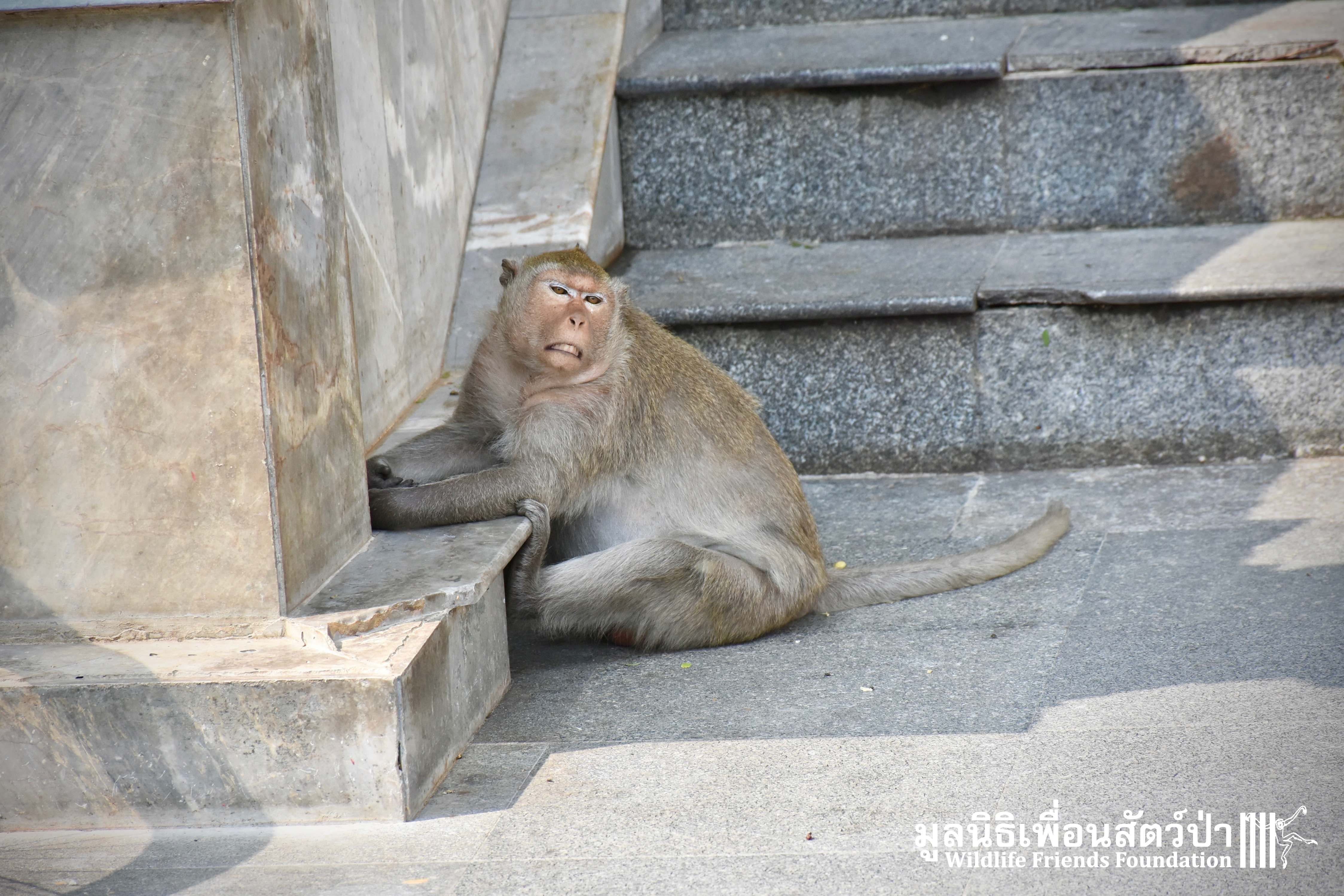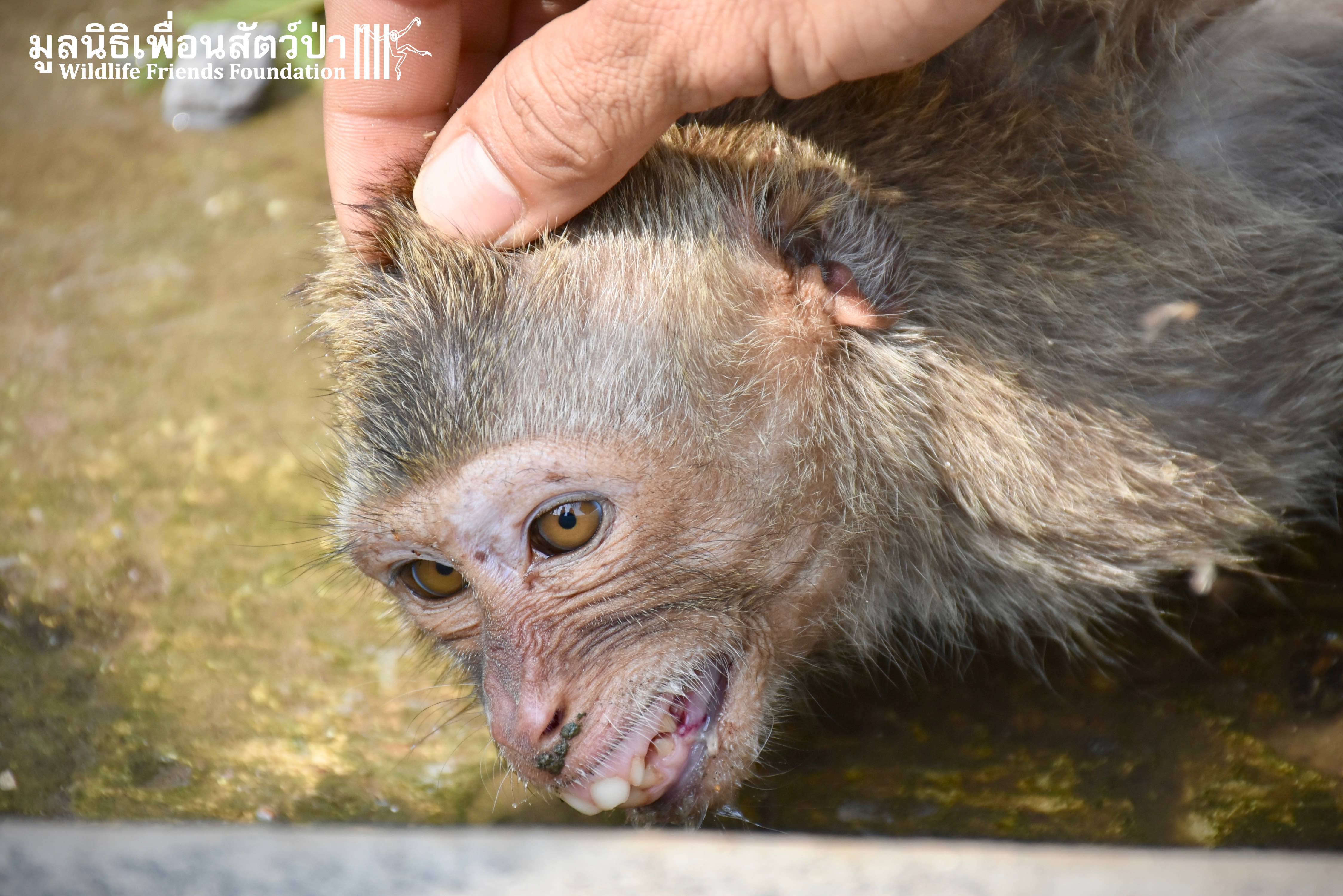 Recently the WFFT Wildlife Hospital Rescue Team were called by a local woman working at Khao Yoi Temple about a female long-tailed macaque who fell from a tree and could not move. The macaque in question had a young infant so the situation was even more urgent. When the Rescue Team arrived on site, they found a poor monkey laying in a gutter. The woman who called us and kept an eye on the injured mother macaque told us the baby was now holding onto another female that we could see walking away with the infant. She was in bad condition. Fast breathing, almost unanimated, the Vet Team decided to give her a light sedative to ensure her safety.