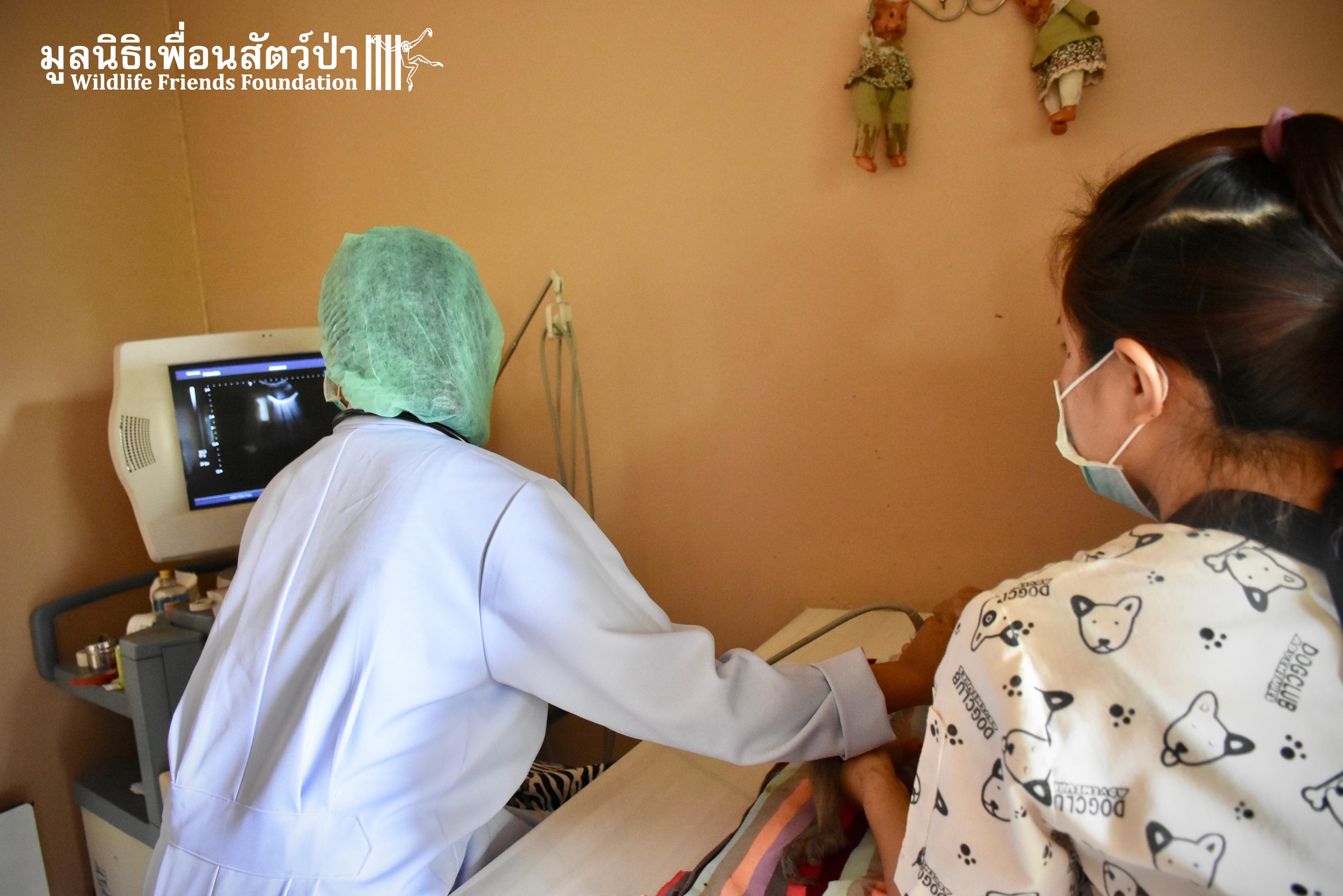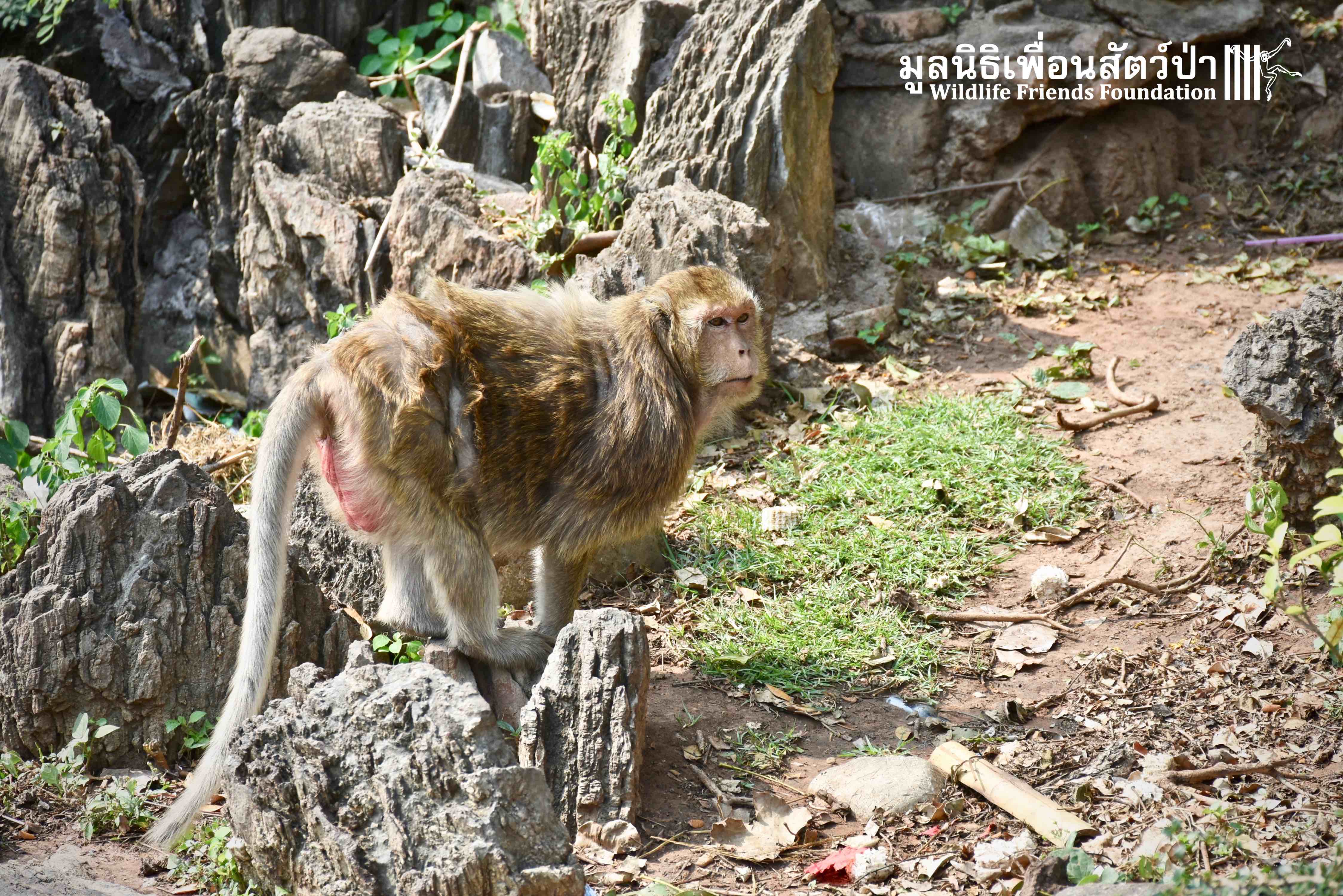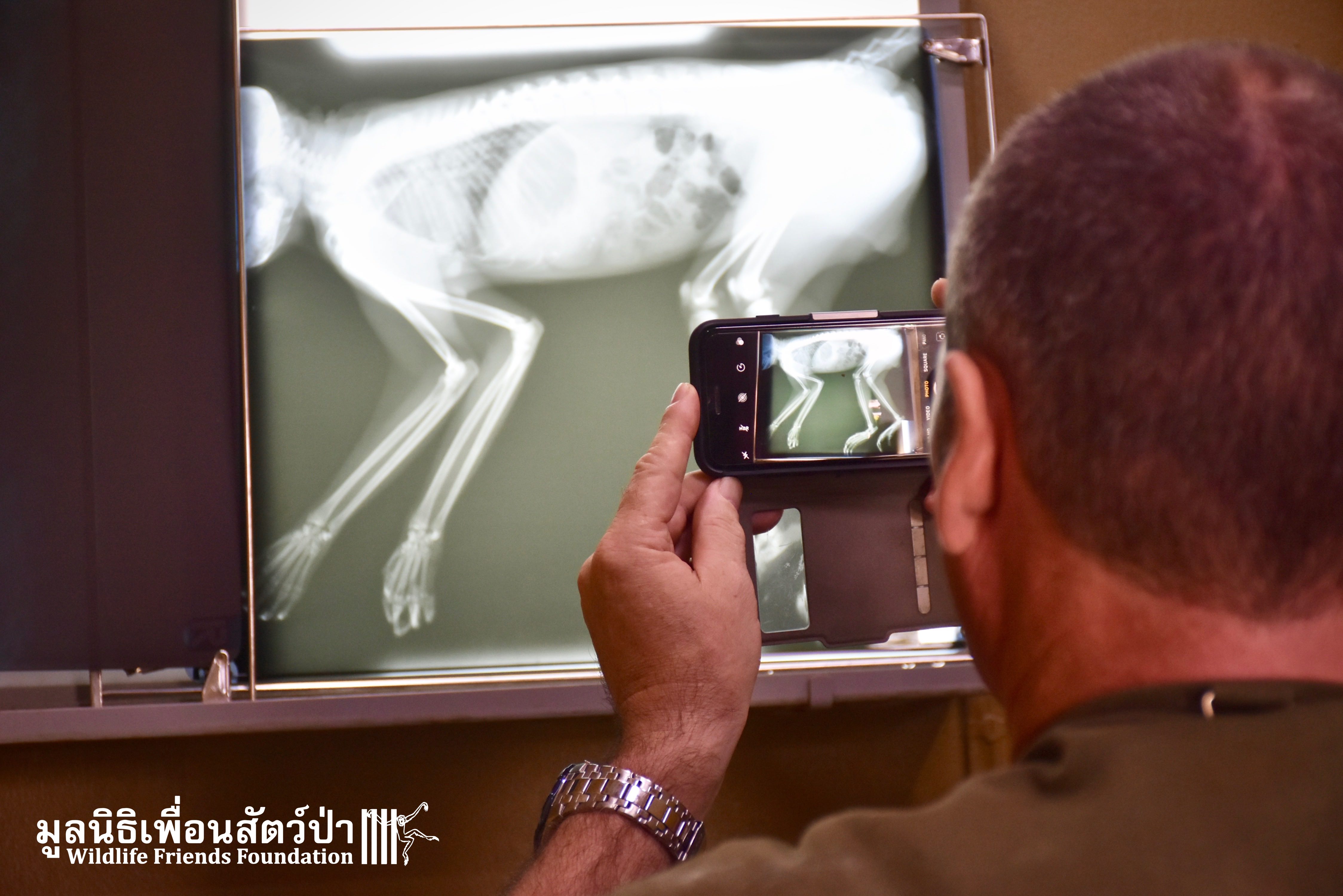 This temple is inhabited by a large population of macaques. Since the rescue team arrived they were observing the situation, many of the monkeys took an interest in what the team were doing, they needed to act fast to avoid any conflict with the concerned monkeys. Once the monkey had been transported to the rescue vehicle, the decision has been made to take her to a clinic to take on x-ray to access her further. The X-ray didn’t reveal any major broken limbs, just a small fracture on a toe but because had big secreting fluid from the anus, the vet decided to ask for further examinations.