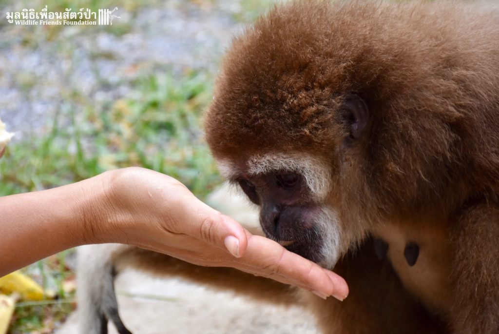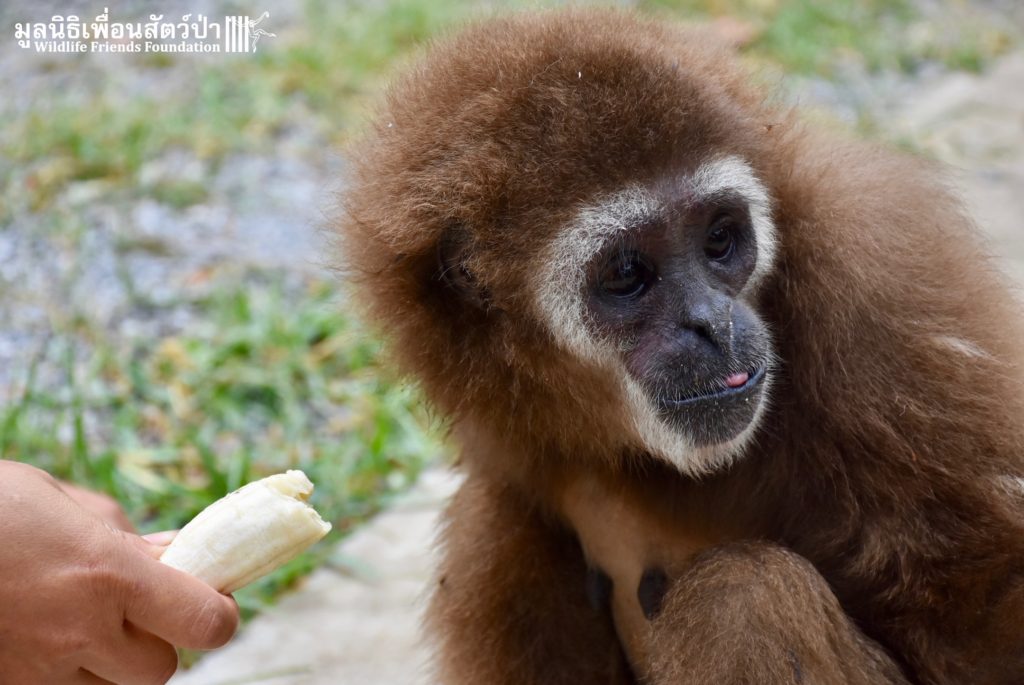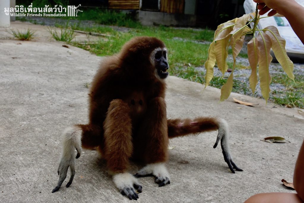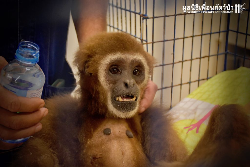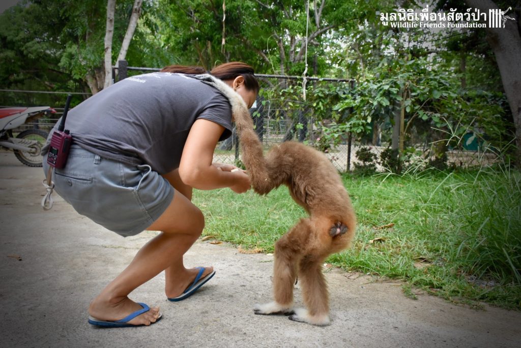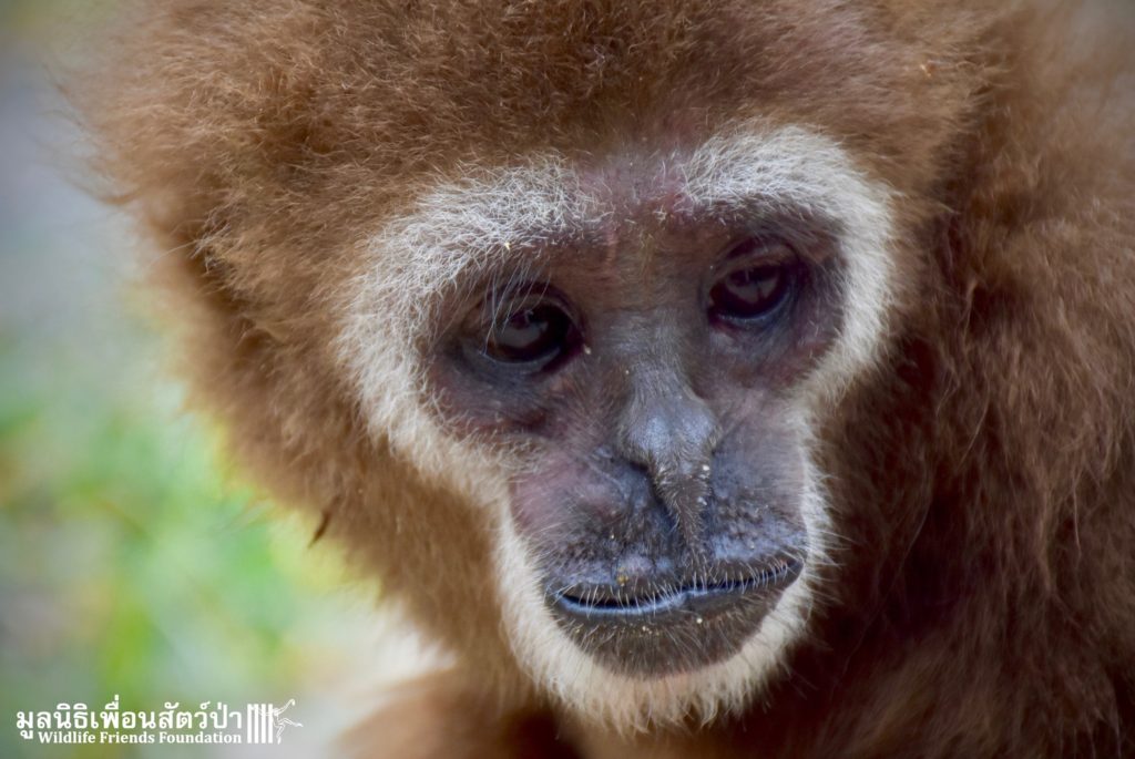 Let us introduce you to ‘Jub Jib’ the 15 year-old white-handed gibbon (Hylobates lar) who arrived at the WFFT Wildlife Rescue Centre yesterday. Just over 15 years ago Jub Jib was living with her family high in the tree canopy in Thailand’s biggest national park, Kaeng Krachan, which is part of one the biggest intact stretches of tropical evergreen forest in mainland Southeast Asia. This area creates a natural border between Thailand and Myanmar. We are told that during a battle between armed forces from Thailand and Burma her mother was shot and killed while Jub Jib was clinging onto her. Her mother fell to the ground, likely from a height 100’s of feet, as she hit the ground Jub Jib was badly injured, the impact of the fall resulted in severe head injuries, it was later found that as a result of these injuries that she suffered from epilepsy. She was handed over to a man and lady who had previously had a pet gibbon that had died, as they were deemed as suitable carers for her. Jub Jib then spent the next 15 years kept inside a house, being treated like human baby, fed human foods and was forced to wear diapers 24 hours a day to prevent from making a ‘mess’ in the house.