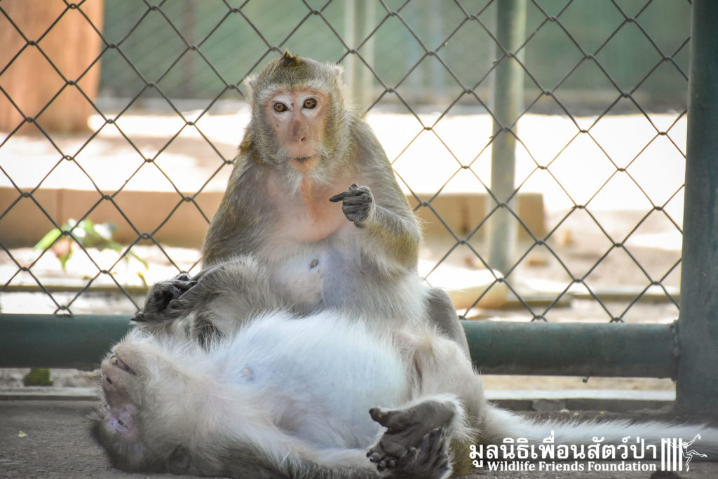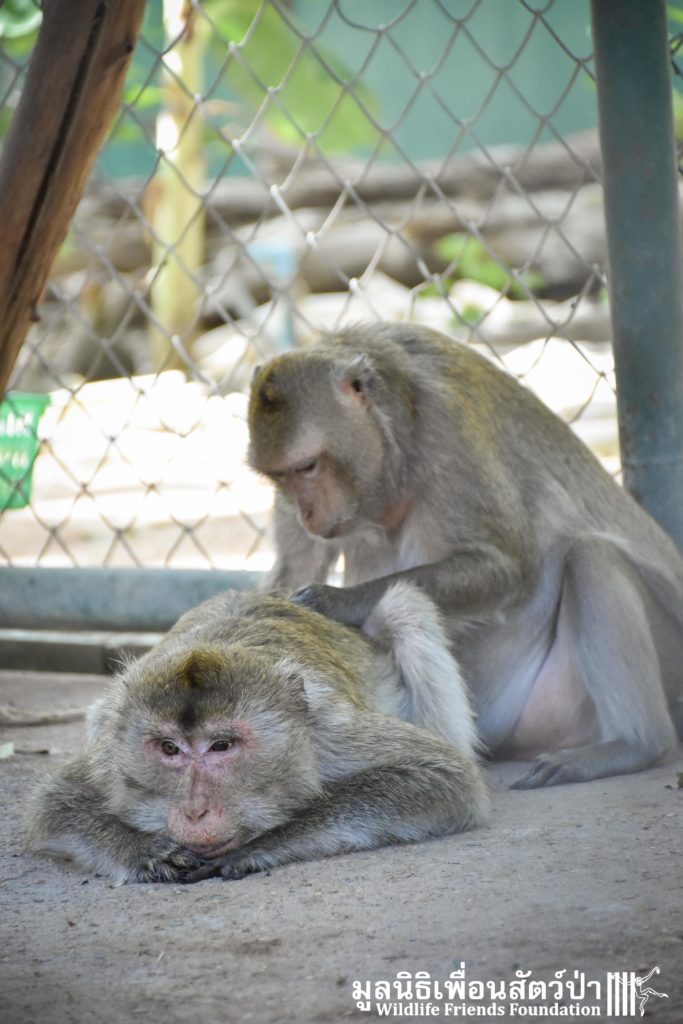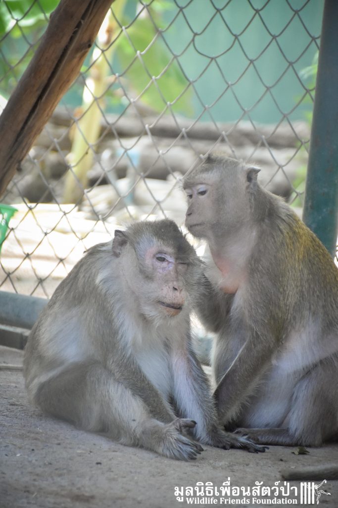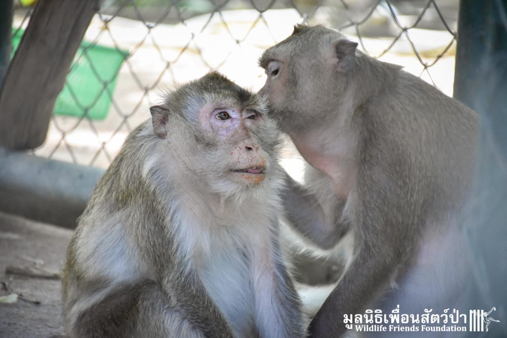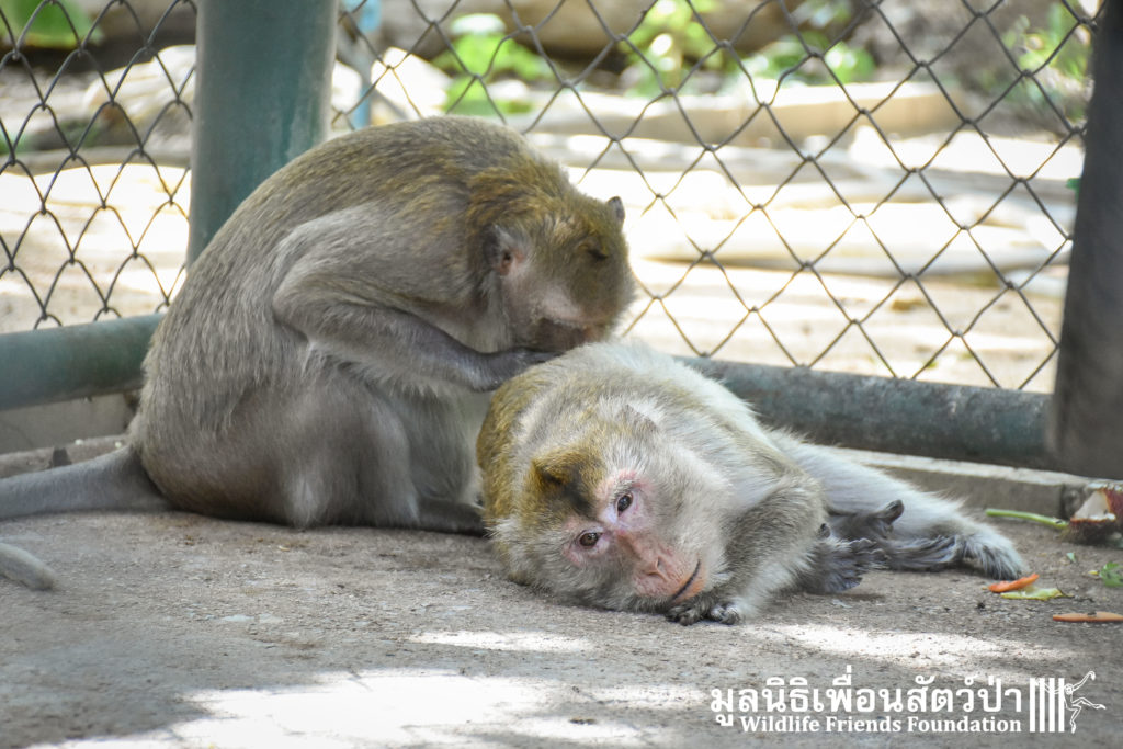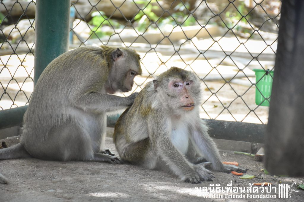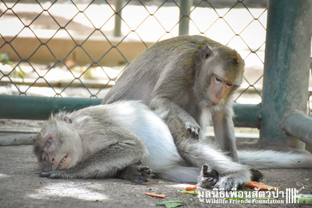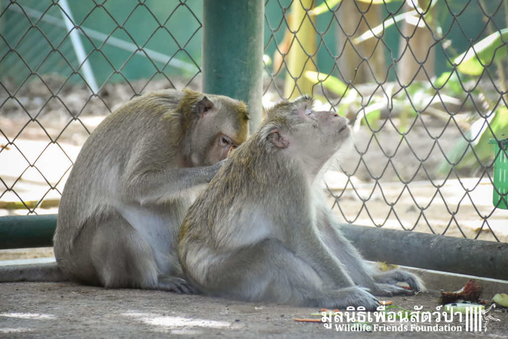 Willem was one of the first animals rescued by WFFT, he was rescued from a zoo in Bangkok. He has spent most of his years at WFFT in a large open field enclosure with many other macaques, but a few months ago he was taken ill and we brought him to the WFFT Quarantine Facility to be observed by our vet team, he soon regained strength and his health improved. Mam went through a quarantine period before being slowly introduced to Willem, first being housed in an enclosure next to him so they could get to know each other, after weeks of positive interactions we decided to allow them to have full contact by opening the door between their enclosures. They instantly became very close friends and are constantly following each other around the enclosure, grooming one another for most of the day and happily sitting down at meals times and sharing their food. Who said romance is dead in our twilight years? Mam spent 12 years in chains prior to coming to us, never seeing another macaque during this period, so to see her so happy with her new friend is vey special for us all here at WFFT. See Mams rescue story here http://bit.ly/1WBqjf0