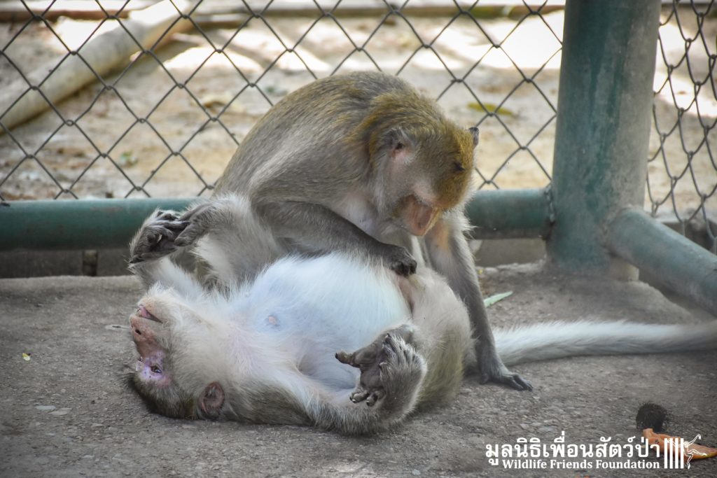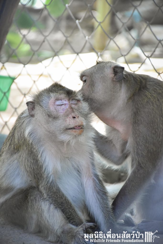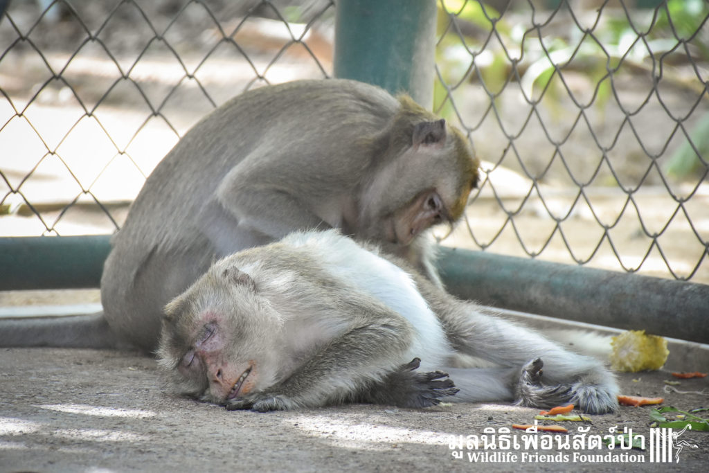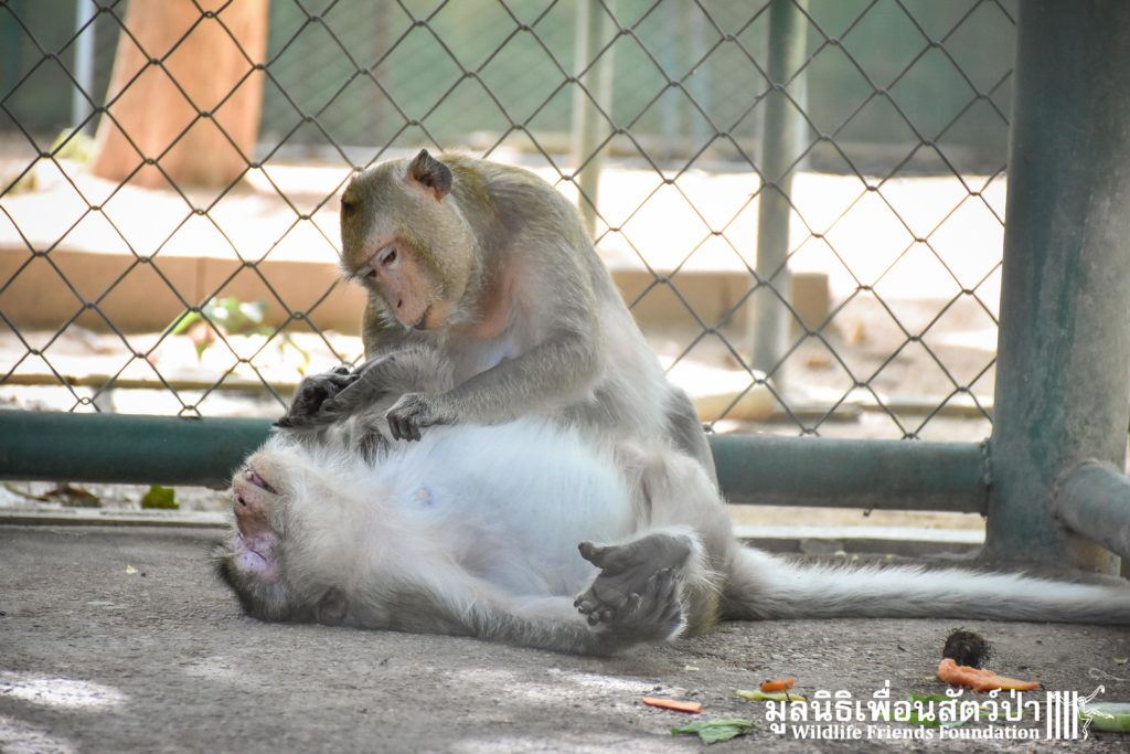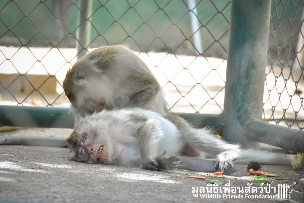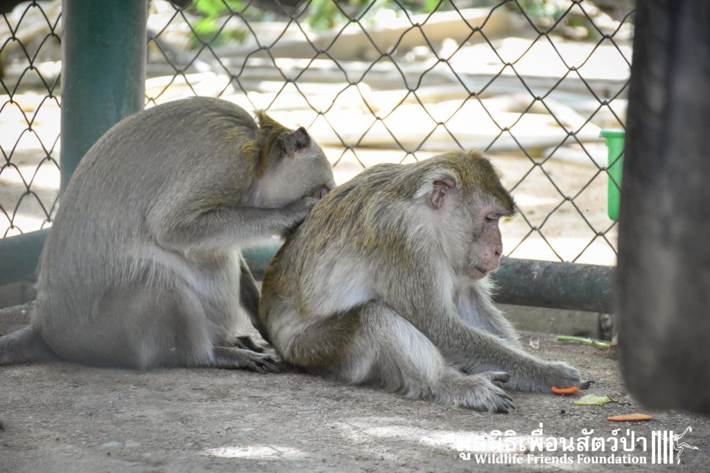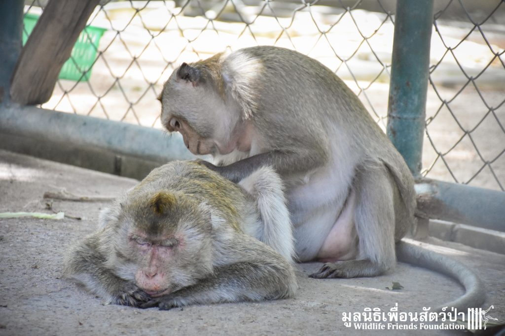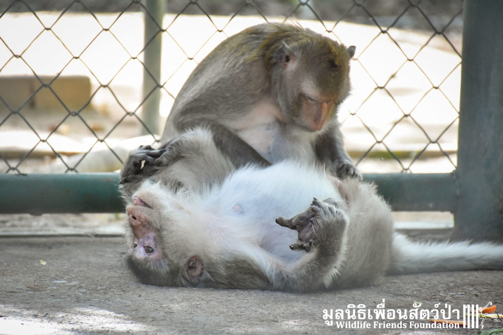 Willem was one of the first animals rescued by WFFT, he was rescued from a zoo in Bangkok. He has spent most of his years at WFFT in a large open field enclosure with many other macaques, but a few months ago he was taken ill and we brought him to the WFFT Quarantine Facility to be observed by our vet team, he soon regained strength and his health improved. Mam went through a quarantine period before being slowly introduced to Willem, first being housed in an enclosure next to him so they could get to know each other, after weeks of positive interactions we decided to allow them to have full contact by opening the door between their enclosures. They instantly became very close friends and are constantly following each other around the enclosure, grooming one another for most of the day and happily sitting down at meals times and sharing their food. Who said romance is dead in our twilight years? Mam spent 12 years in chains prior to coming to us, never seeing another macaque during this period, so to see her so happy with her new friend is vey special for us all here at WFFT. See Mams rescue story here http://bit.ly/1WBqjf0