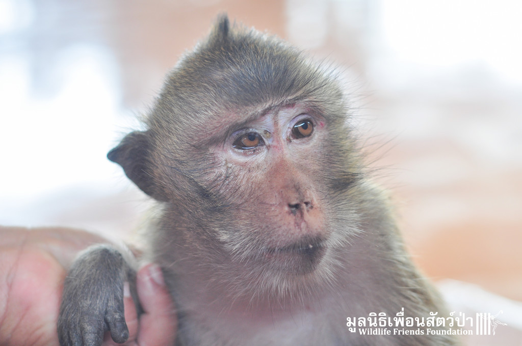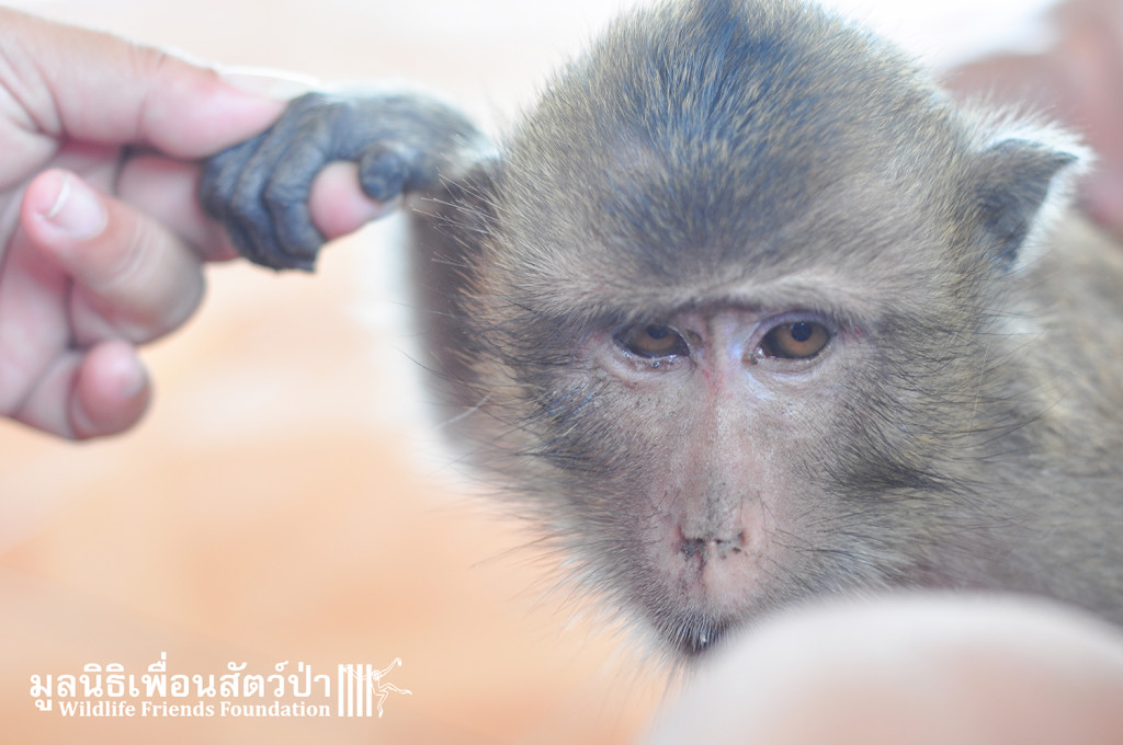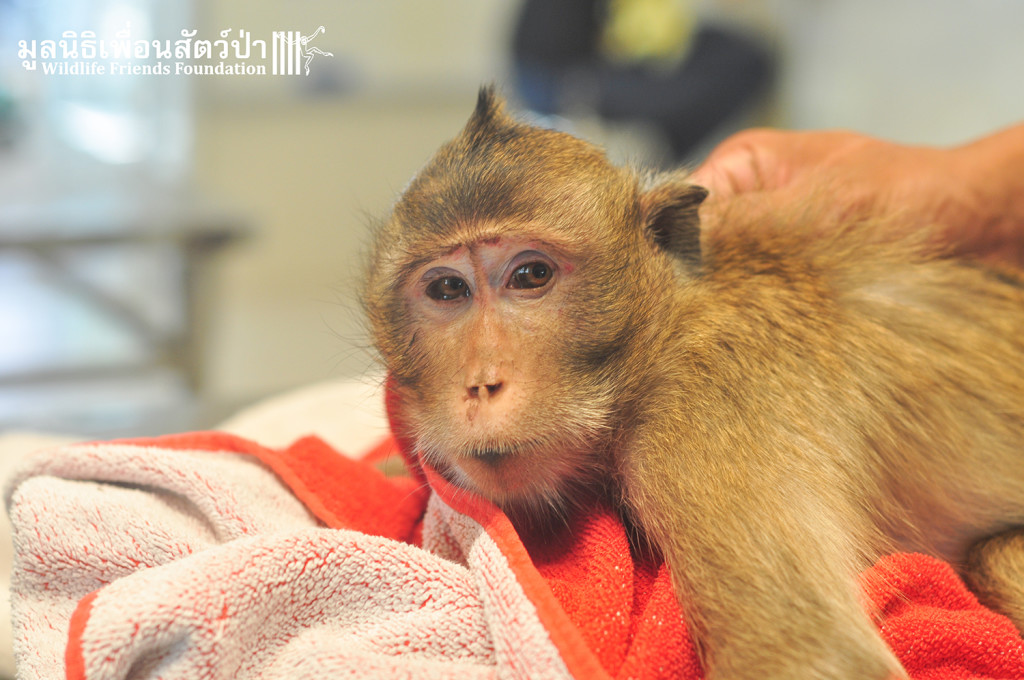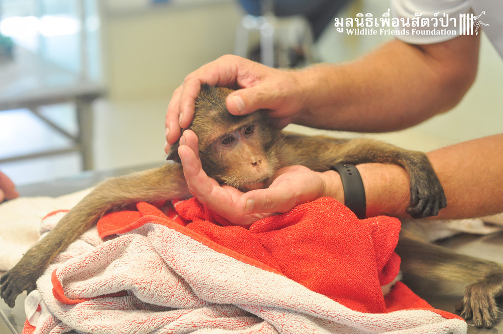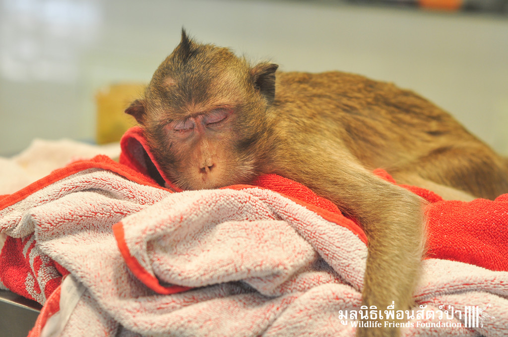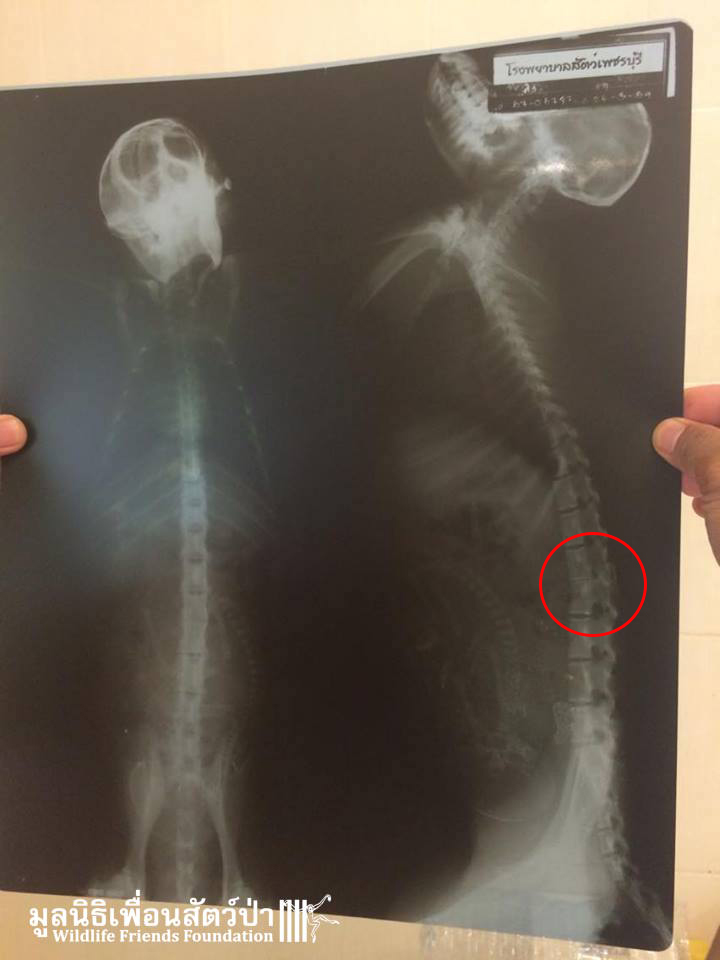 Yesterday we received a call about a seriously injured female long-tailed macaque (Macaca fascicularis) in a coastal area in Phetachburi. She had fallen from a tree into the muddy water under a mangrove forest in which she lives. A villager found her unable to breath with her face under the water and rescued her, he then took her home, washed and fed her then called us to help. Upon arrival it seems she has a deformed spine caused by an old injury and possibly some nerve damage. She was rushed to a local hospital for an x-ray; this confirmed the vet teams suspicion that she has a deformed spine, to our surprise the x-ray revealed that she is carrying a baby. She was then taken to the WFFT Wildlife Hospital for further treatment.