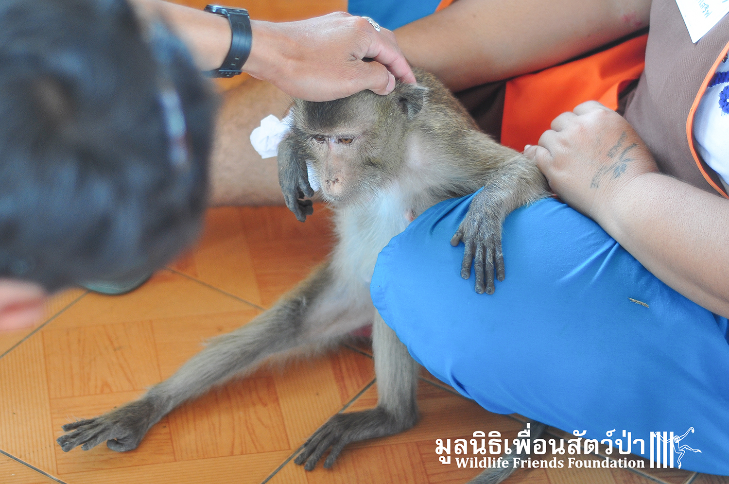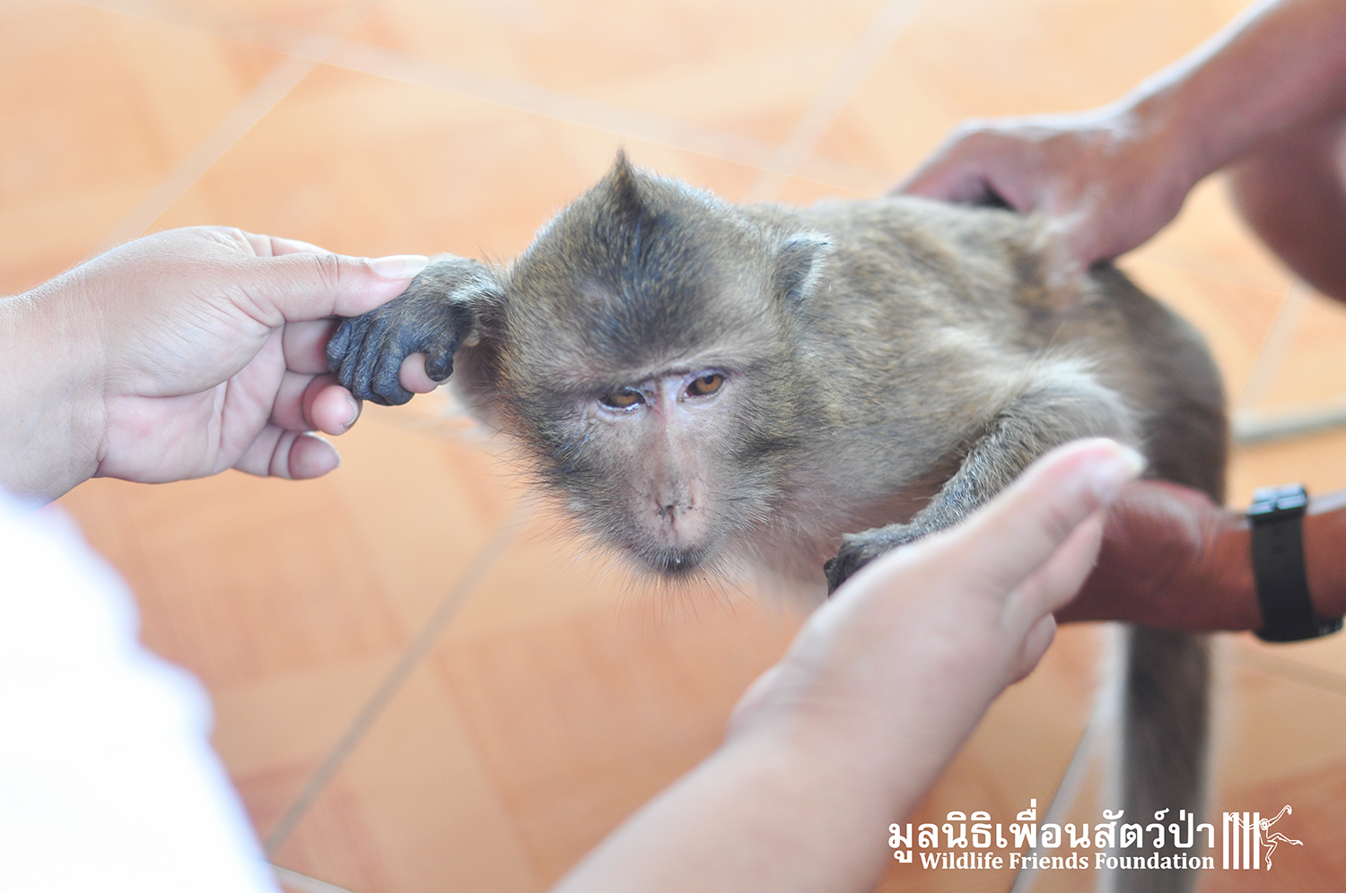 Yesterday we received a call about a seriously injured female long-tailed macaque (Macaca fascicularis) in a coastal area in Phetachburi. She had fallen from a tree into the muddy water under a mangrove forest in which she lives. A villager found her unable to breath with her face under the water and rescued her, he then took her home, washed and fed her then called us to help. Upon arrival it seems she has a deformed spine caused by an old injury and possibly some nerve damage. She was rushed to a local hospital for an x-ray; this confirmed the vet teams suspicion that she has a deformed spine, to our surprise the x-ray revealed that she is carrying a baby. She was then taken to the WFFT Wildlife Hospital for further treatment.