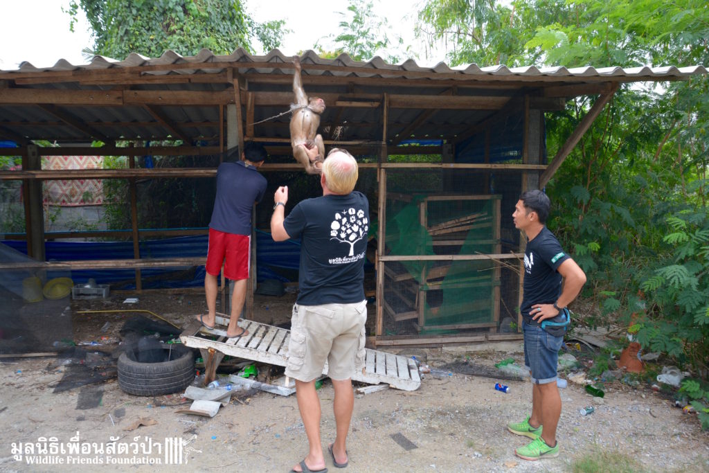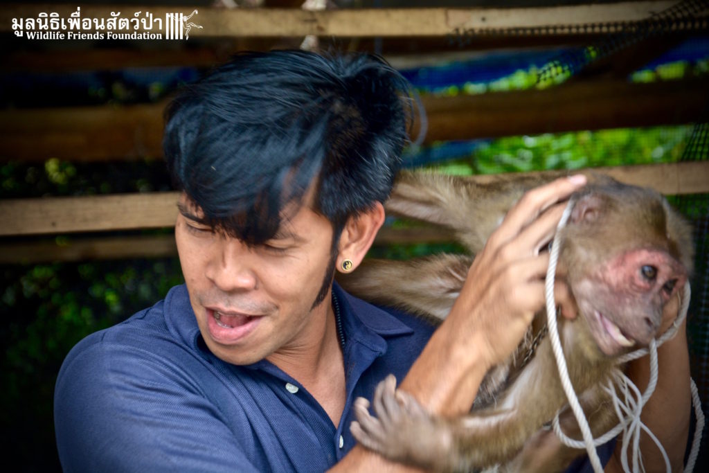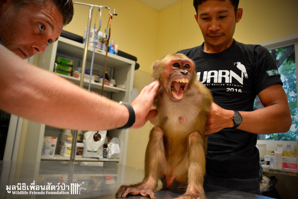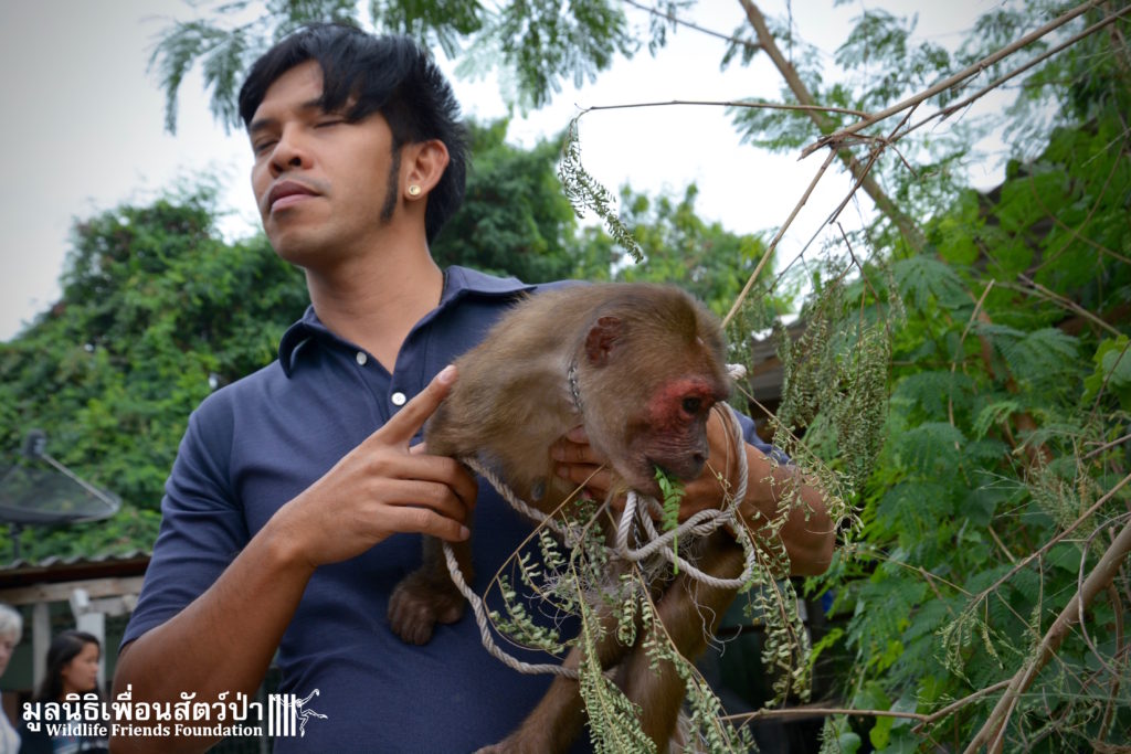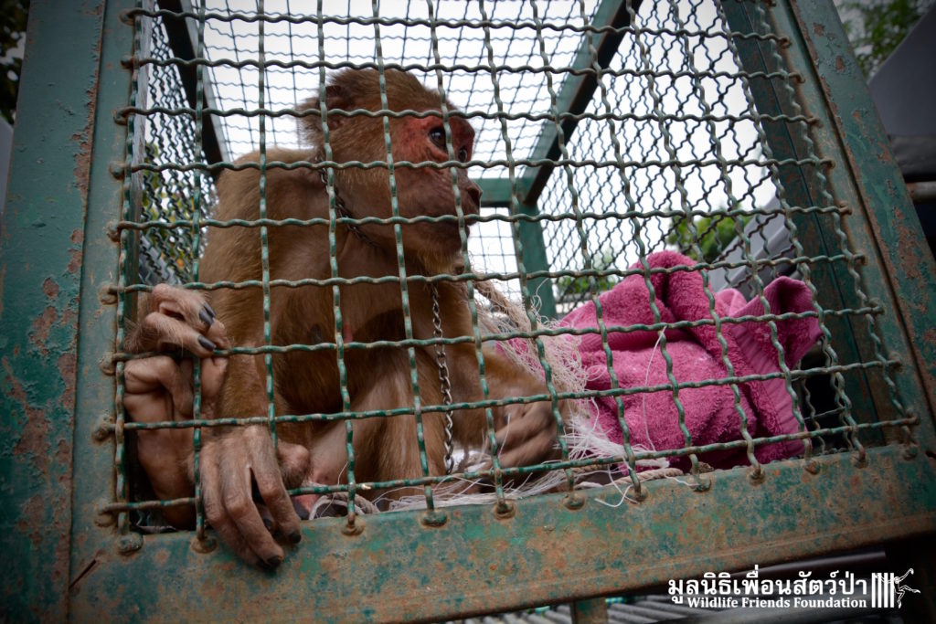 Meet ‘Yaya’ the 3-year-old stump-tailed macaque (Macaca arctoides) who was rescued a few days ago from a tourist area close to Hua Hin. Its been a long road to rescue for this special little monkey. Six months ago the WFFT Rescue Team headed out to investigate her case, after one of the WFFT Day Trip guests had reported her being held at a taxi stand outside a well know hotel in Hua Hin. The team tried to rescue her on the first visit but were up against a strong force of a locally influential owner who had the local police on his side, even though this monkey was being kept illegally. On the first visit we spoke to the owner and explained how we could care for the monkey, providing her with proper diet, vet care and an environment with other con-specifics. The owner decided that he wanted to keep her alone on a chain, dressed like a little boy, next to a busy road in a heavily populated area. The WFFT then travelled to the police headquarters of the province to seek assistance in helping this poor little girl. They again hit a wall when they were sent back to a local police box close to where the monkey was being kept, to further add to insult they were told that they were dressed inappropriately to make a complaint at the police station (long camouflage print trousers and a WFFT shirt). We then headed to the local police box to be told “We can’t help you, but we will check out the case later”. As two of the members of the team waited in the police box, another was observing the monkey from a distance. The monkey was suspiciously loaded into a car and taken away from the scene. Around an hour later her owner arrived at the police station, and seemed to be best friends with the police man who was dealing with the case, we were then told that the monkey had not been there by both her owner and the police man.