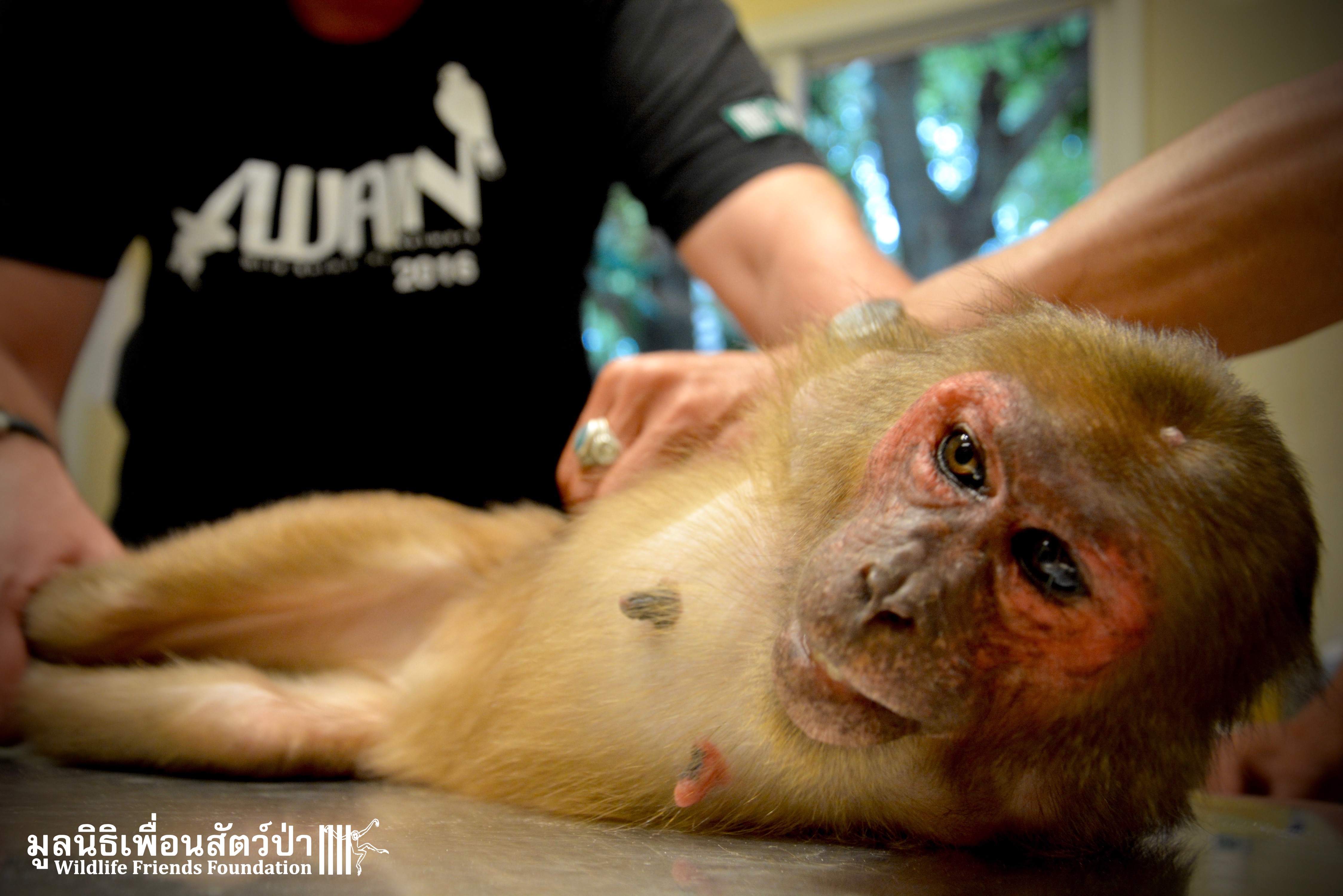 Meet ‘Yaya’ the 3-year-old stump-tailed macaque (Macaca arctoides) who was rescued a few days ago from a tourist area close to Hua Hin. Its been a long road to rescue for this special little monkey. Six months ago the WFFT Rescue Team headed out to investigate her case, after one of the WFFT Day Trip guests had reported her being held at a taxi stand outside a well know hotel in Hua Hin. The team tried to rescue her on the first visit but were up against a strong force of a locally influential owner who had the local police on his side, even though this monkey was being kept illegally. On the first visit we spoke to the owner and explained how we could care for the monkey, providing her with proper diet, vet care and an environment with other con-specifics. The owner decided that he wanted to keep her alone on a chain, dressed like a little boy, next to a busy road in a heavily populated area. The WFFT then travelled to the police headquarters of the province to seek assistance in helping this poor little girl. They again hit a wall when they were sent back to a local police box close to where the monkey was being kept, to further add to insult they were told that they were dressed inappropriately to make a complaint at the police station (long camouflage print trousers and a WFFT shirt). We then headed to the local police box to be told “We can’t help you, but we will check out the case later”. As two of the members of the team waited in the police box, another was observing the monkey from a distance. The monkey was suspiciously loaded into a car and taken away from the scene. Around an hour later her owner arrived at the police station, and seemed to be best friends with the police man who was dealing with the case, we were then told that the monkey had not been there by both her owner and the police man.