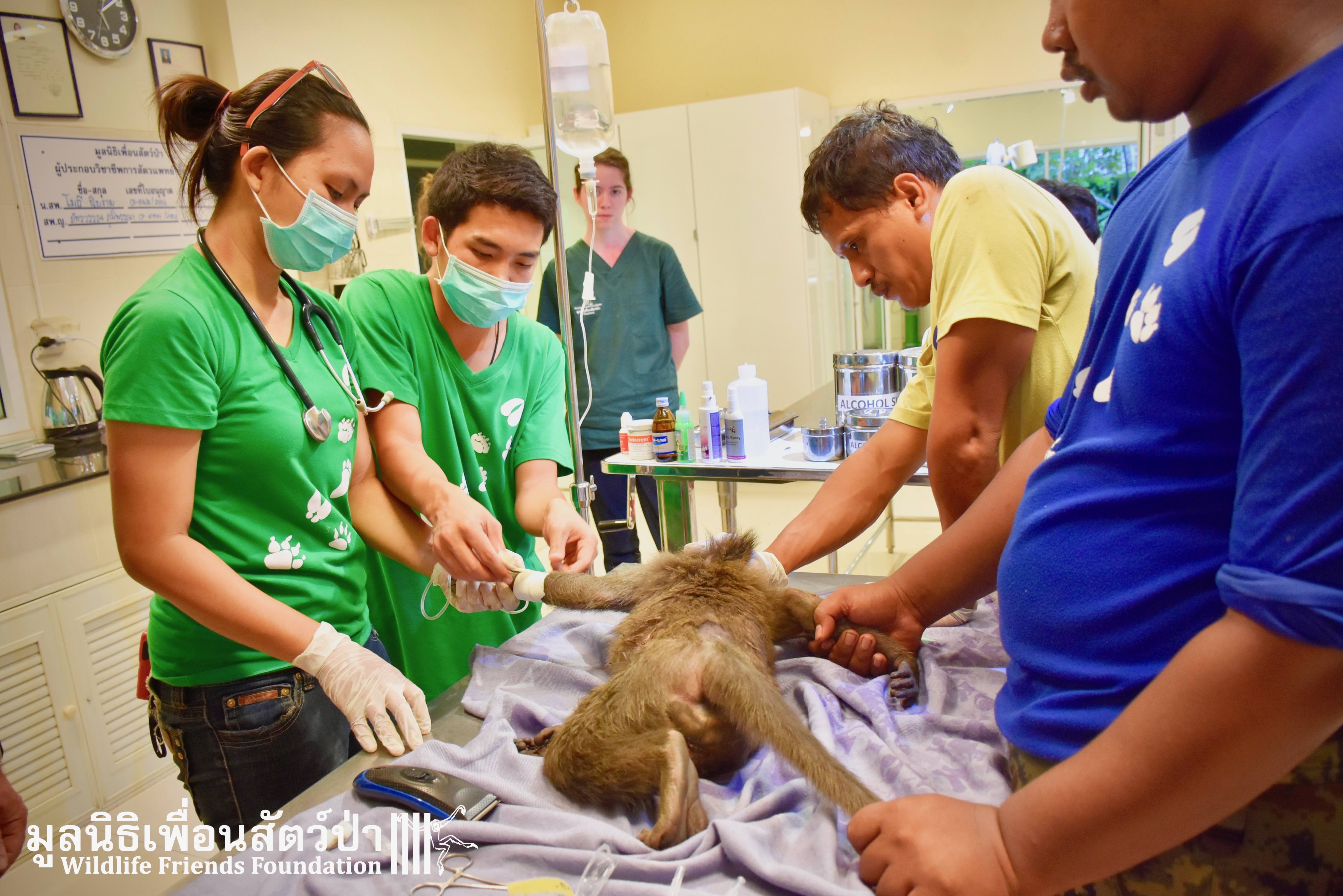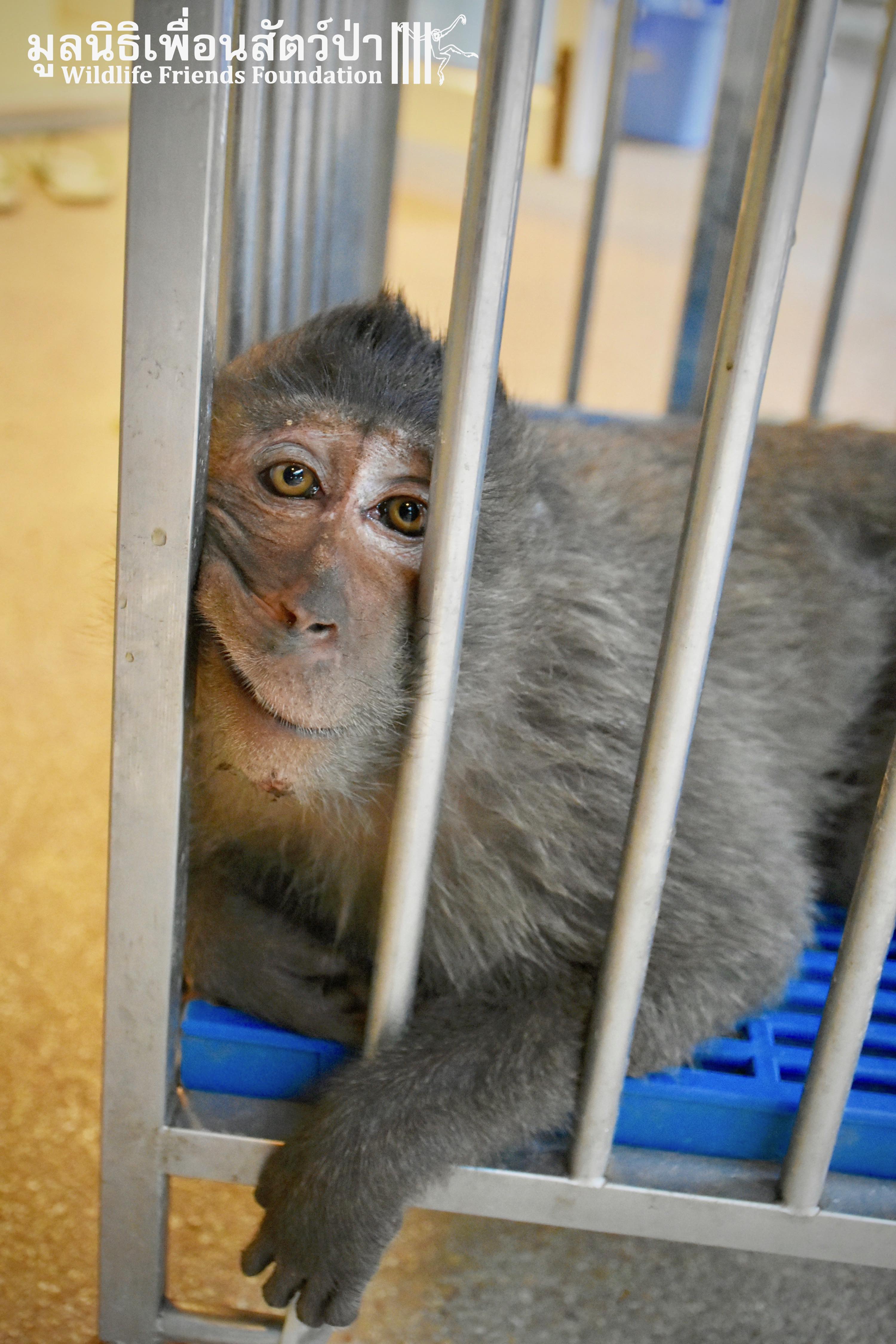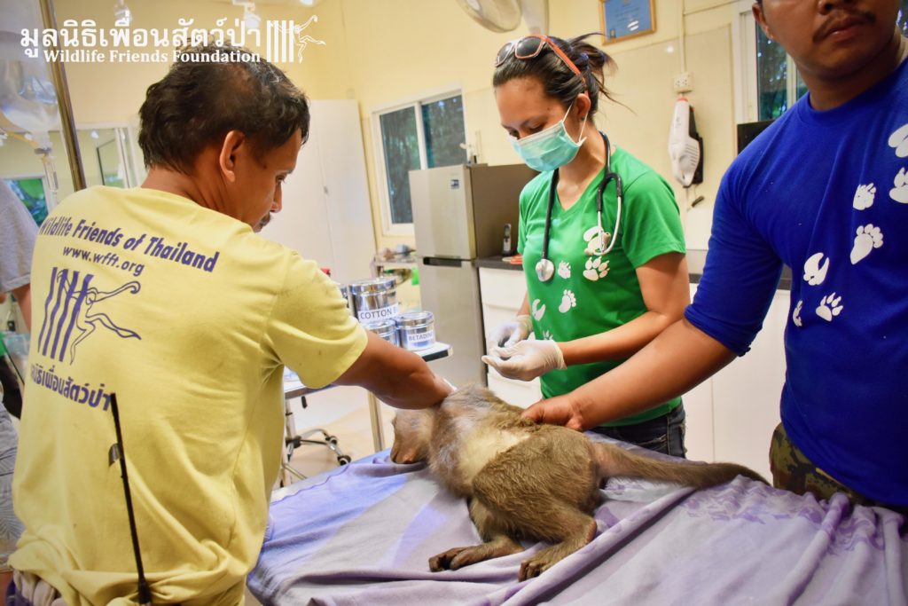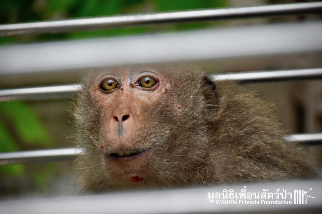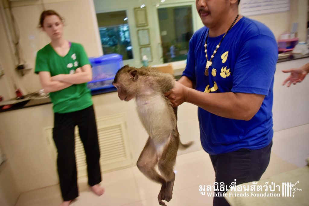 Last week we received a call for help from a team of people who help a troop of urban long-tailed macaques (Macaca fascicularis) in the city of Bangkok. They had found a sub-adult male on the floor unable to move after he had fallen from a tree. The monkey carers brought this macaque straight to the WFFT Wildlife Hospital for urgent treatment so our expert team could help him. When he arrived the team noticed wounds that had likely been caused by a fight with other monkeys or feral dogs, this could explain why he had fallen. He was also unable to use both his legs, which after treatment of his other minor injuries was the main concern. During the first day after treatment, no change his is condition was observed, but the day after that, he began to use one of his legs and began to eat well again, signs that he was recovering. To add further to his injuries a metal bullet was found in his arm, a small incision was made by the WFFT Vet team and the bullet was removed. After a few days this little man had made a miraculous recovery so we called his rescuers and they returned to WFFT to collect him and take him home back to his troop. Run free little guy, and try to avoid trouble in the future.