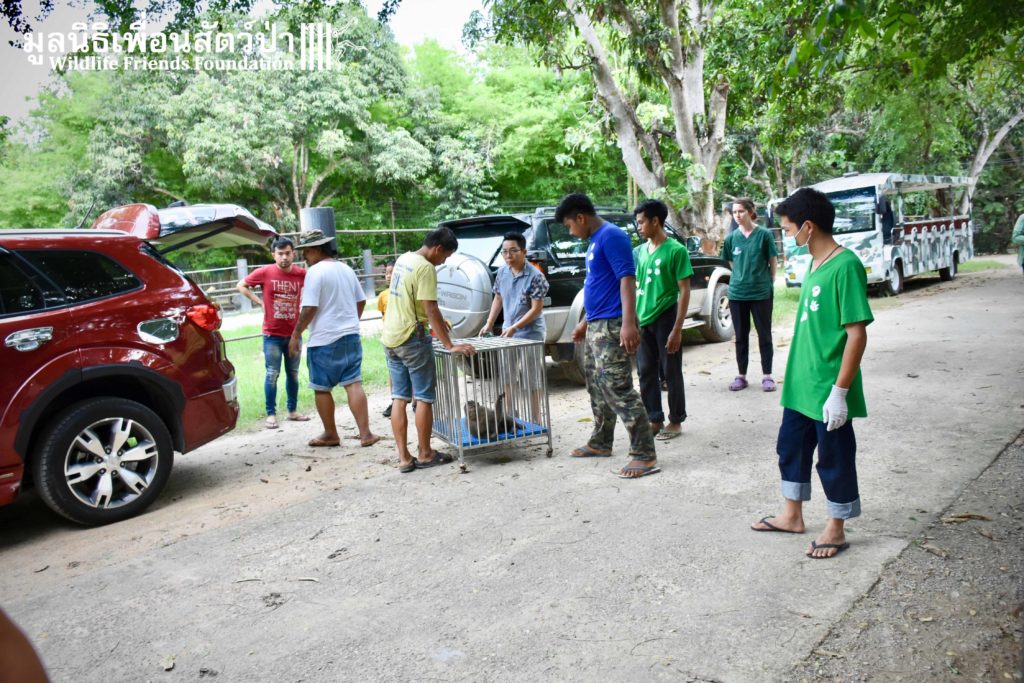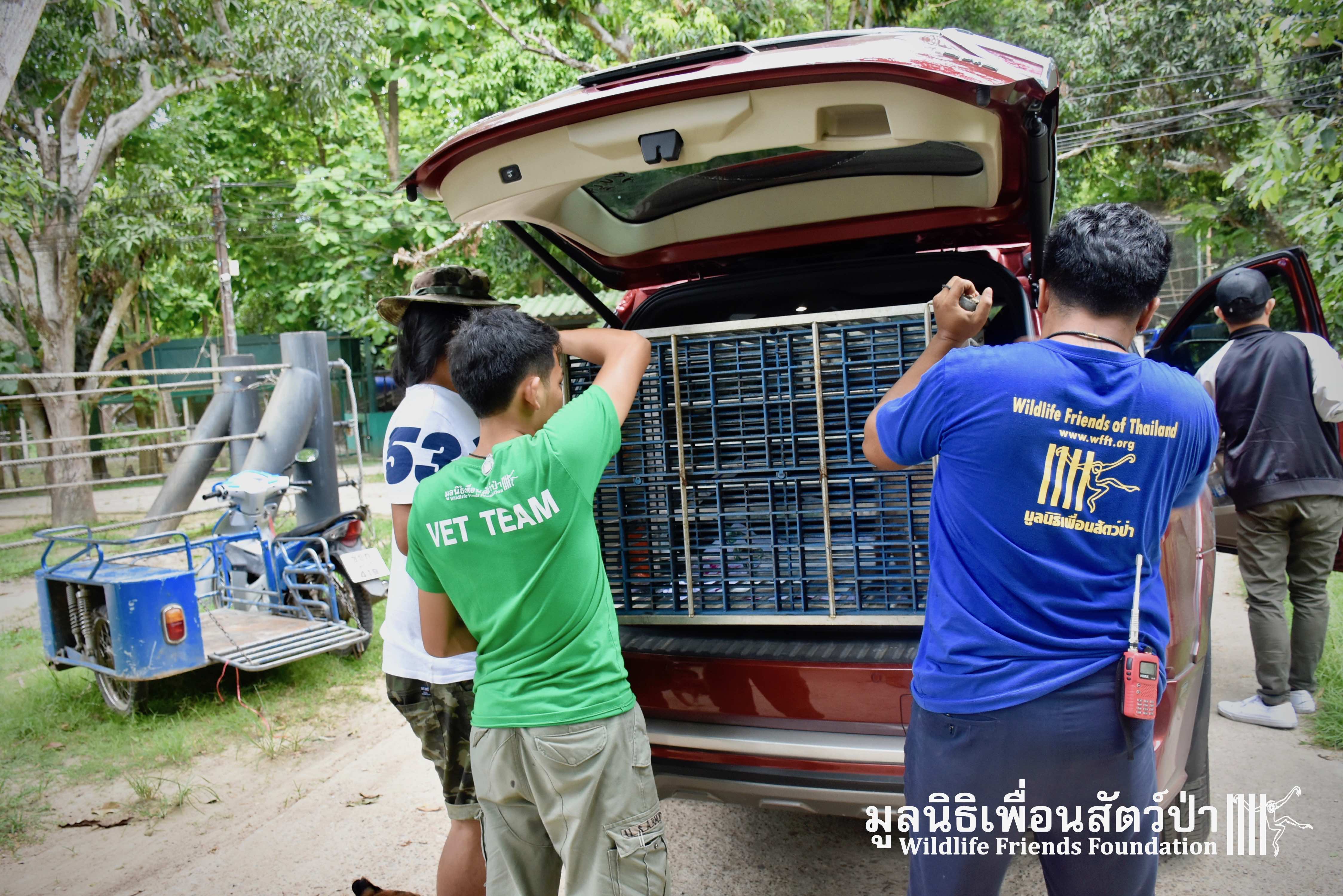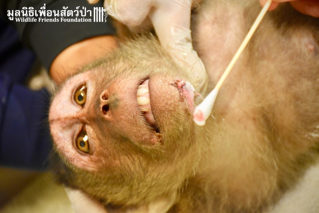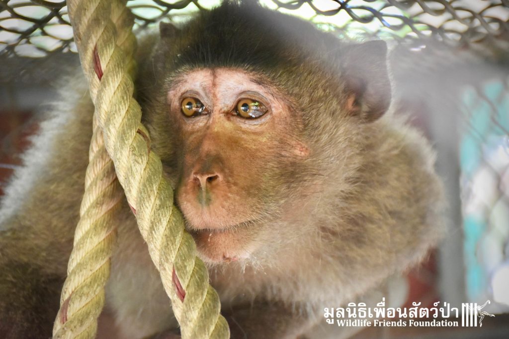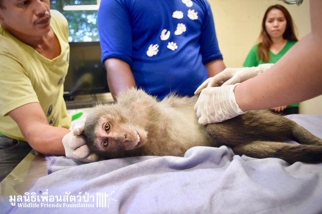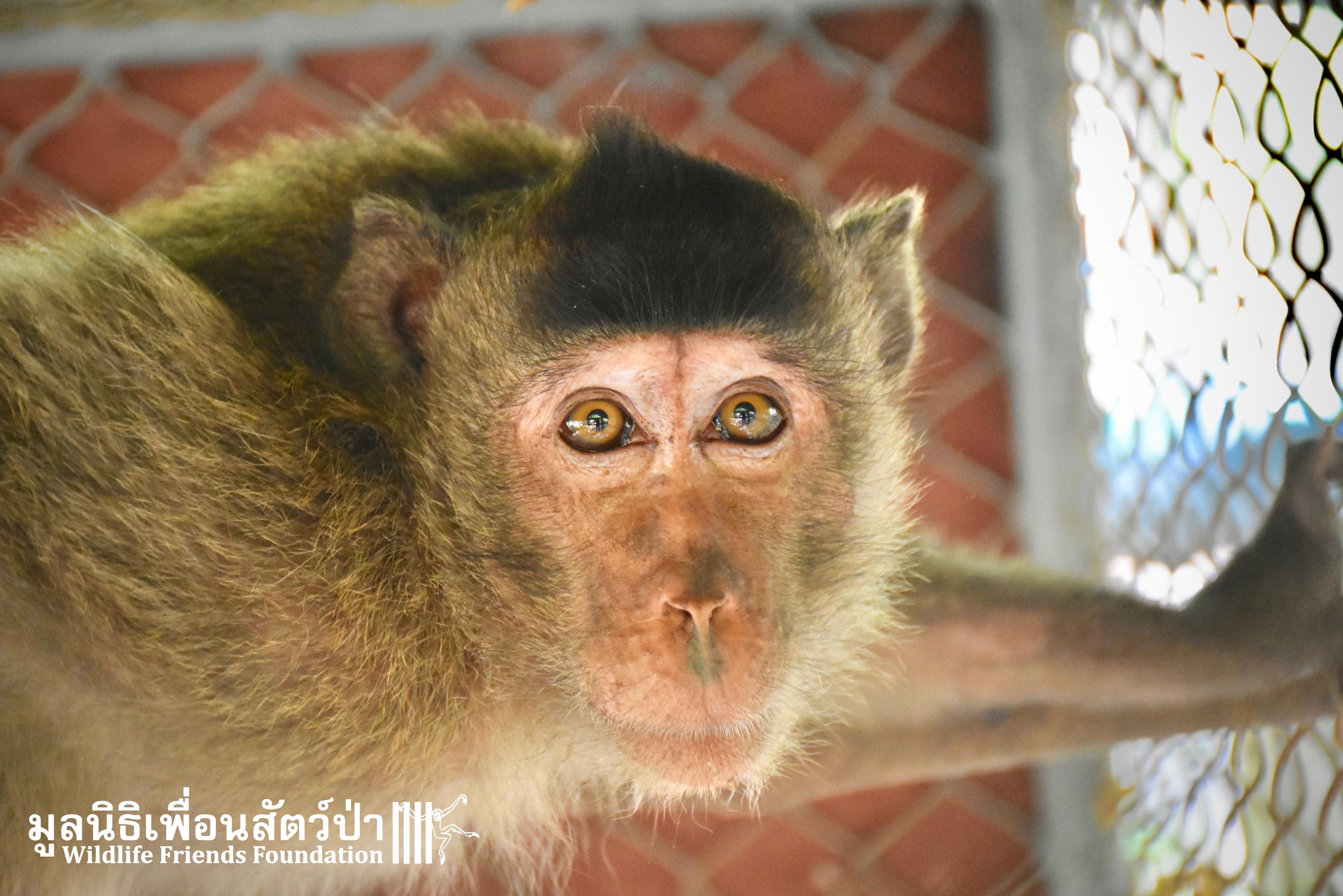 Last week we received a call for help from a team of people who help a troop of urban long-tailed macaques (Macaca fascicularis) in the city of Bangkok. They had found a sub-adult male on the floor unable to move after he had fallen from a tree. The monkey carers brought this macaque straight to the WFFT Wildlife Hospital for urgent treatment so our expert team could help him. When he arrived the team noticed wounds that had likely been caused by a fight with other monkeys or feral dogs, this could explain why he had fallen. He was also unable to use both his legs, which after treatment of his other minor injuries was the main concern. During the first day after treatment, no change his is condition was observed, but the day after that, he began to use one of his legs and began to eat well again, signs that he was recovering. To add further to his injuries a metal bullet was found in his arm, a small incision was made by the WFFT Vet team and the bullet was removed. After a few days this little man had made a miraculous recovery so we called his rescuers and they returned to WFFT to collect him and take him home back to his troop. Run free little guy, and try to avoid trouble in the future.