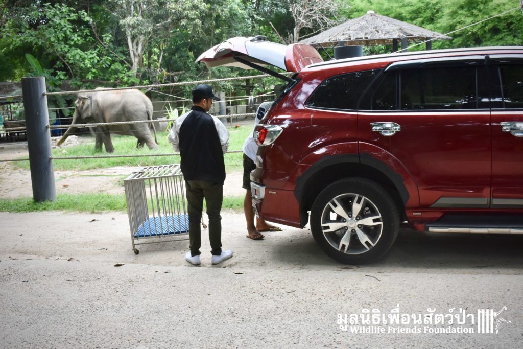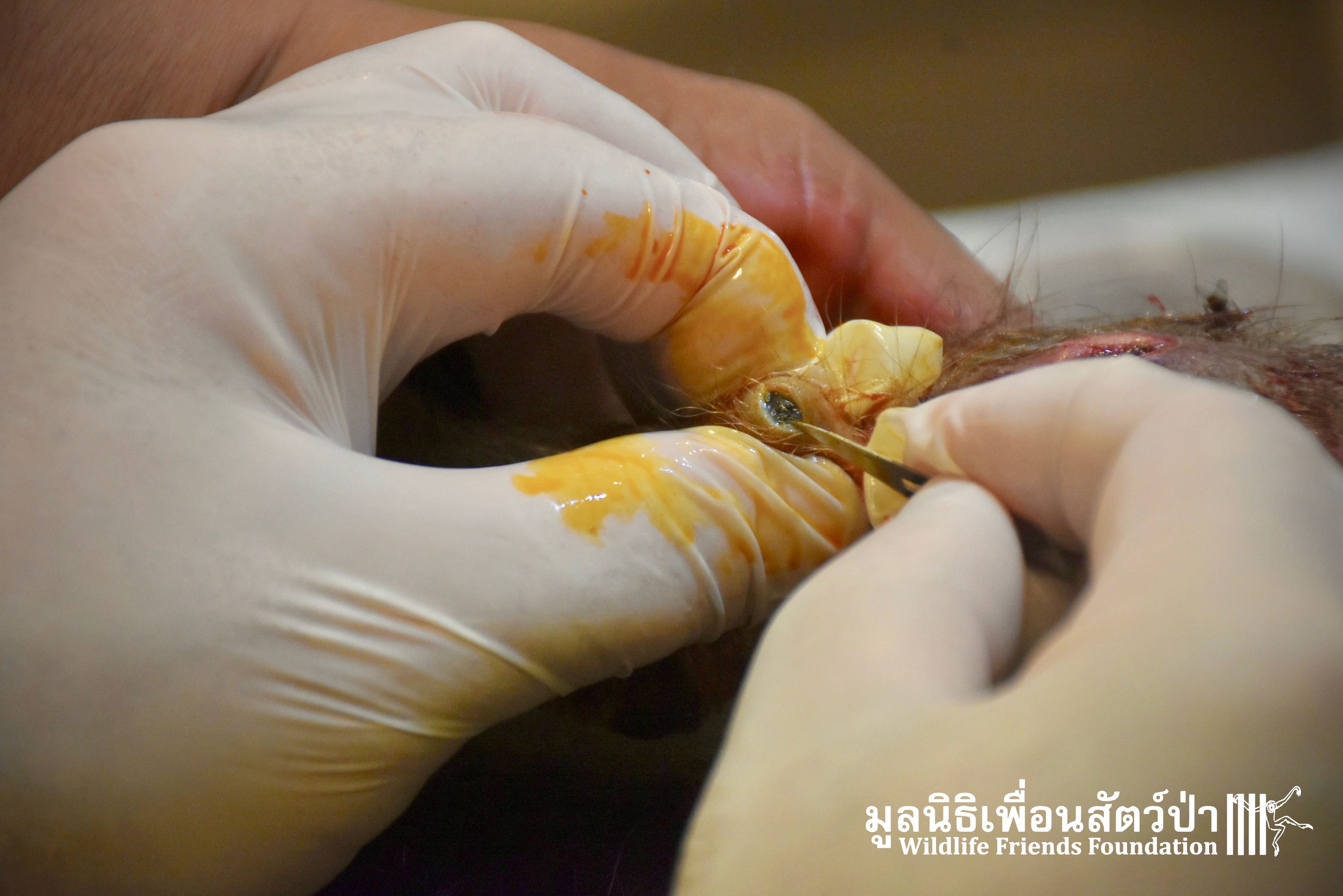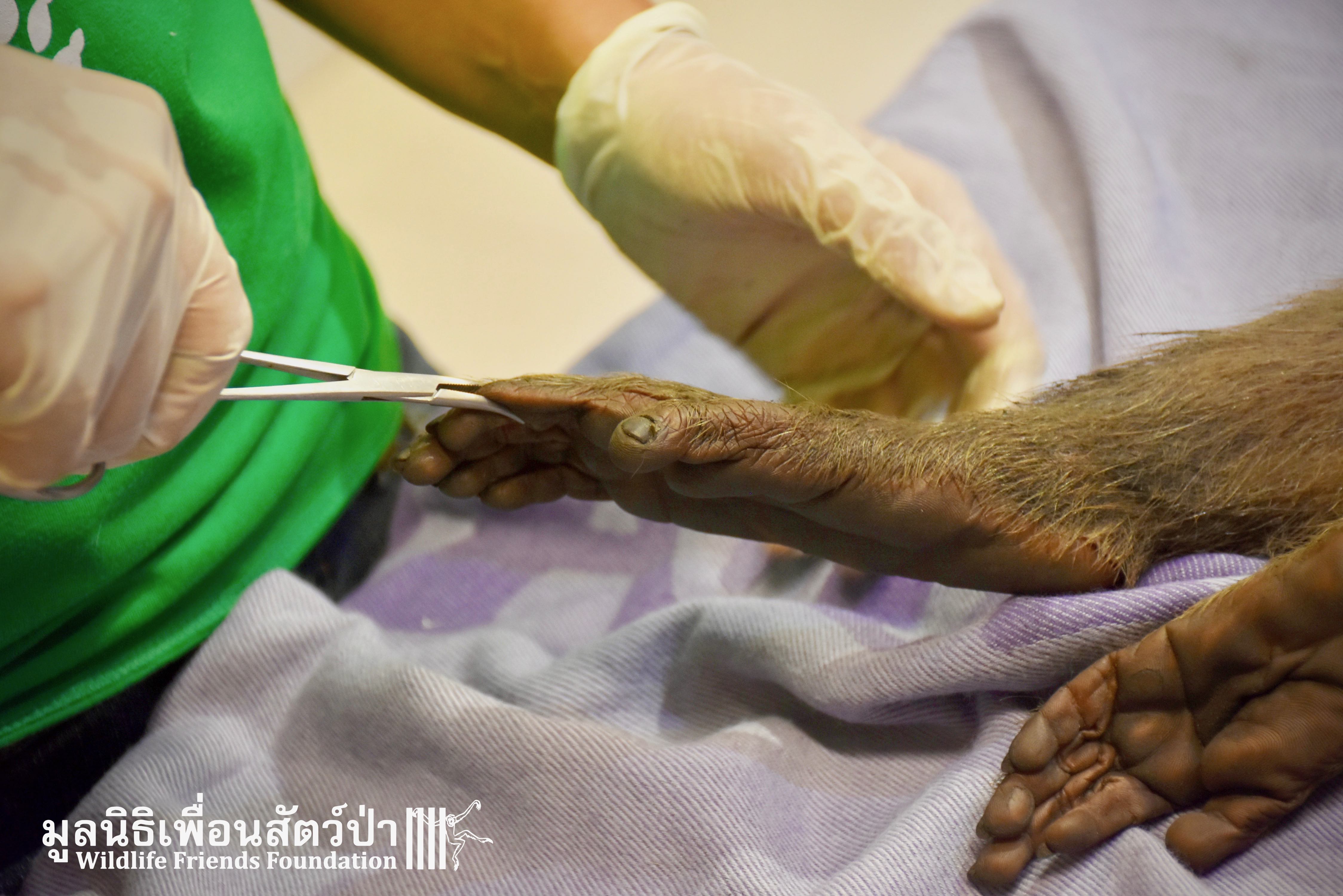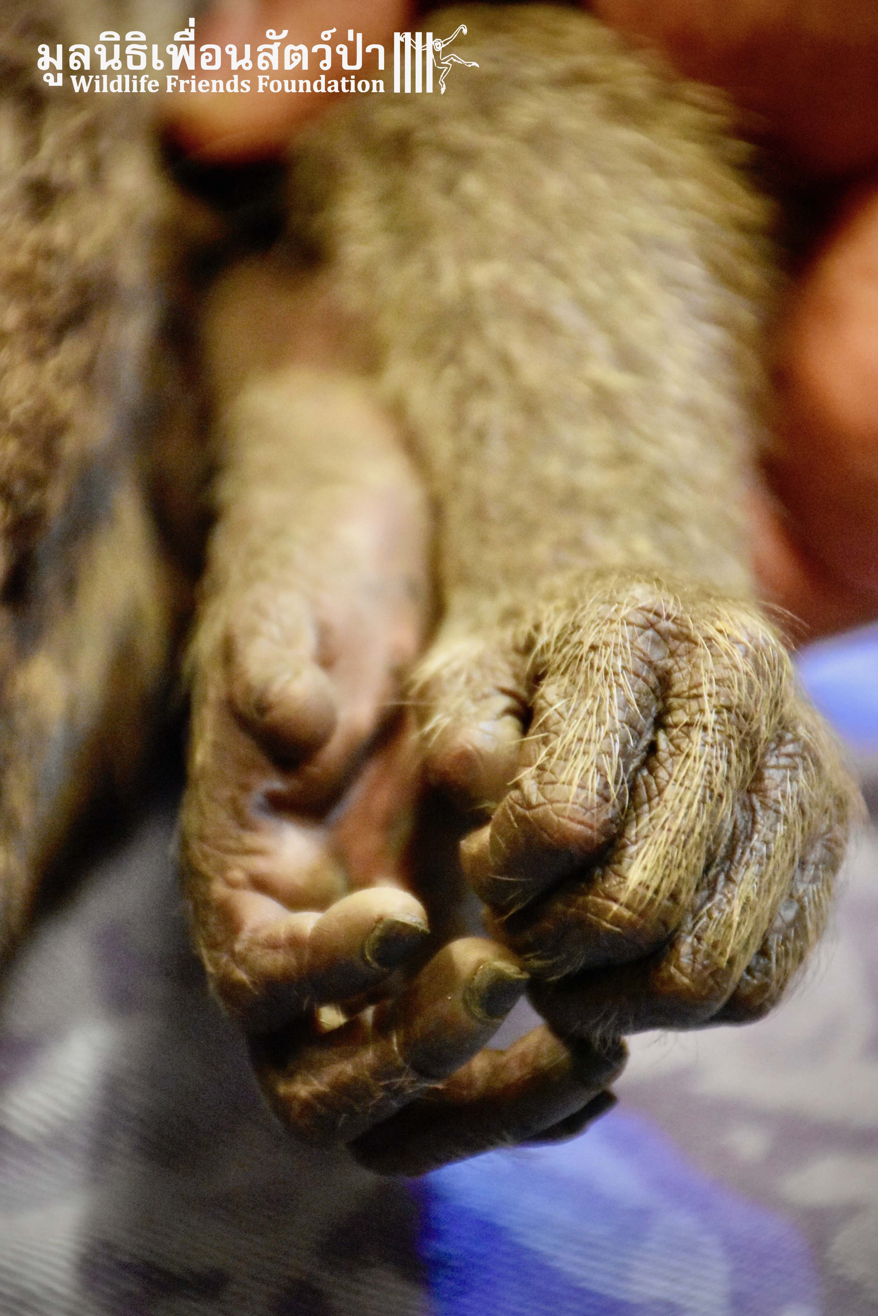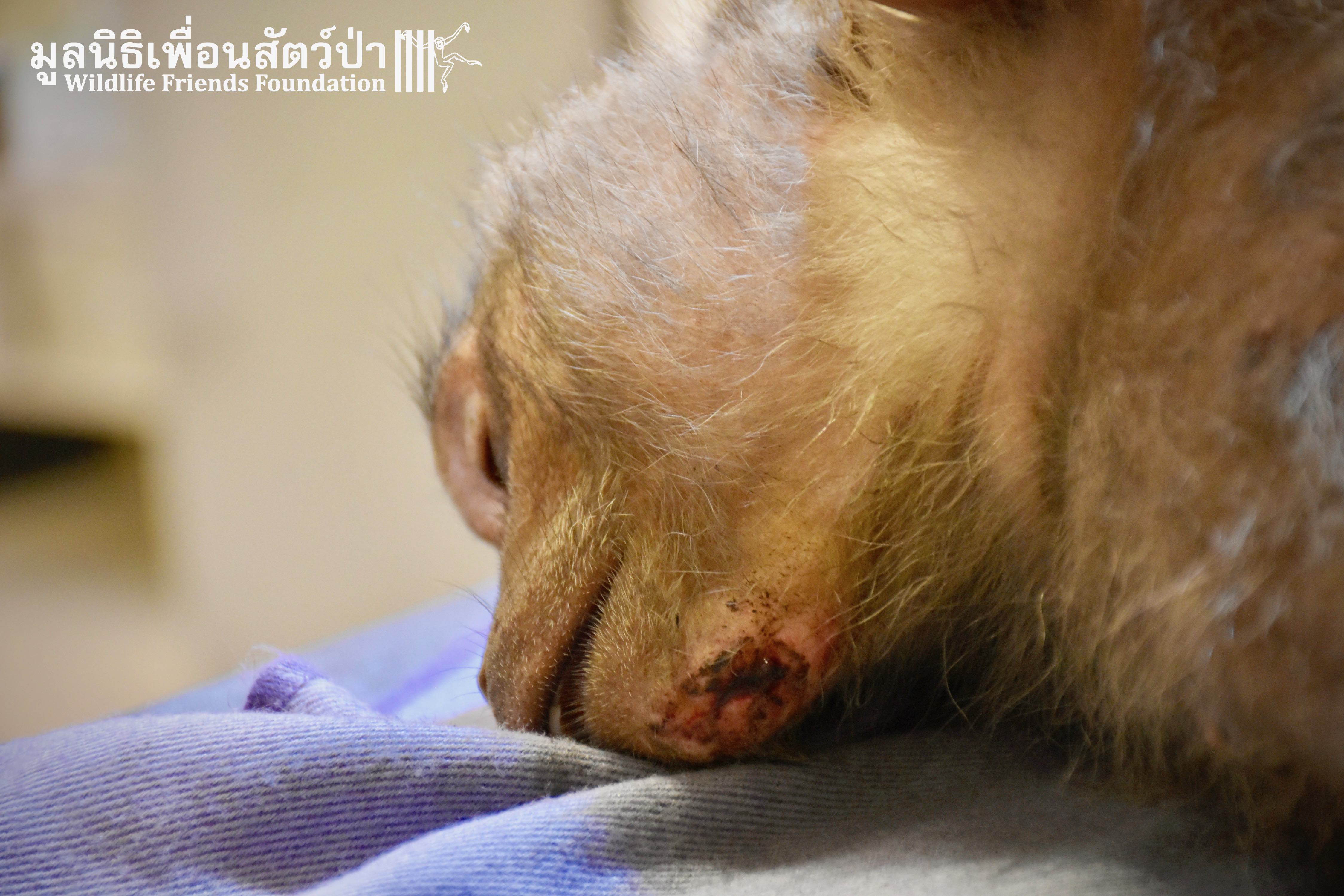 Last week we received a call for help from a team of people who help a troop of urban long-tailed macaques (Macaca fascicularis) in the city of Bangkok. They had found a sub-adult male on the floor unable to move after he had fallen from a tree. The monkey carers brought this macaque straight to the WFFT Wildlife Hospital for urgent treatment so our expert team could help him. When he arrived the team noticed wounds that had likely been caused by a fight with other monkeys or feral dogs, this could explain why he had fallen. He was also unable to use both his legs, which after treatment of his other minor injuries was the main concern. During the first day after treatment, no change his is condition was observed, but the day after that, he began to use one of his legs and began to eat well again, signs that he was recovering. To add further to his injuries a metal bullet was found in his arm, a small incision was made by the WFFT Vet team and the bullet was removed. After a few days this little man had made a miraculous recovery so we called his rescuers and they returned to WFFT to collect him and take him home back to his troop. Run free little guy, and try to avoid trouble in the future.