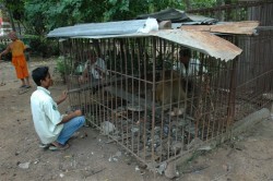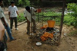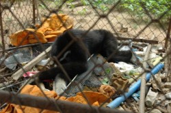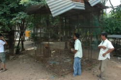 Things are always busy at the Wildlife Rescue Center, and unfortunately sometimes things get even more busy as we get an emergency called in. On the 9th of July we were called to go and help a seriously ill pig-tailed macaque at a temple near Pranburi city. The macaque that was not able to sit up anymore had been in a small cage since 1994, living in a lot of garbage and its own excrements.