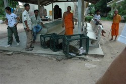 Unfortunately there were more wild animals at the temple, and we learned that the abbot of the temple had passed away only two month earlier, leaving no one willing to take care of the animals. Two gibbons, one iguana and four peacocks were found as well at the temple and the rescue team took them all in on the same day to the quarantine facility at the wildlife rescue center. The animals were all dropped by people at the temple over the years and the abbot had taken care for them for a very long period.