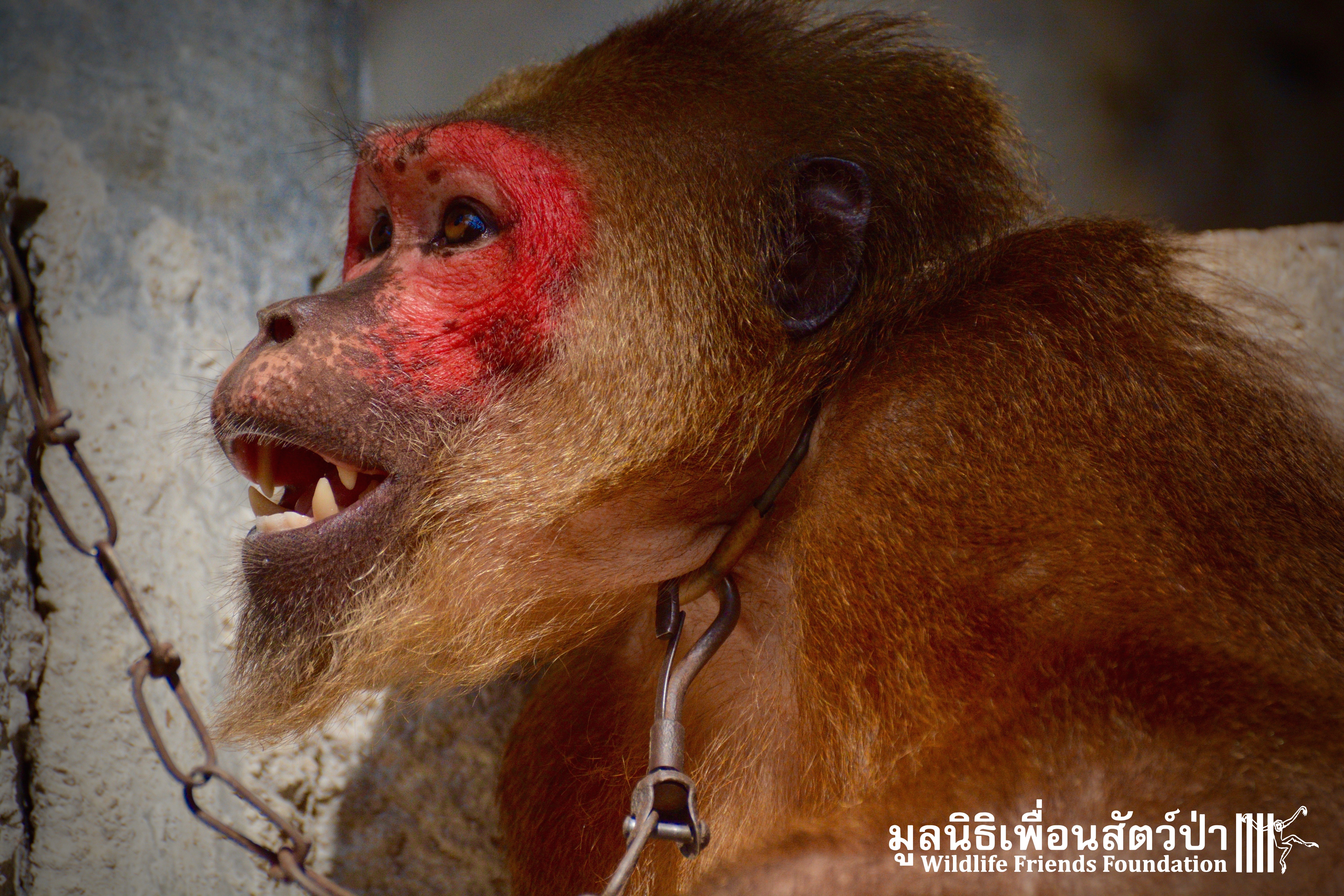 Secondly we introduce you to Khai Liam. Khai Liam was initially brought to our attention by Phil, the snake man, at Koh Samui Snake Rescue. He has spent the last 5 years also tethered to a metal pipe on a very short chain. He was stolen from the wild as an infant, after being taken from his mother after she was killed, he was sold as a pet, and has spent most of his time in chains on the island of Koh Phangan. His captors realized how specialised the needs of these animals are and how dangerous they become at only a few years old. He has been fed predominantly on bananas and was very wary when offered mango on the way home to WFFT, but started eating soon after.