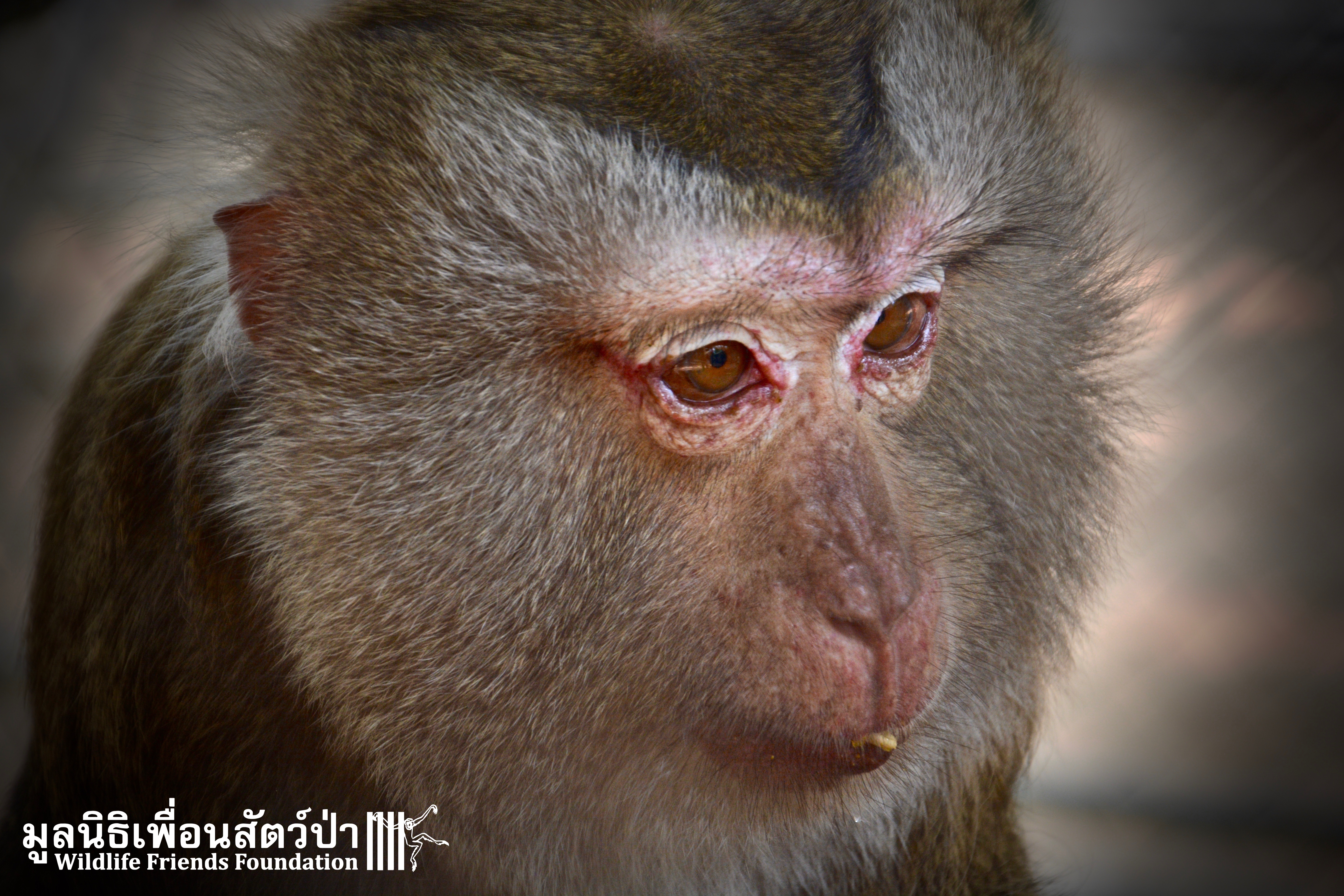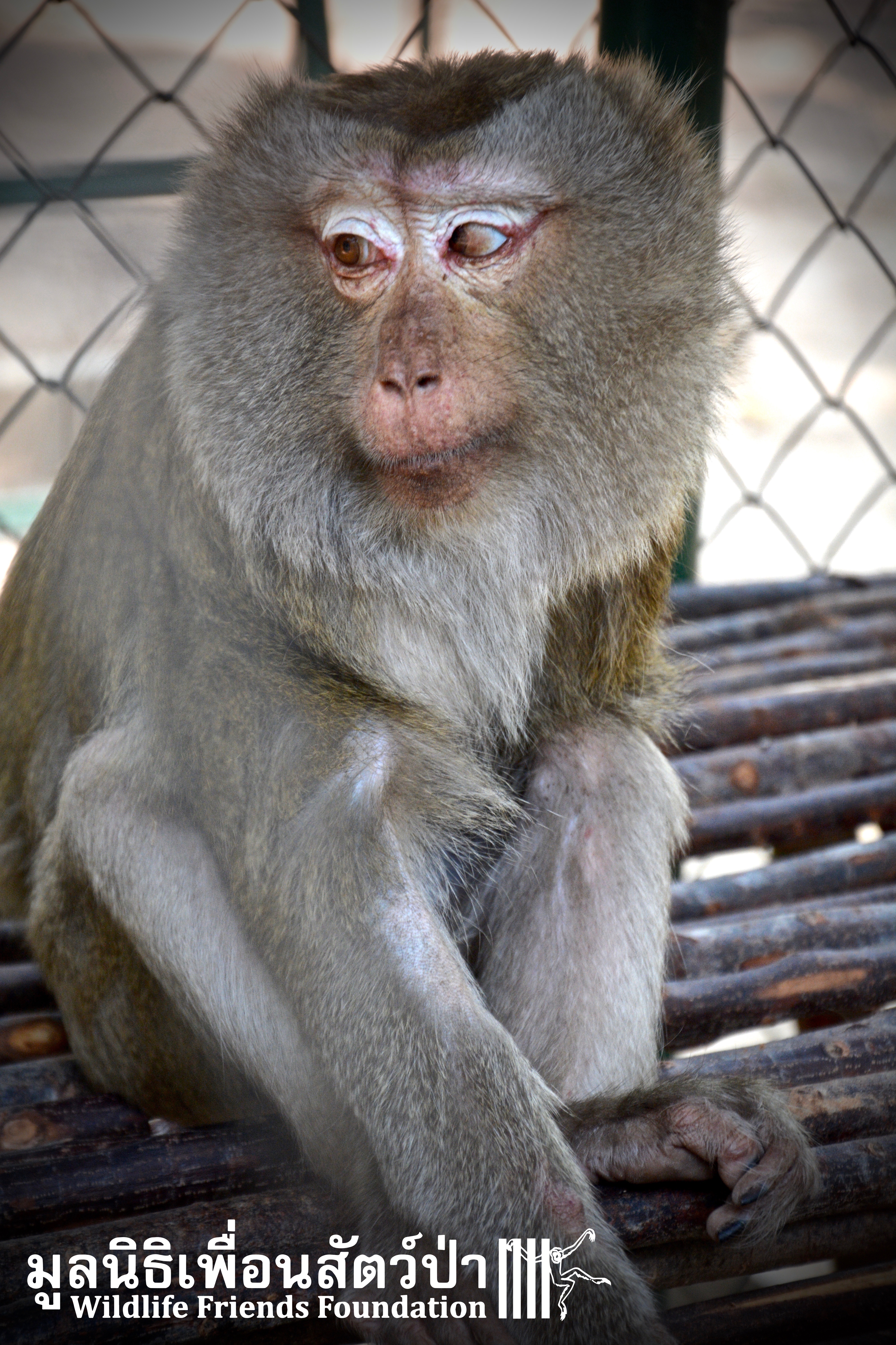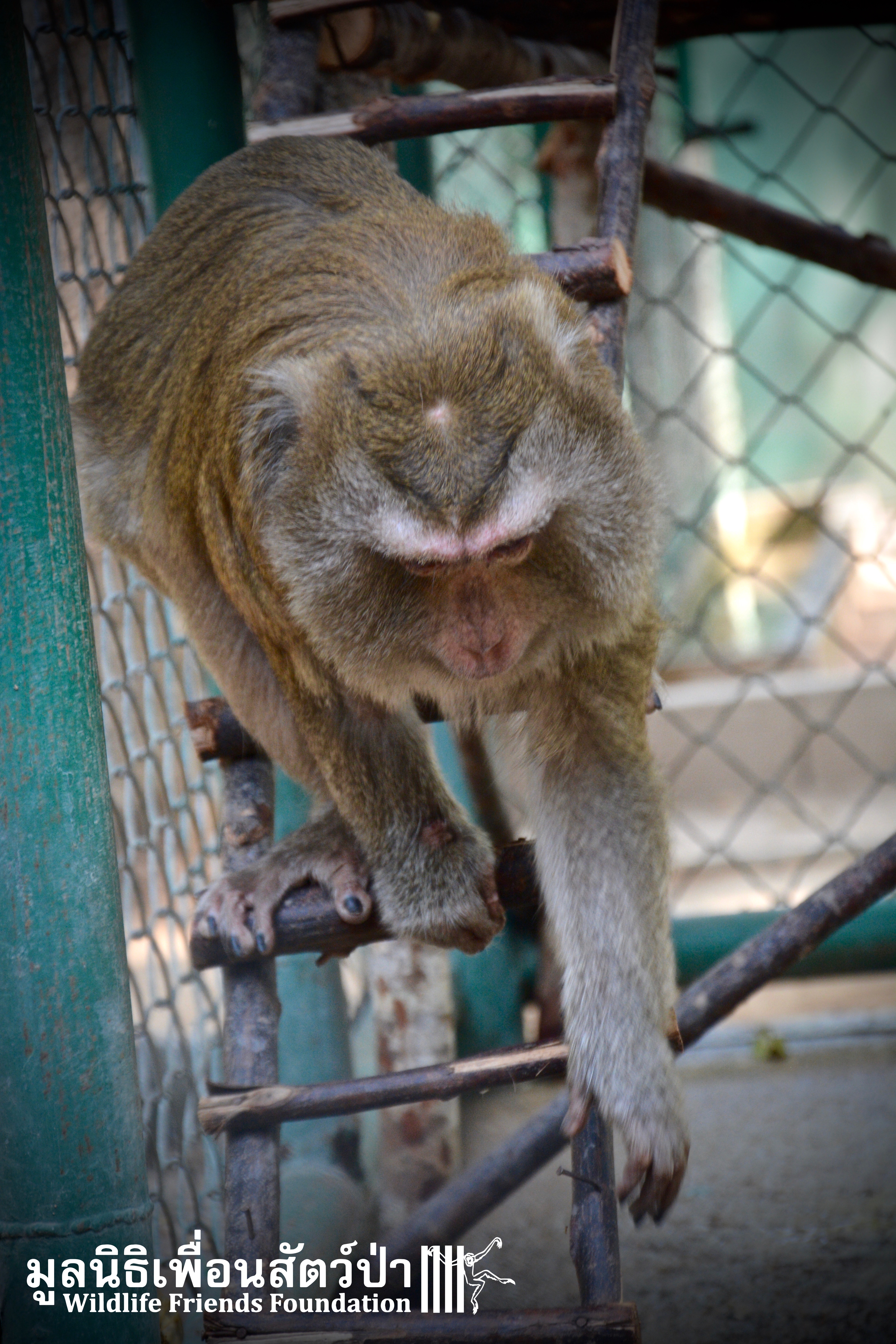 Jaw the elderly female Northern pig-tailed macaque (Macaca leonina) was rescued just over three weeks ago after spending the last 15 years of her life in solitary confinement at a temple in Northern Thailand. After a health check was performed on Jaw it was found that she had a large hernia on her abdomen. She spent the first few days adapting to a chain free life in WFFT’s Quarantine Area, with proper care and diet. We decided to perform surgery to correct the hernia after this settling in period. Its been three days since the operation was performed and Jaw is recovering well. The pain she has felt for years is slowly going away, this old lady has inspired us all with her resilience and strength. She is eating well and exploring her enclosure more and more, even climbing on her environmental enrichments. We cannot wait to be able to introduce her to some other macaques here at the WFFT Wildlife Rescue Centre. See her rescue story here http://bit.ly/1MSfNwy. We will keep you updated on her progress.