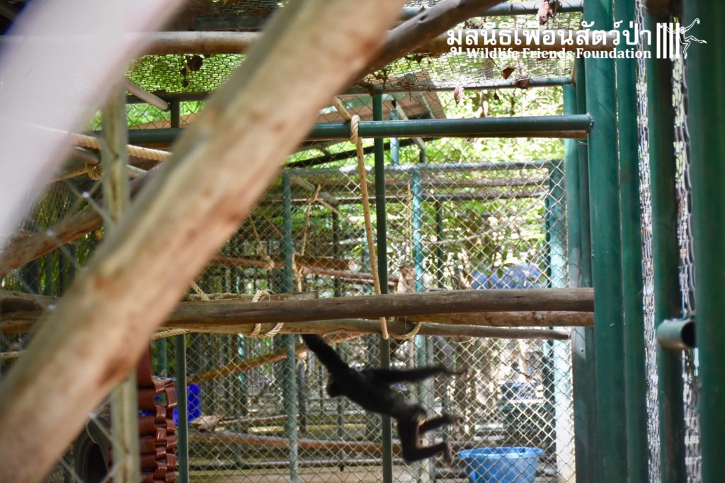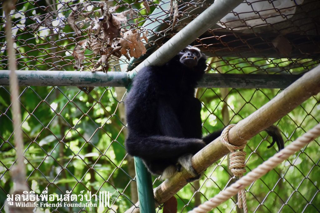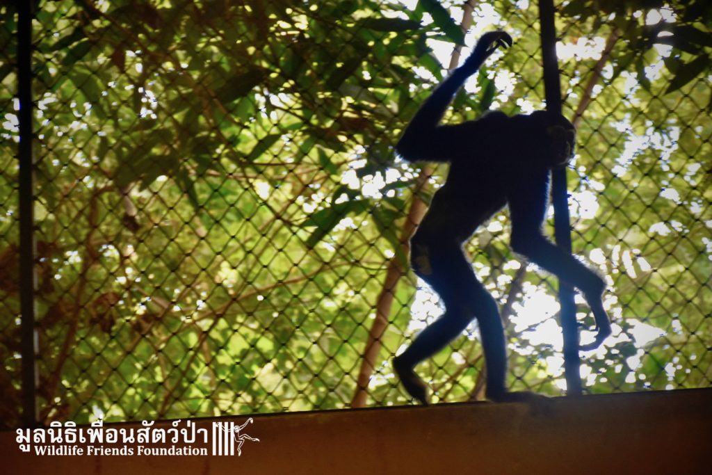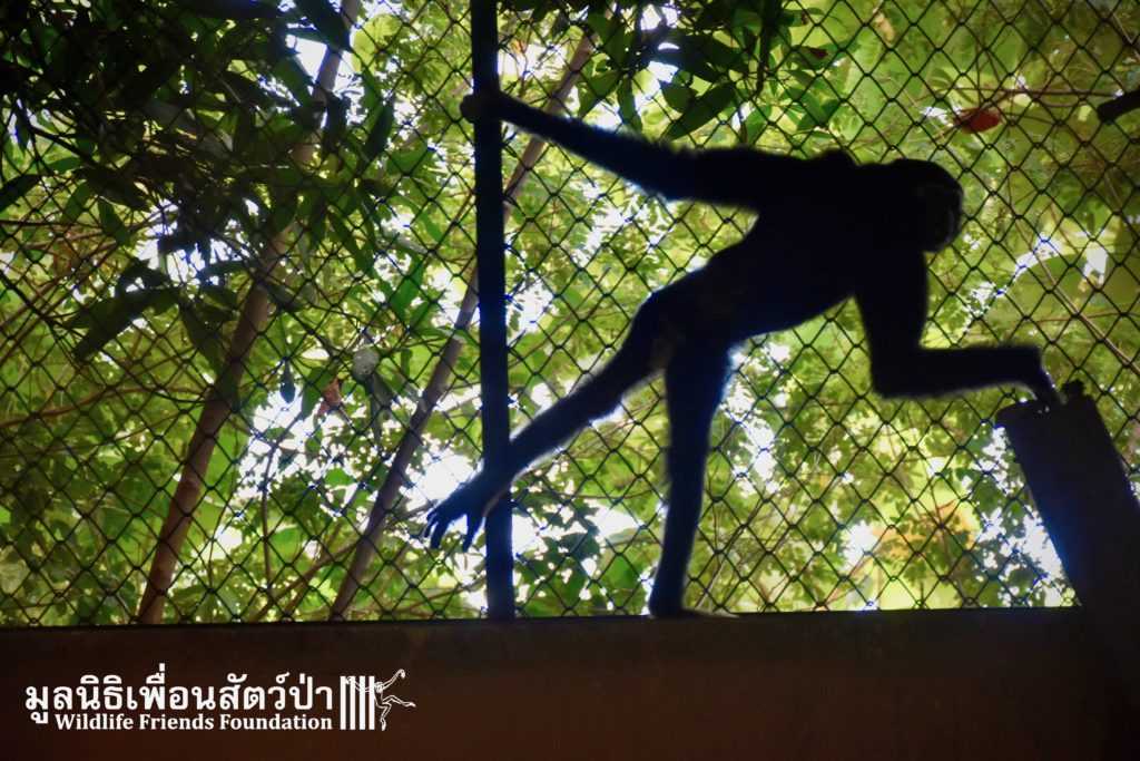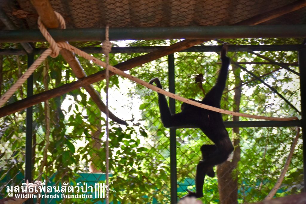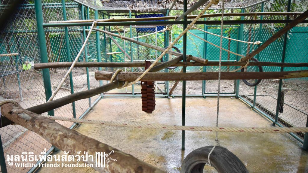 As far as the Vet Team knows Burma has no medical conditions, except being old. He suffered a broken wrist 3 years ago, fixed by Khao Kew open zoo Vet Staff who came to collect and operate on him. But on the day of his rescue our Vet Team found in Burma a pretty strong and active ape! His limbs are skinny limbs of an aged animal but beside that he really didn’t look or act his age. He was simply swinging around in his relatively big, even if empty, enclosure. After he had been sedated, to avoid him any stress and for his own & our staff’s safety he was transported back to the WFFT Quarantine area. There he will be able to adapt and get ready for the next step of his new life at the center. Fed with fresh fruits everyday, the only things Burma will maybe miss is his Sunday pizza treat ! But that is for his own good. For the moment he is doesn’t really know how to use and enjoy the enrichments placed all around his new double enclosure, being kept in a barren enclosure for so long it is pretty new for him. Yet he already sings with his neighbors. Now they sing back for the first time in his long life.
