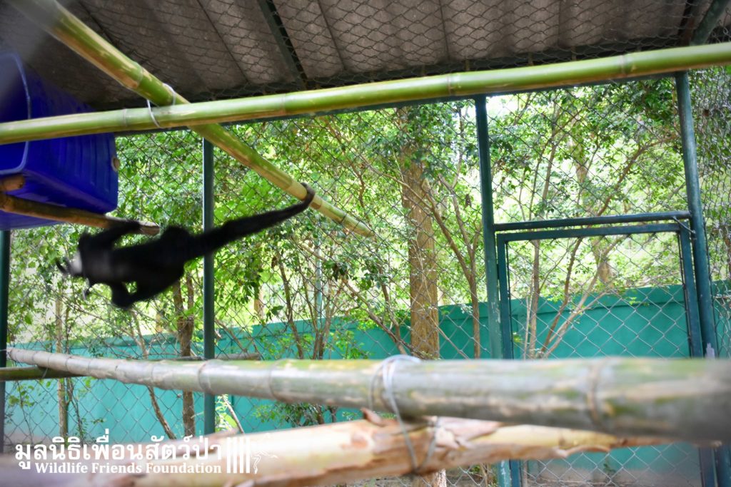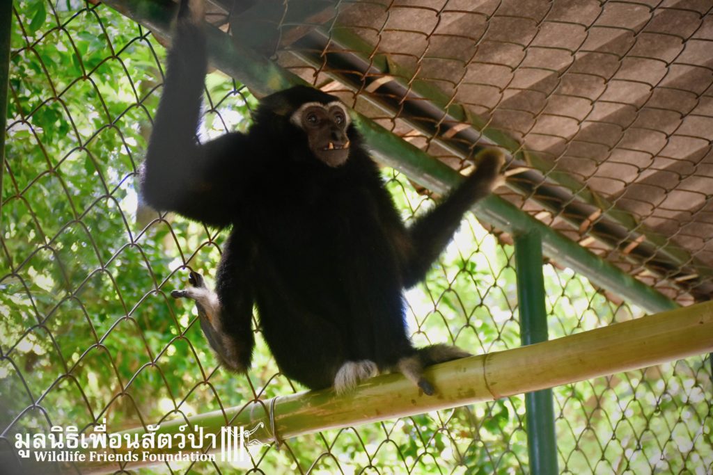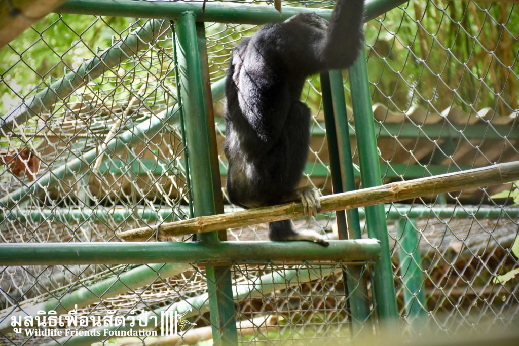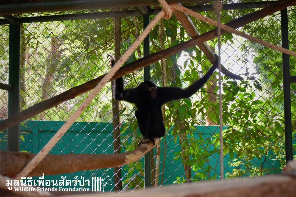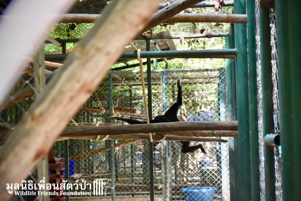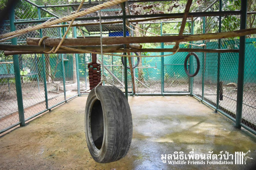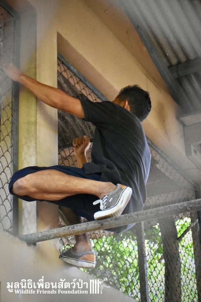 As far as the Vet Team knows Burma has no medical conditions, except being old. He suffered a broken wrist 3 years ago, fixed by Khao Kew open zoo Vet Staff who came to collect and operate on him. But on the day of his rescue our Vet Team found in Burma a pretty strong and active ape! His limbs are skinny limbs of an aged animal but beside that he really didn’t look or act his age. He was simply swinging around in his relatively big, even if empty, enclosure. After he had been sedated, to avoid him any stress and for his own & our staff’s safety he was transported back to the WFFT Quarantine area. There he will be able to adapt and get ready for the next step of his new life at the center. Fed with fresh fruits everyday, the only things Burma will maybe miss is his Sunday pizza treat ! But that is for his own good. For the moment he is doesn’t really know how to use and enjoy the enrichments placed all around his new double enclosure, being kept in a barren enclosure for so long it is pretty new for him. Yet he already sings with his neighbors. Now they sing back for the first time in his long life.