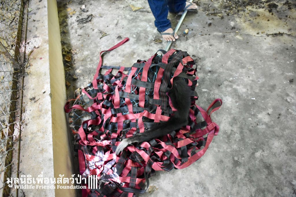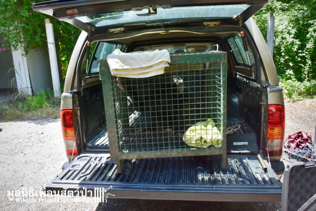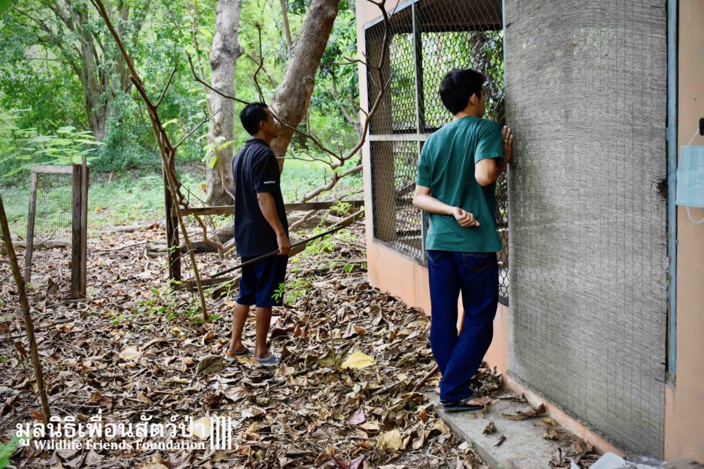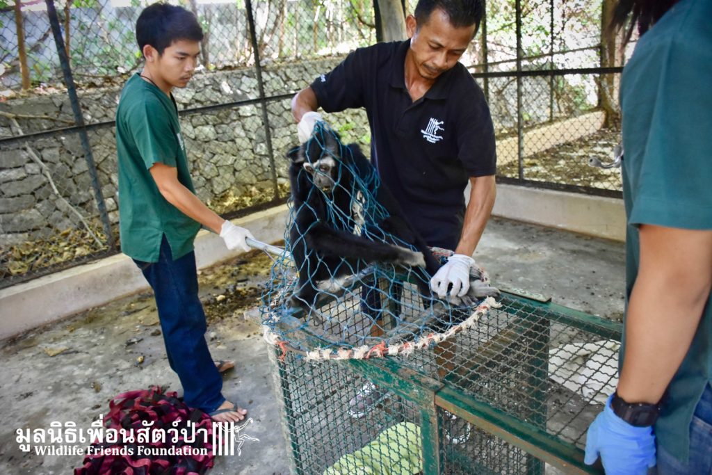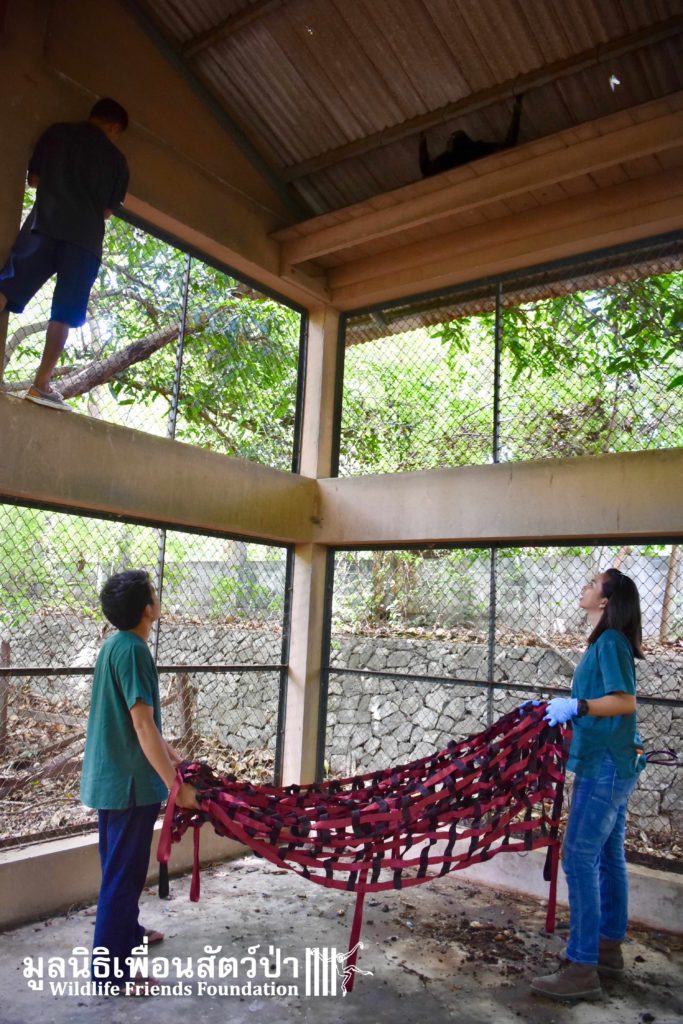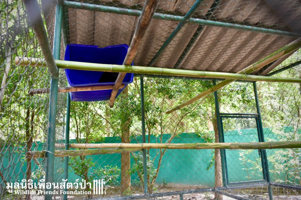 As far as the Vet Team knows Burma has no medical conditions, except being old. He suffered a broken wrist 3 years ago, fixed by Khao Kew open zoo Vet Staff who came to collect and operate on him. But on the day of his rescue our Vet Team found in Burma a pretty strong and active ape! His limbs are skinny limbs of an aged animal but beside that he really didn’t look or act his age. He was simply swinging around in his relatively big, even if empty, enclosure. After he had been sedated, to avoid him any stress and for his own & our staff’s safety he was transported back to the WFFT Quarantine area. There he will be able to adapt and get ready for the next step of his new life at the center. Fed with fresh fruits everyday, the only things Burma will maybe miss is his Sunday pizza treat ! But that is for his own good. For the moment he is doesn’t really know how to use and enjoy the enrichments placed all around his new double enclosure, being kept in a barren enclosure for so long it is pretty new for him. Yet he already sings with his neighbors. Now they sing back for the first time in his long life.
