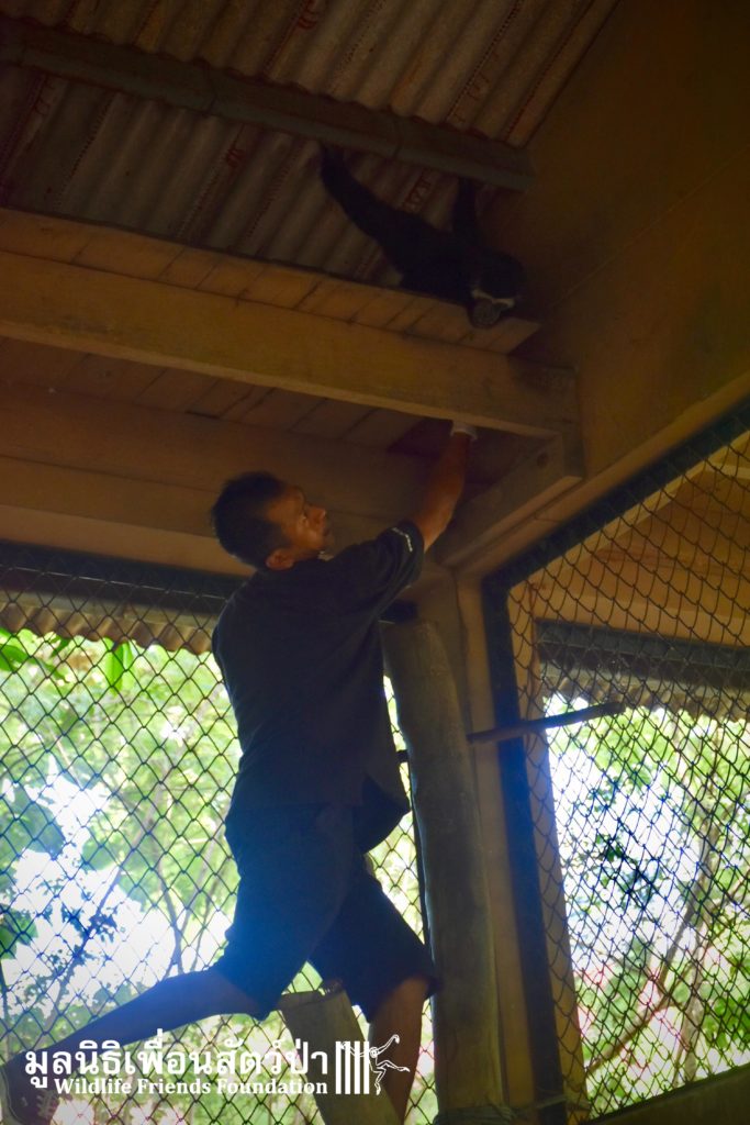 Burma’s owner, took him over from his brother, who had bought him as an infant from the Chattuchak Market, when he was 6 years old. He took care of him the next 32 years. The owner was growing old at the same rhythm as Burma, and was finding it more and more difficult to take care of him anymore. Thanks to a family members who had visited the WFFT center and discovered the work we do the owner found out about the rescued animals we take care off. Concerned for the future of Burma he wanted him to have a happy ending to his life and decided to give him a chance to have a better life and let him join the family of the WFFT rescued animals. As he was not aware of the exceptional age of his old gibbon, he was happy to know Burma was going to have adapted medical care, and an adapted place to spend the remainder of his lifetime.