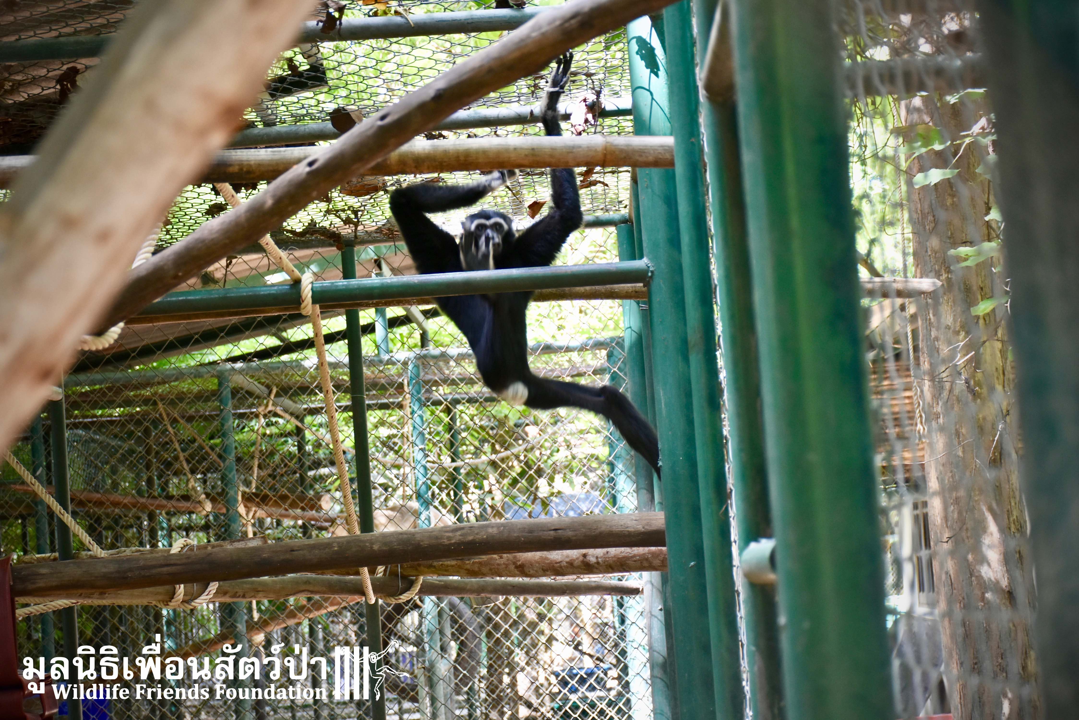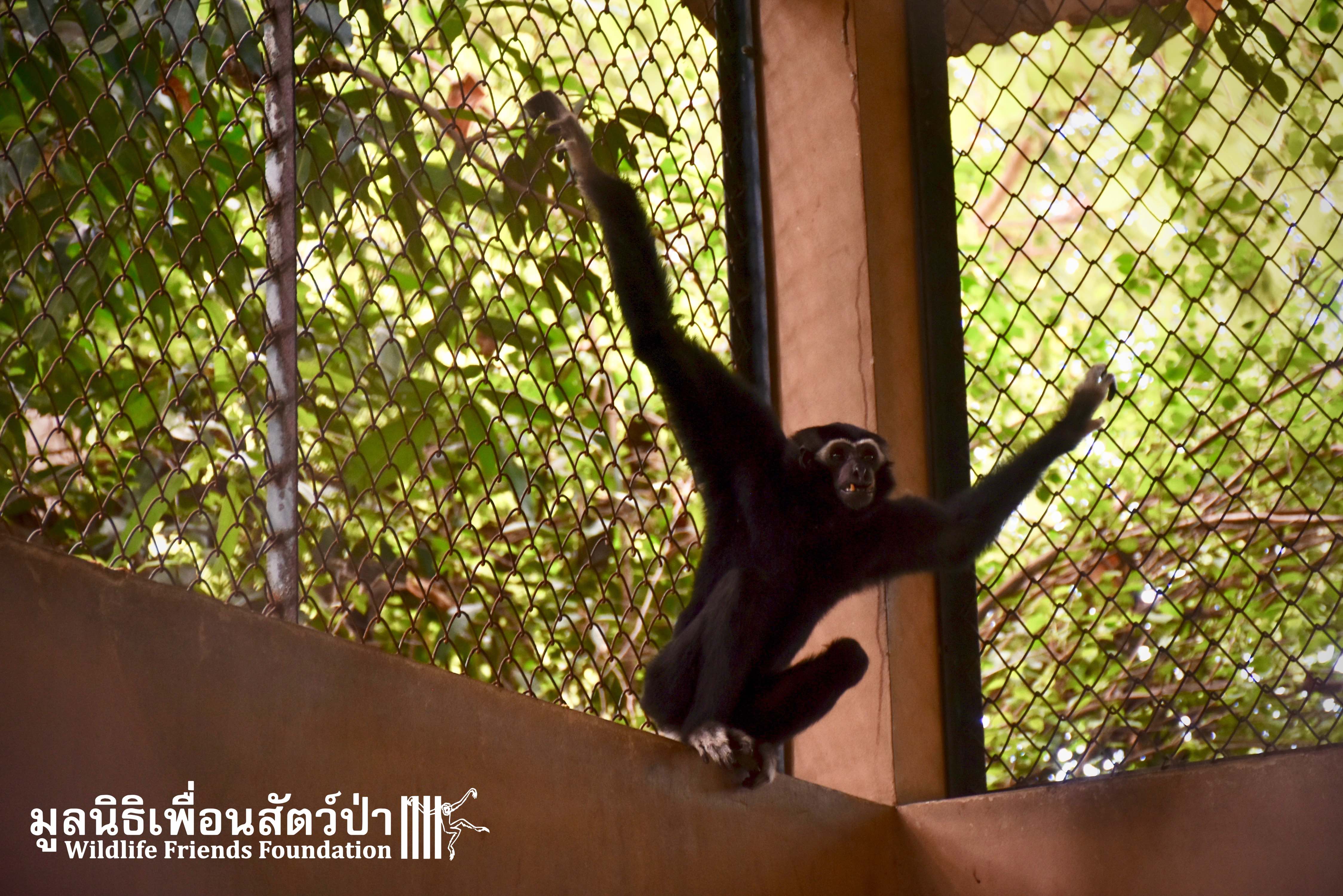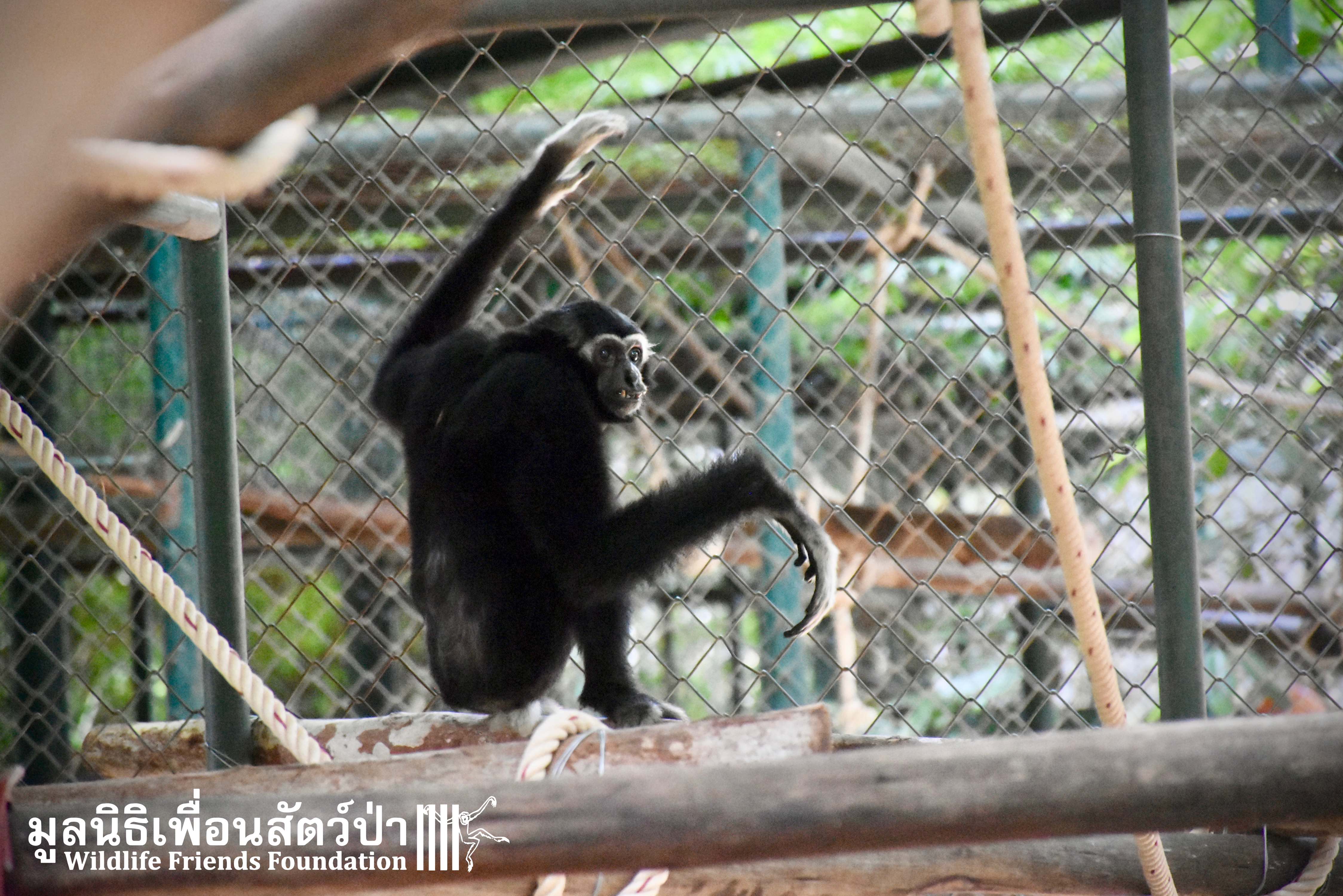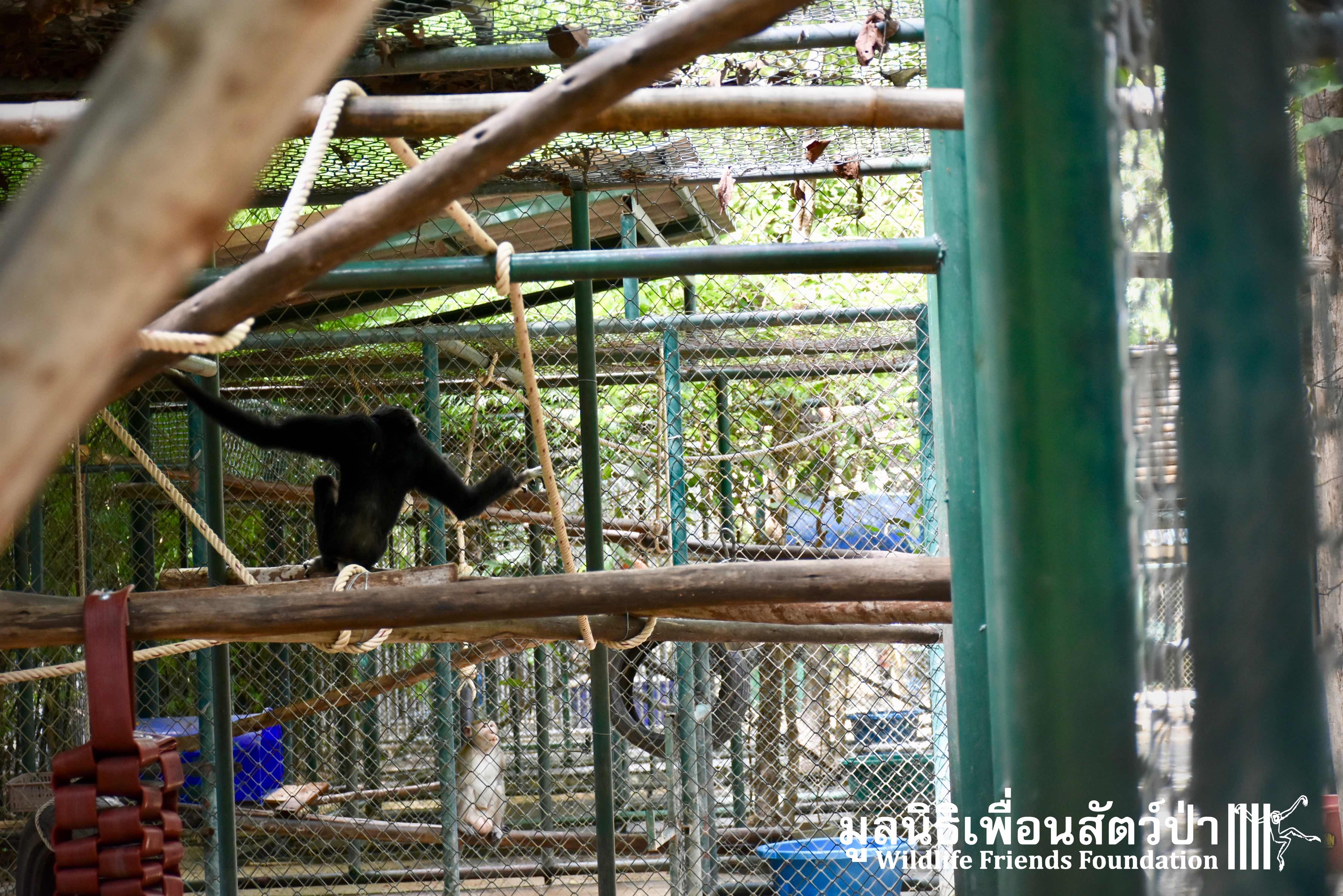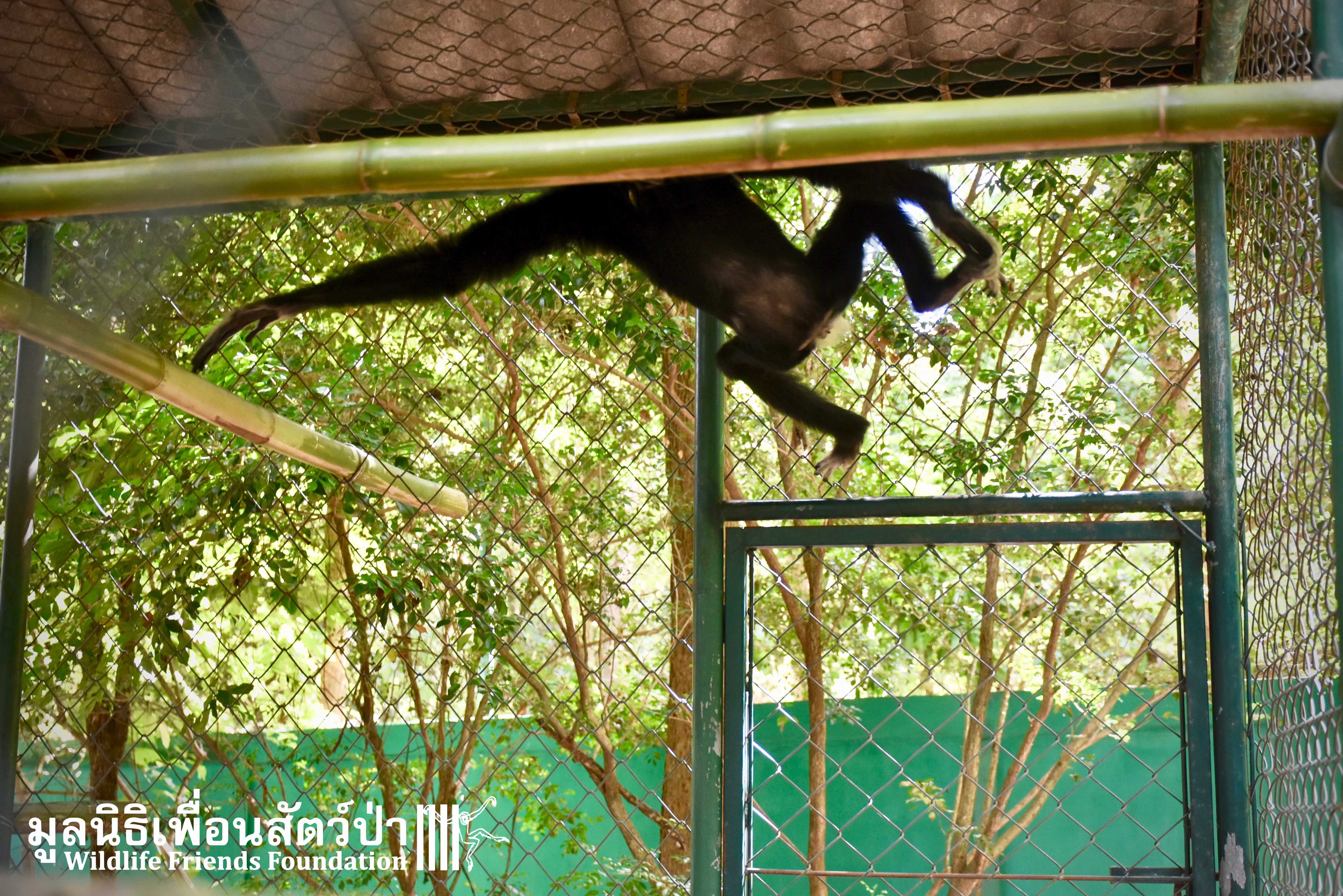 As far as the Vet Team knows Burma has no medical conditions, except being old. He suffered a broken wrist 3 years ago, fixed by Khao Kew open zoo Vet Staff who came to collect and operate on him. But on the day of his rescue our Vet Team found in Burma a pretty strong and active ape! His limbs are skinny limbs of an aged animal but beside that he really didn’t look or act his age. He was simply swinging around in his relatively big, even if empty, enclosure. After he had been sedated, to avoid him any stress and for his own & our staff’s safety he was transported back to the WFFT Quarantine area. There he will be able to adapt and get ready for the next step of his new life at the center. Fed with fresh fruits everyday, the only things Burma will maybe miss is his Sunday pizza treat ! But that is for his own good. For the moment he is doesn’t really know how to use and enjoy the enrichments placed all around his new double enclosure, being kept in a barren enclosure for so long it is pretty new for him. Yet he already sings with his neighbors. Now they sing back for the first time in his long life.