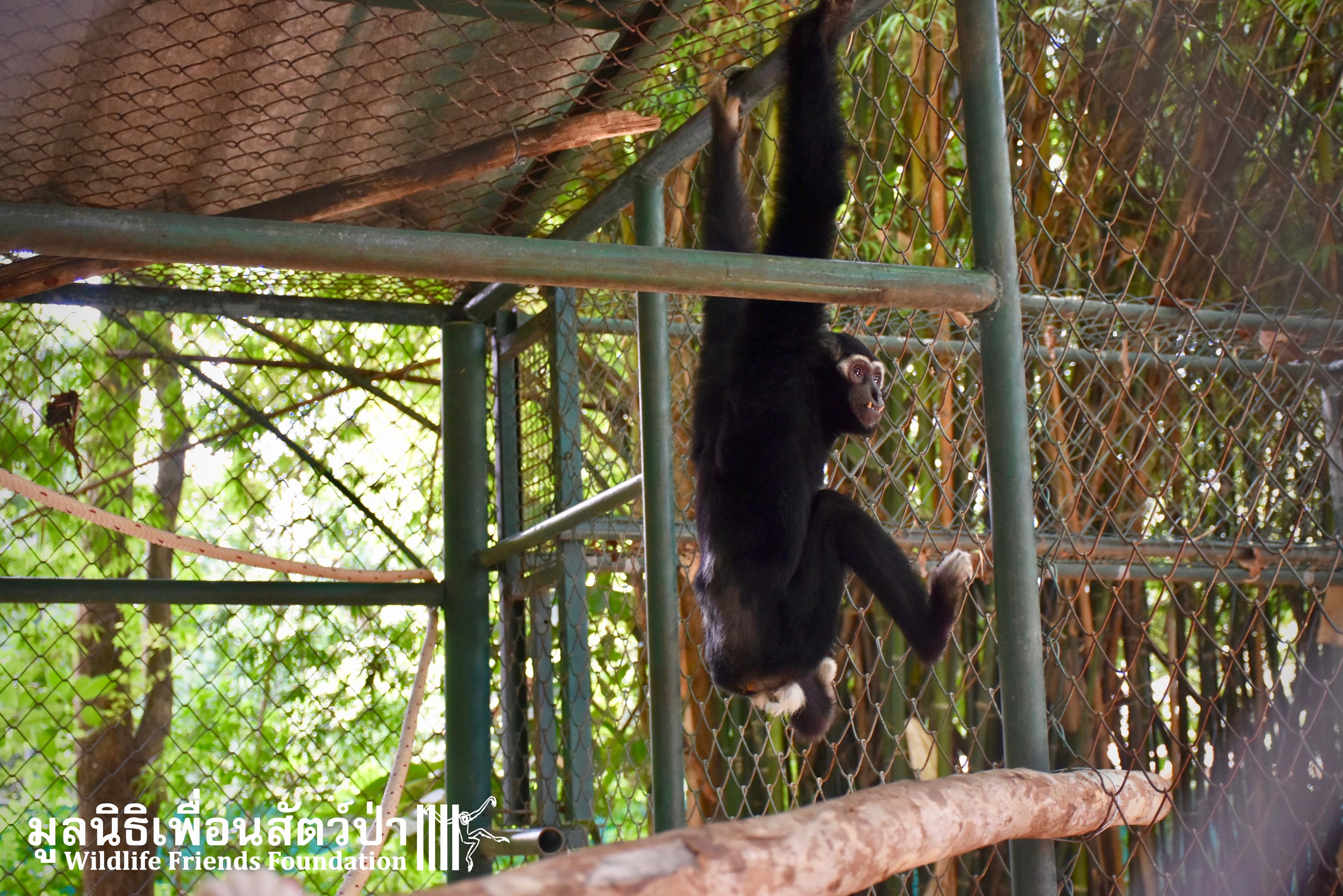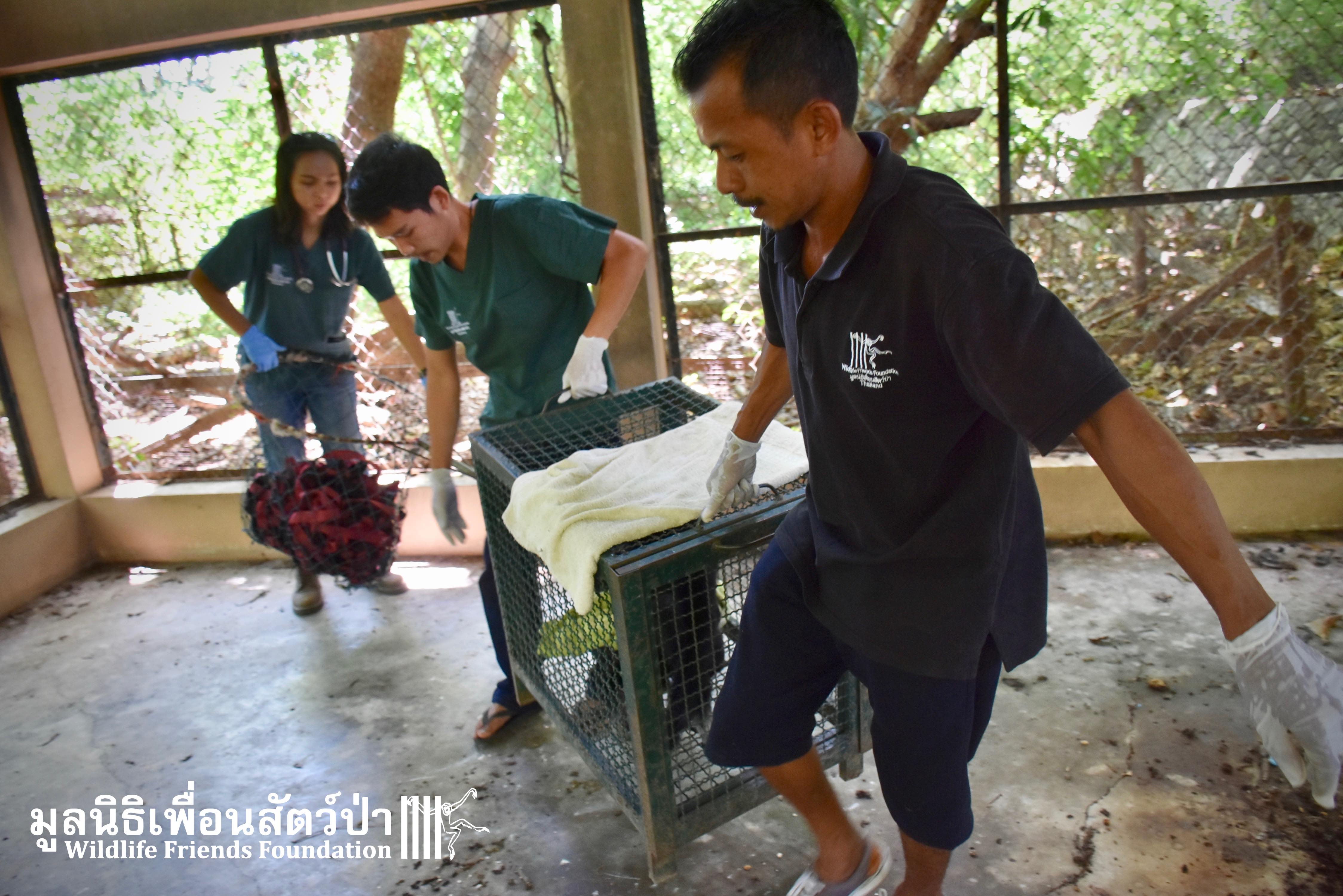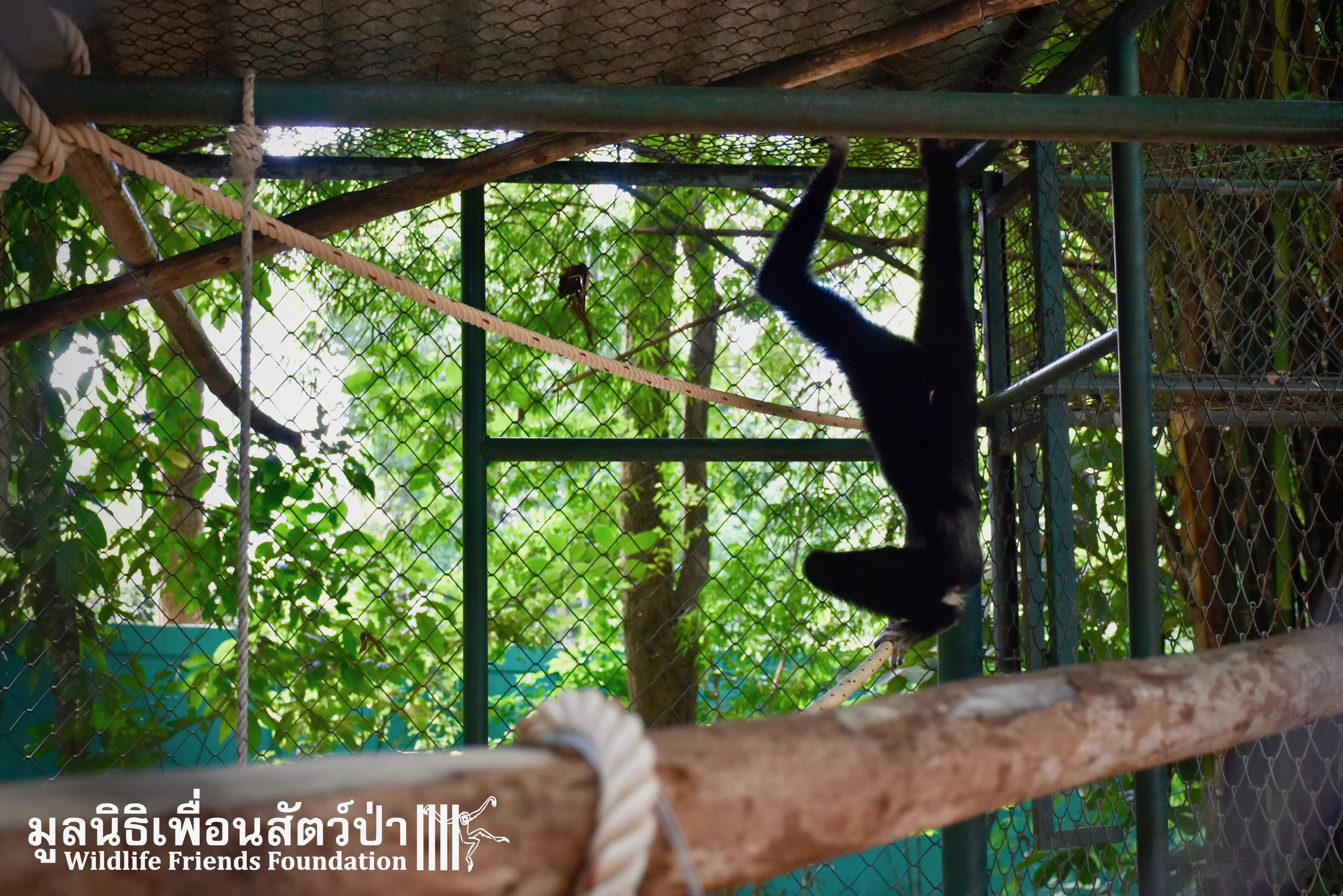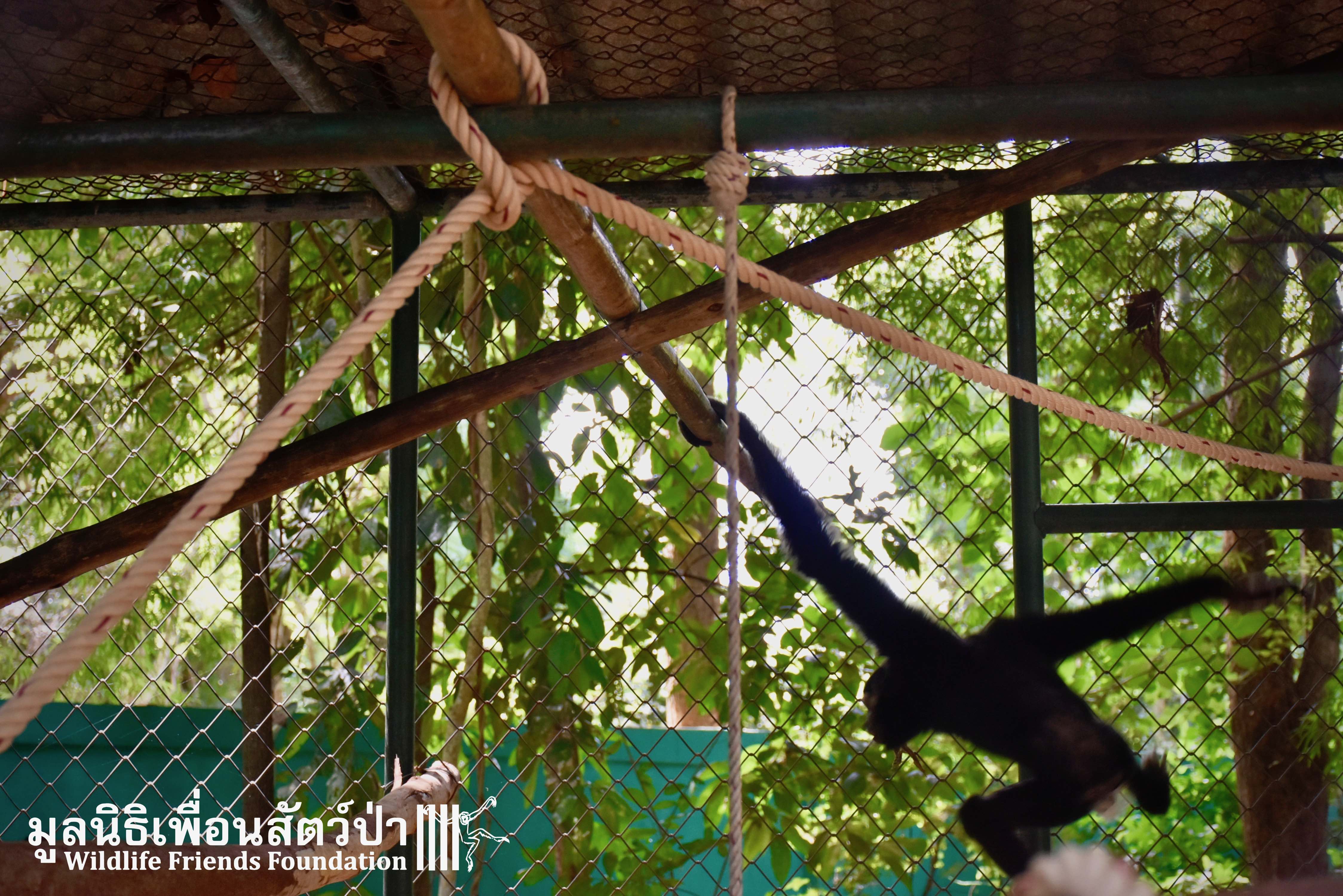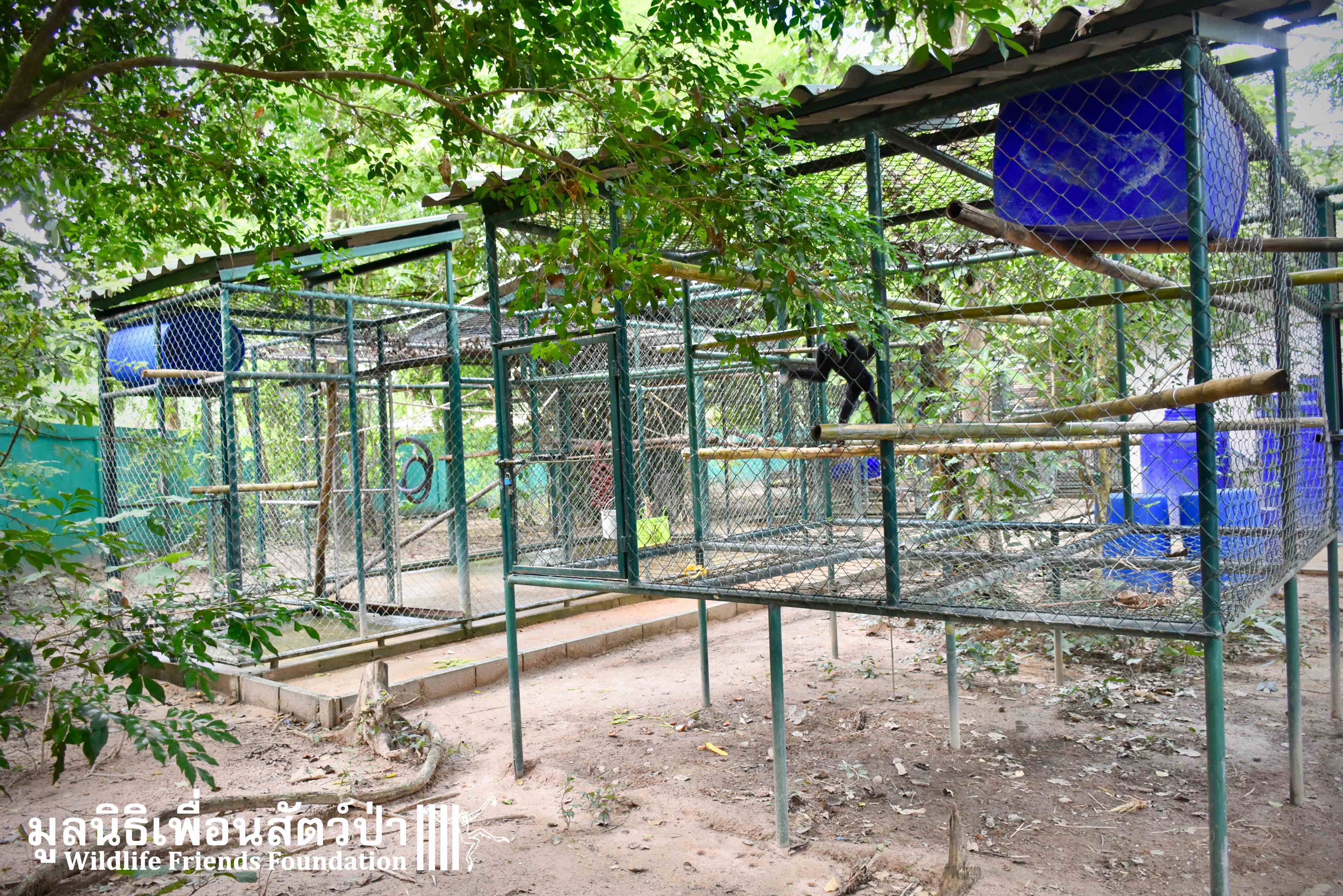 As far as the Vet Team knows Burma has no medical conditions, except being old. He suffered a broken wrist 3 years ago, fixed by Khao Kew open zoo Vet Staff who came to collect and operate on him. But on the day of his rescue our Vet Team found in Burma a pretty strong and active ape! His limbs are skinny limbs of an aged animal but beside that he really didn’t look or act his age. He was simply swinging around in his relatively big, even if empty, enclosure. After he had been sedated, to avoid him any stress and for his own & our staff’s safety he was transported back to the WFFT Quarantine area. There he will be able to adapt and get ready for the next step of his new life at the center. Fed with fresh fruits everyday, the only things Burma will maybe miss is his Sunday pizza treat ! But that is for his own good. For the moment he is doesn’t really know how to use and enjoy the enrichments placed all around his new double enclosure, being kept in a barren enclosure for so long it is pretty new for him. Yet he already sings with his neighbors. Now they sing back for the first time in his long life.