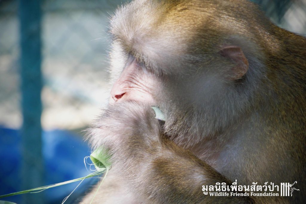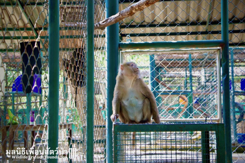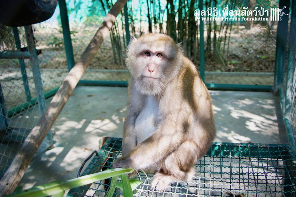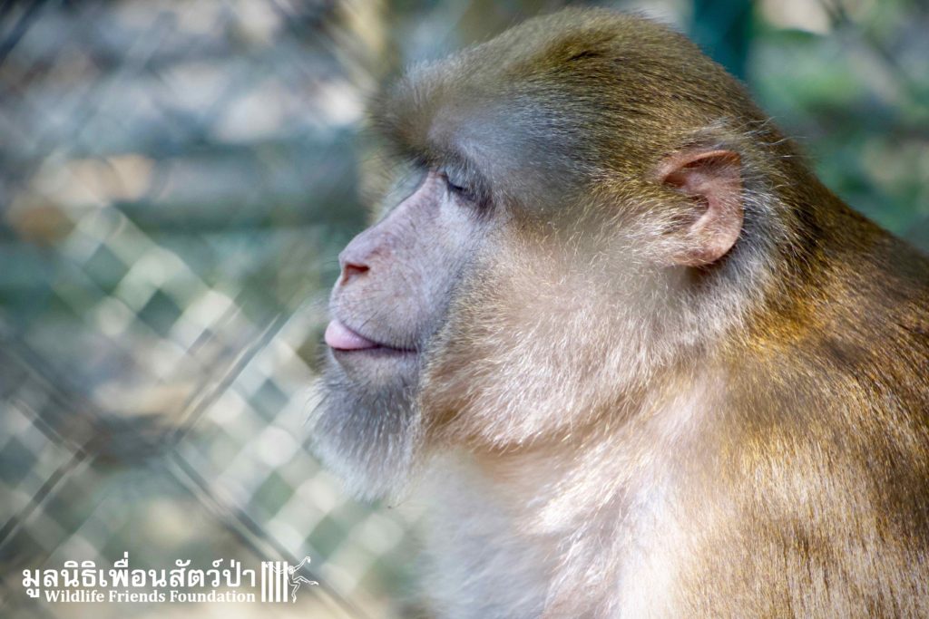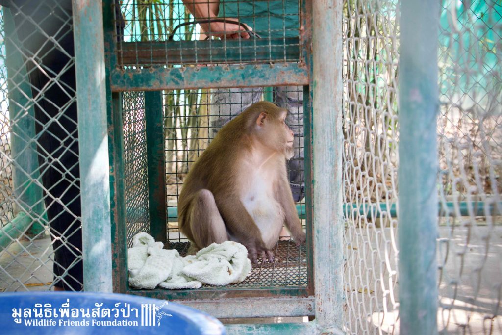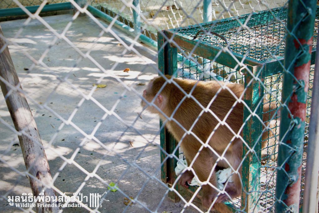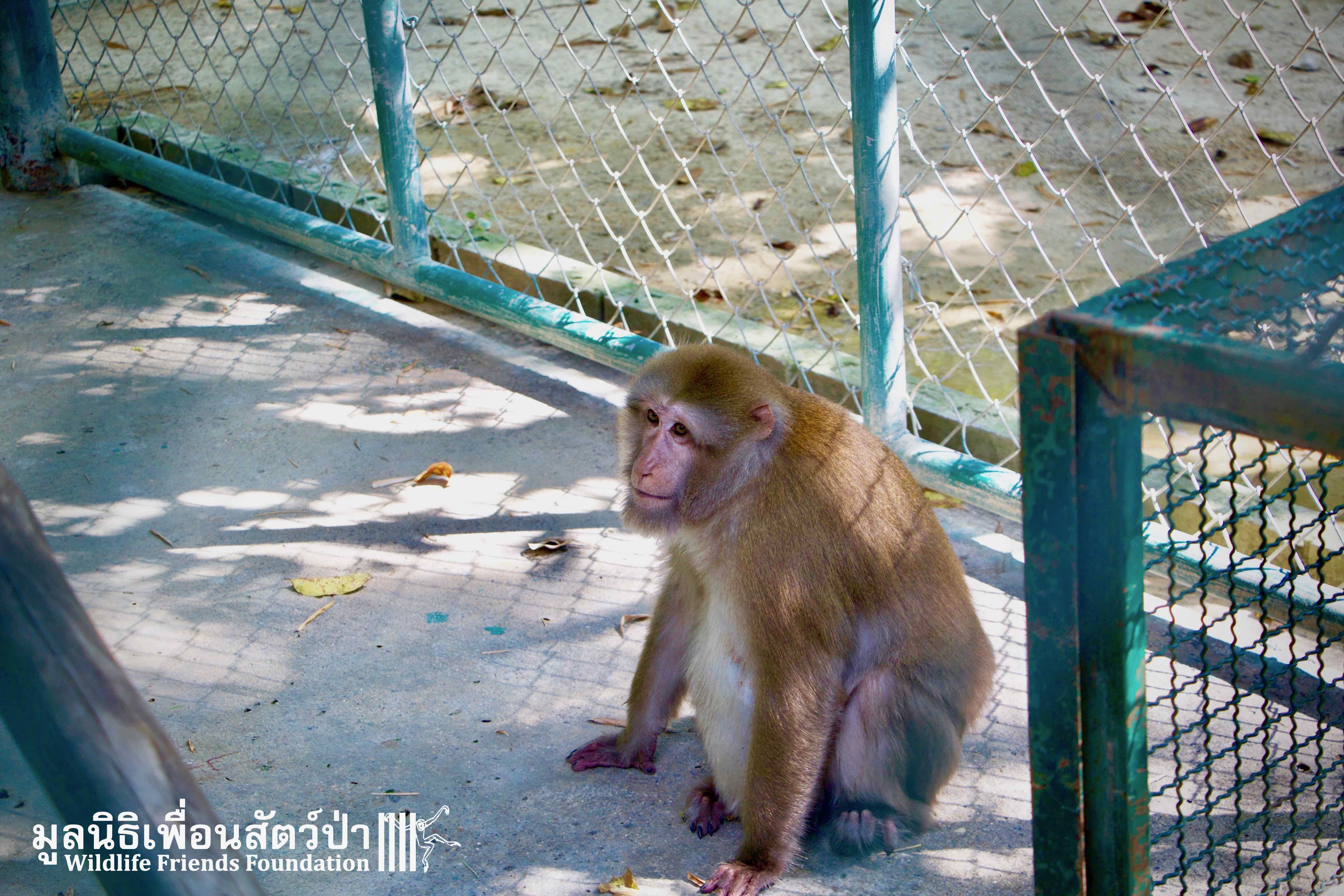 Here is the story of Somsri. A female Rhesus Macaque (Macaca mulatta) who is five-and-a-half-years old. The ‘owner’ of Somsri contacted WFFT to ask if we could provide a home for her after realising that they did not have the correct legal paperwork to keep her. She was kept for 5 years in a small empty cage, completely devoid of any physical or stimulating enrichment, her whole life so far has been pretty bleak. Her “home” was inside a garage, no sun, no natural substrate… the keys to the lock long since lost and the padlock and chain rusted together, a symbol of a forgotten prisoner in solitary confinement, with little chance of freedom. Next to her were two beautiful big dogs also confined to small cages whining and barking. They were also crying of their dream of freedom.