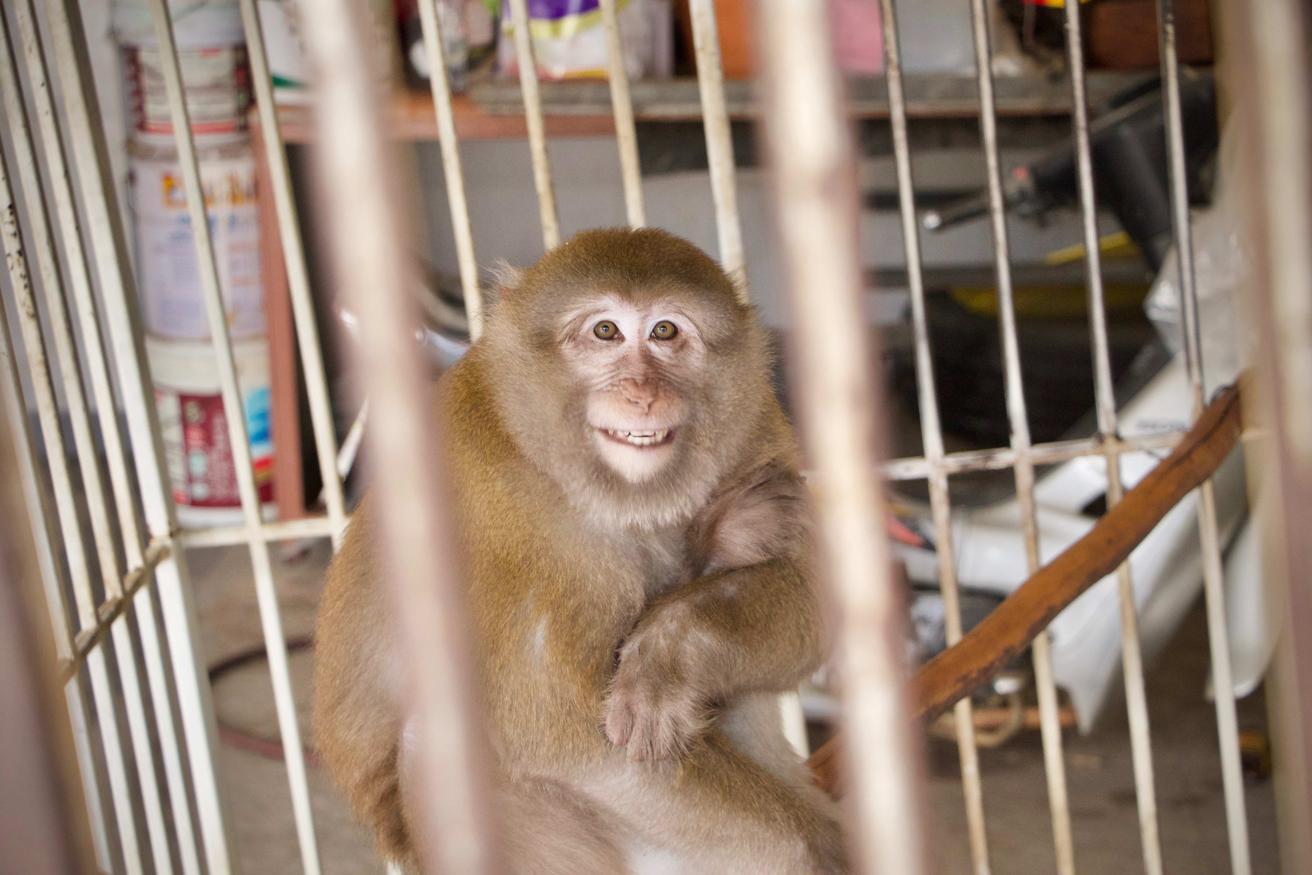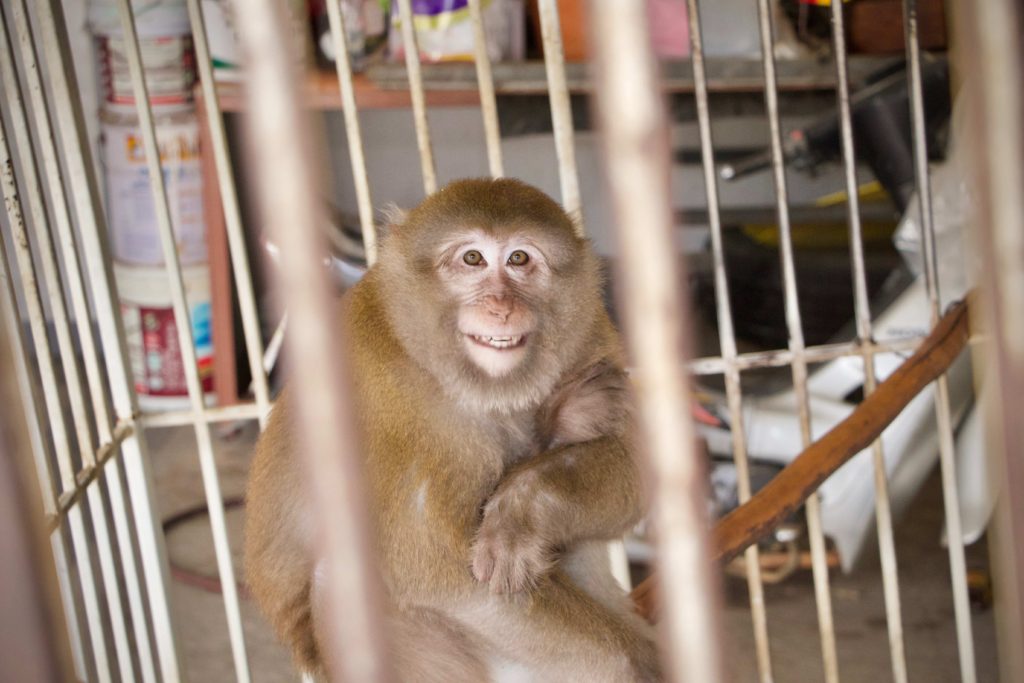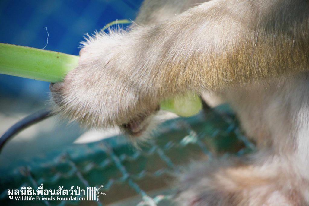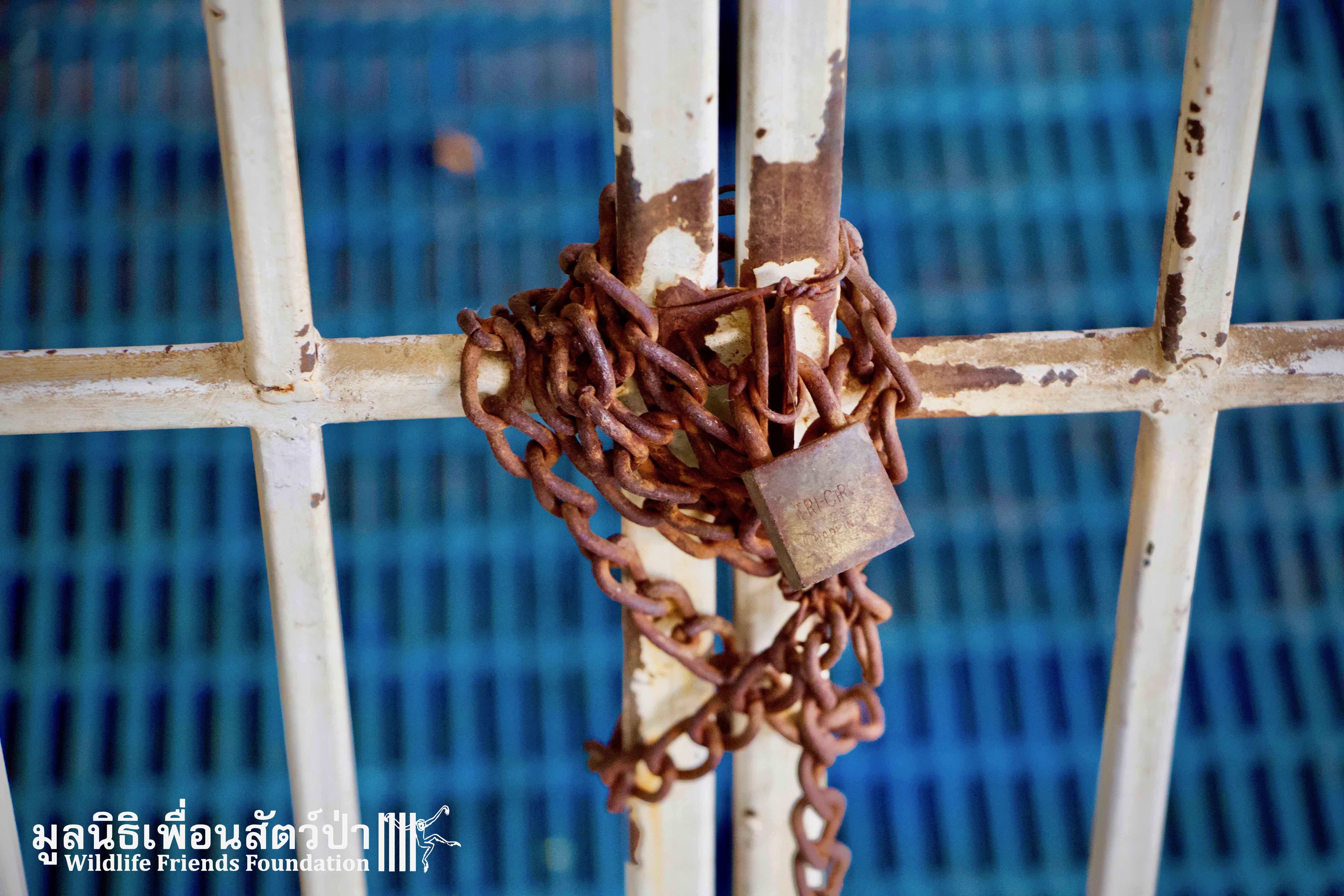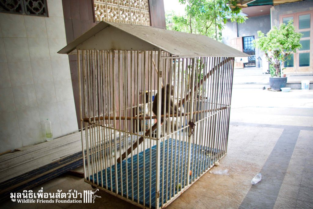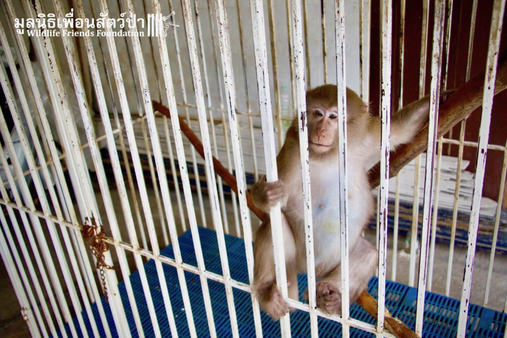 Here is the story of Somsri. A female Rhesus Macaque (Macaca mulatta) who is five-and-a-half-years old. The ‘owner’ of Somsri contacted WFFT to ask if we could provide a home for her after realising that they did not have the correct legal paperwork to keep her. She was kept for 5 years in a small empty cage, completely devoid of any physical or stimulating enrichment, her whole life so far has been pretty bleak. Her “home” was inside a garage, no sun, no natural substrate… the keys to the lock long since lost and the padlock and chain rusted together, a symbol of a forgotten prisoner in solitary confinement, with little chance of freedom. Next to her were two beautiful big dogs also confined to small cages whining and barking. They were also crying of their dream of freedom.