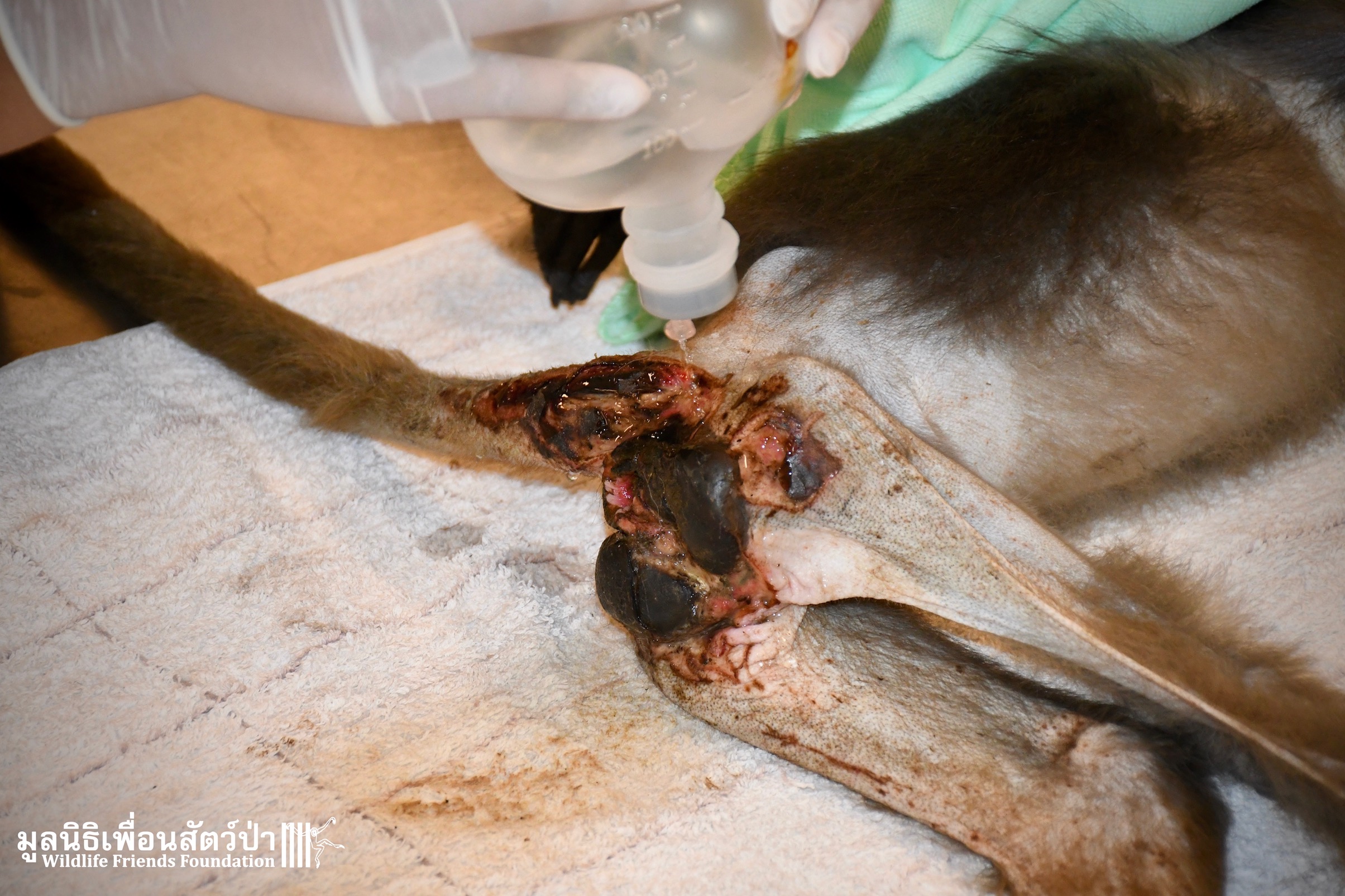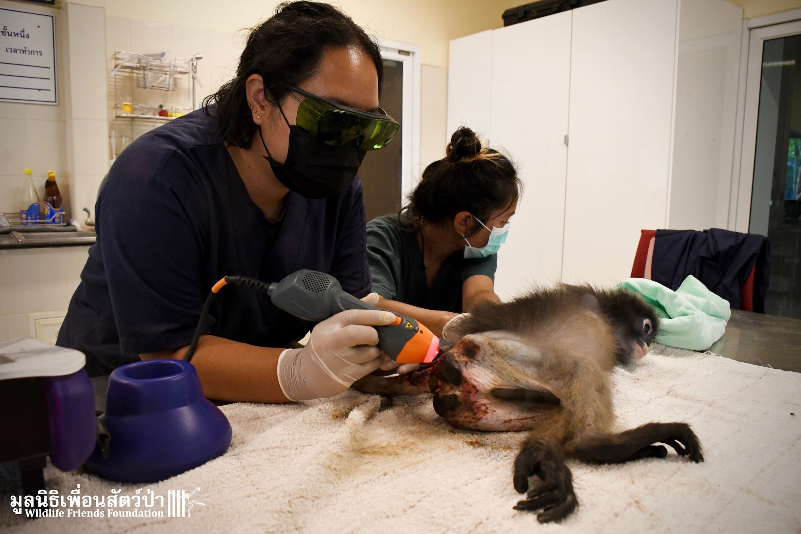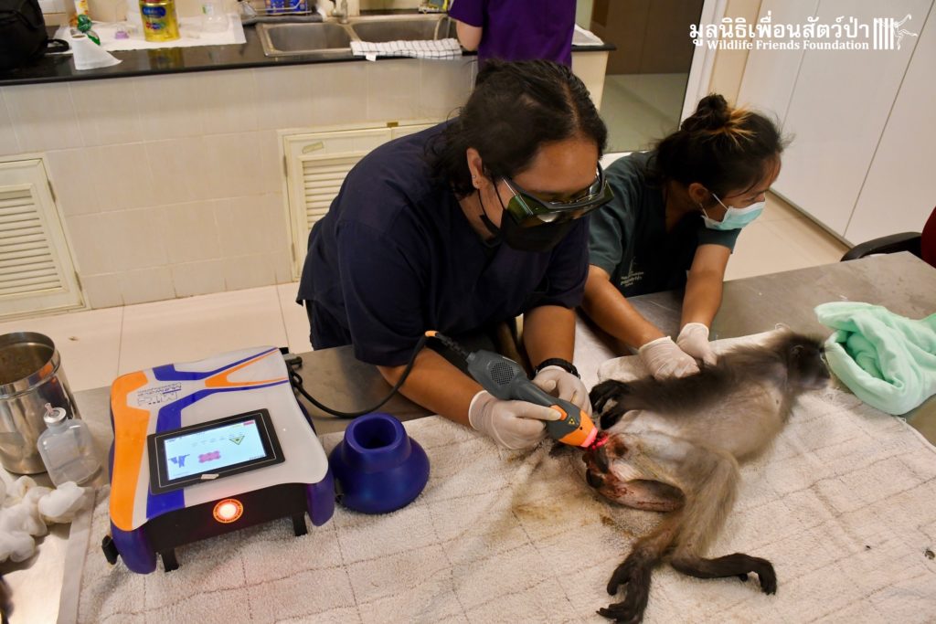 We drove 4 ½ hours south to rescue Wendee. A domestic animal veterinarian close to where she was found gave her an initial examination and treatment. Thank you to Baan Nai Hua Vet Hospital for helping rescue her. Upon arrival to the WFFT Wildlife Hospital her wounds were cleaned, she was given pain relief and fluids, the WFFT Vet Team then set to work utilising a veterinary lazar we are currently renting. We only have this equipment for a few more weeks for treatment of other injured animals. Unfortunately we have to hand this machine back to the rental company due to lack of funds.