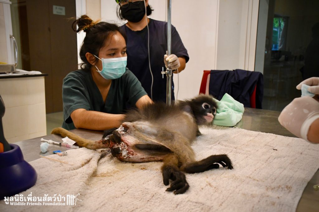 Meet Wendee, an endangered primate that arrived at WFFT yesterday evening. Wendee is a dusky langur, a species recently reclassified by the IUCN Redlist as an endangered species. She was found injured in a forested area close to a human settlement. She has sustained serious injuries on her lower back. She has lost the use in her hind limbs and most of the feeling in her lower spine. An X-ray was performed, no broken bones or other serious injuries were visible. Wendee is paralysed from the waist down. We suspect she has been bitten by feral dogs or hit by a vehicle of sorts.
