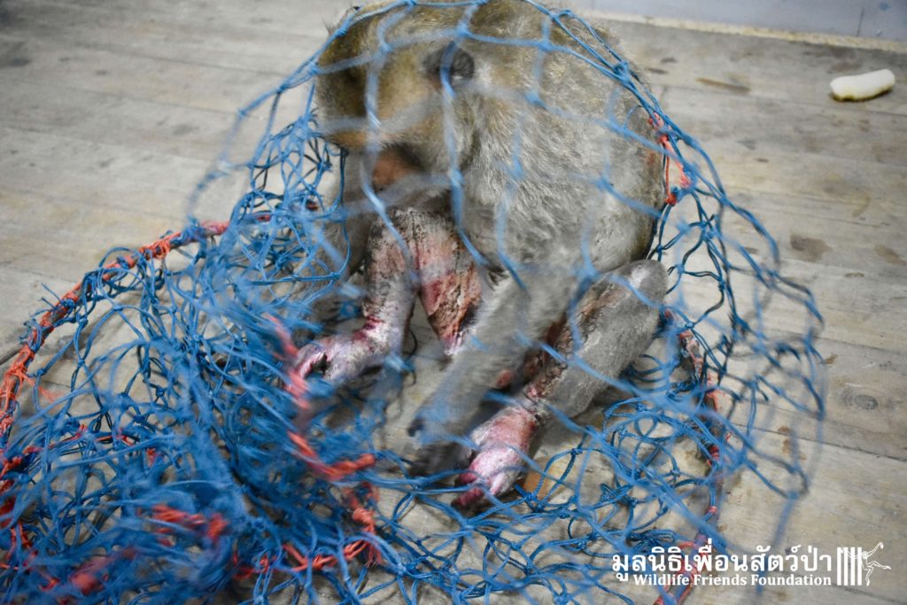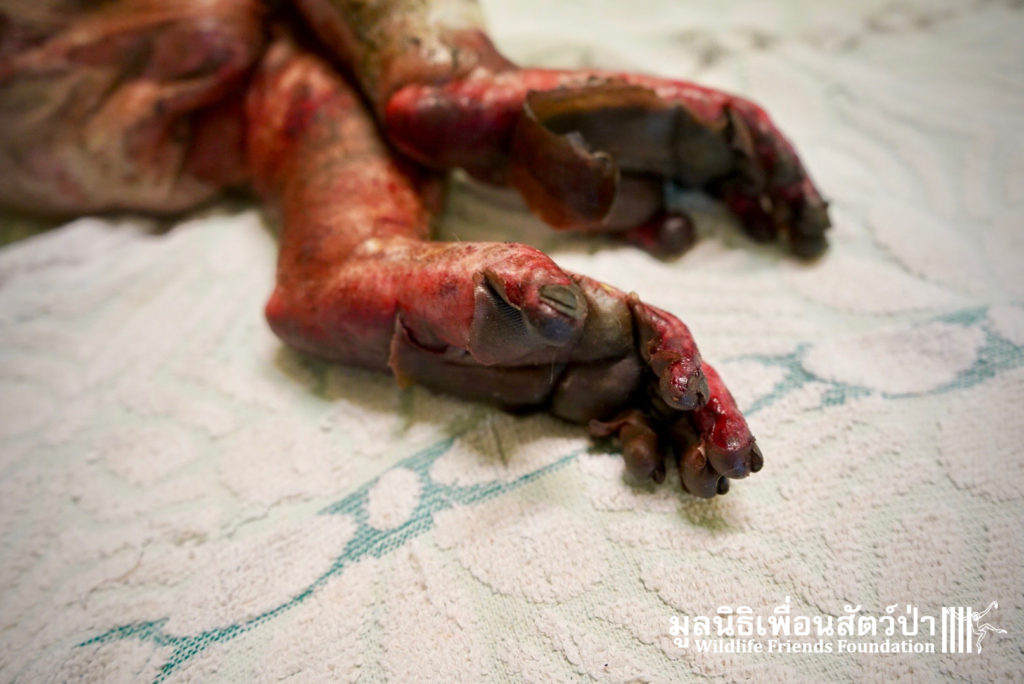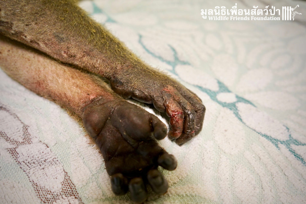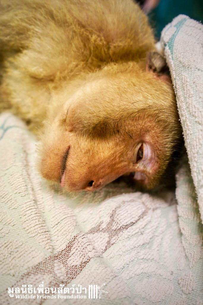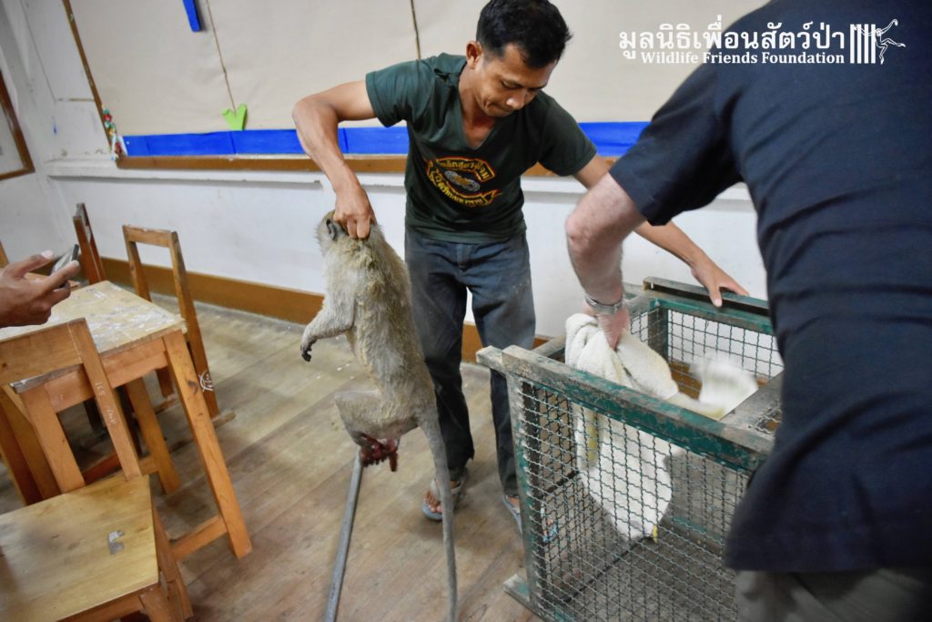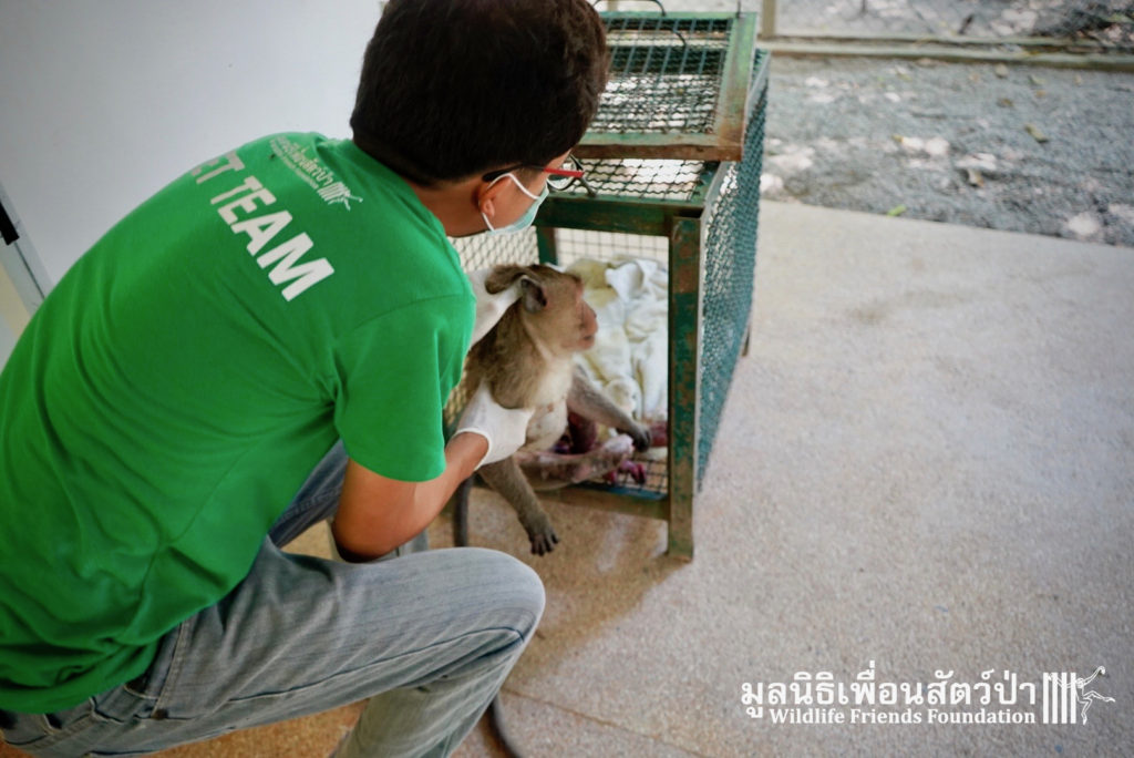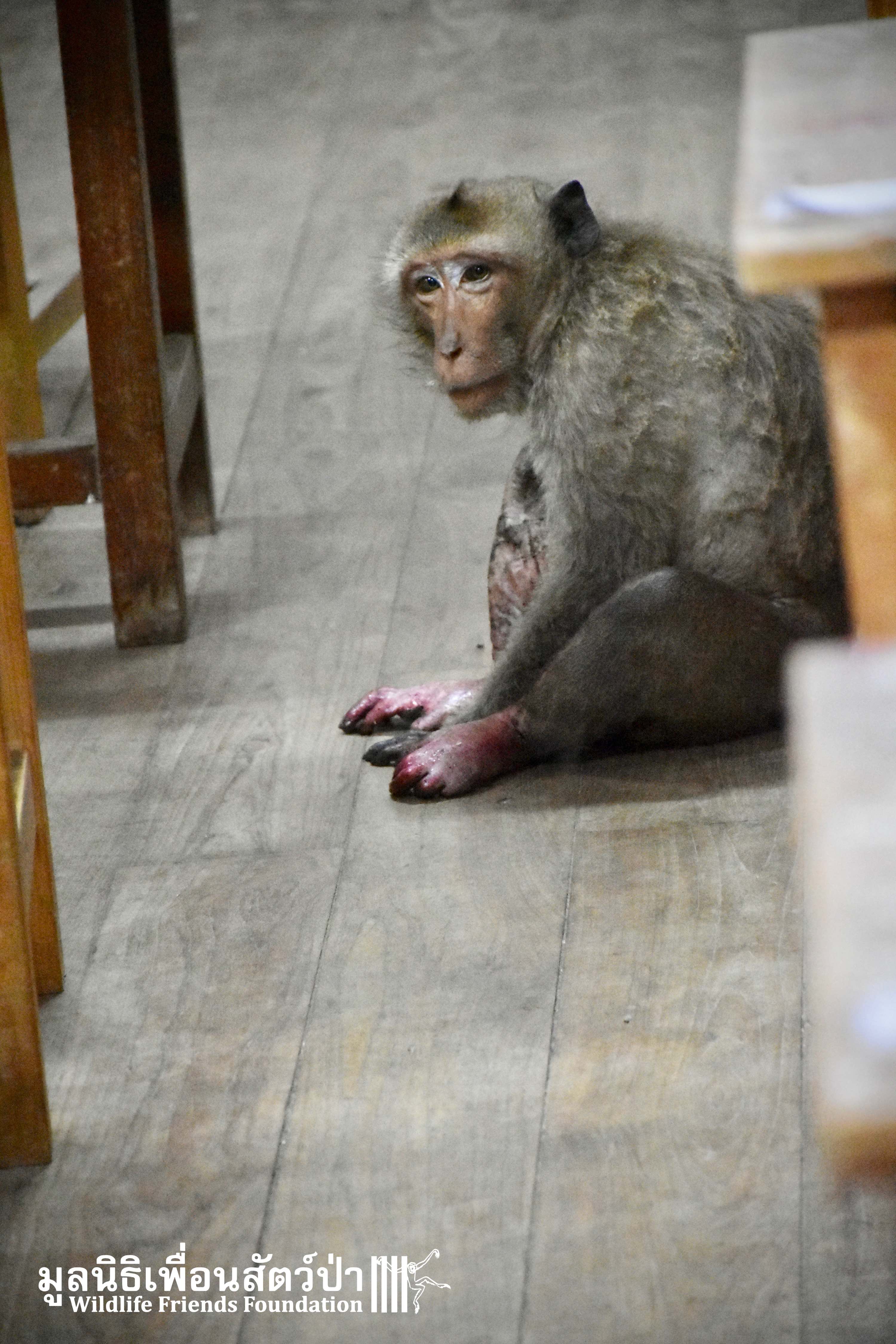 Yesterday we were called out to a monkey in urgent need of help. A wild adult male long-tailed macaque (Macaca fascicularis) had found refuge in a classroom of primary school after being electrocuted on exposed power lines. The school called us for help so the WFFT Wildlife Rescue Team headed out straight away. Upon arrival to the scene the team found a stressed animal that had sustained third degree burns to his arms and legs. A macaque locked in classroom is very dangerous animal. The team managed to capture him and rushed him back to WFFT for urgent veterinary treatment. We have named him ‘Gaston’. Gaston is currently under intensive care at the WFFT Wildlife Hospital. We are unsure if he will survive this horrifying ordeal. We will do everything we can to give him the best chance. Please send positive thoughts for Gaston. We will keep you posted.