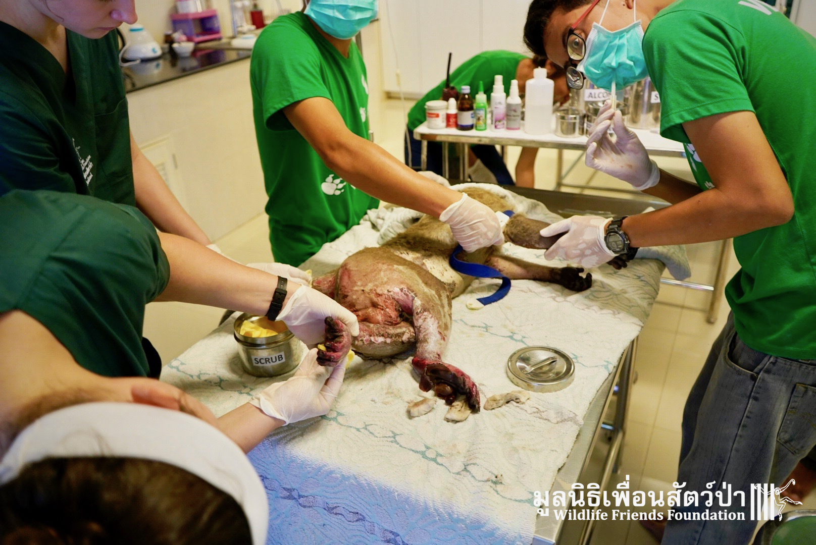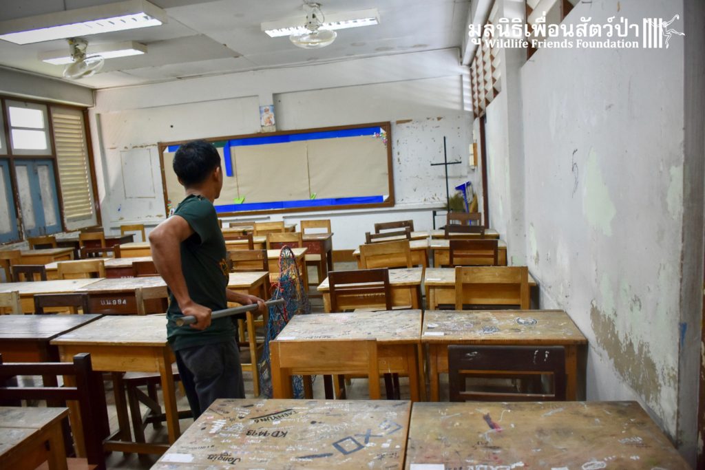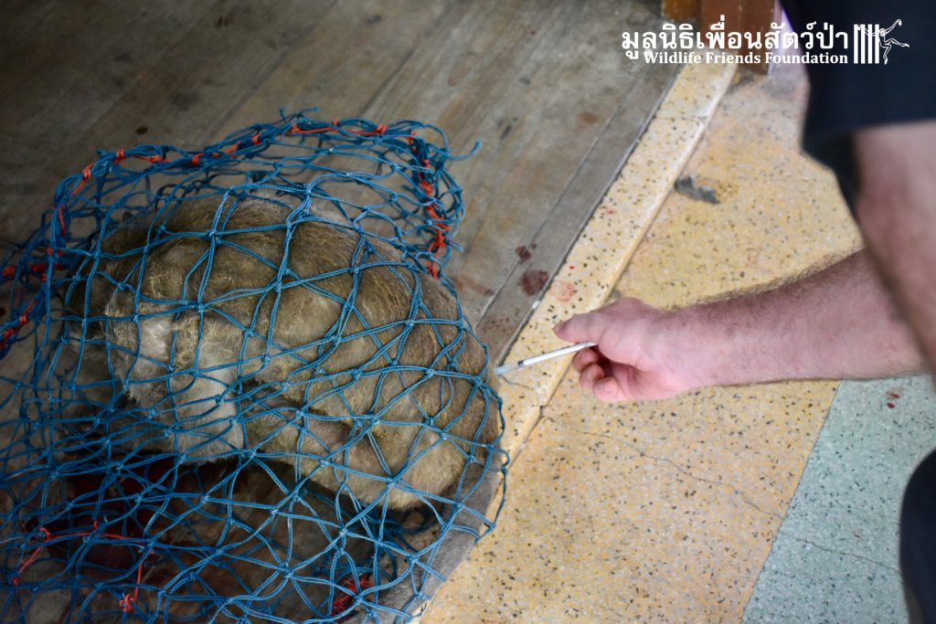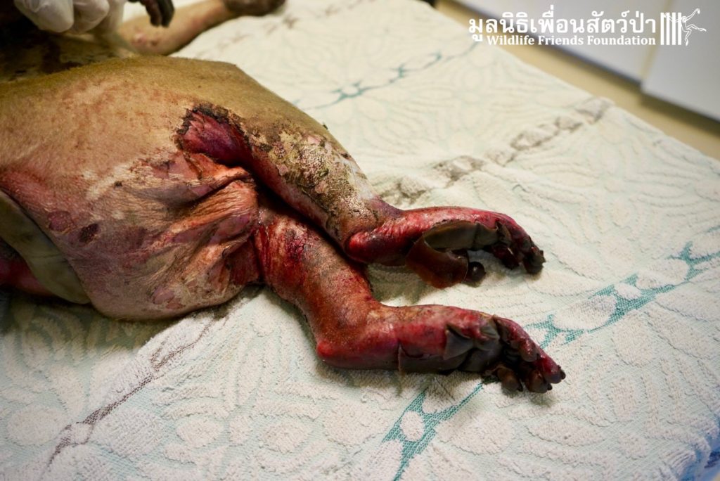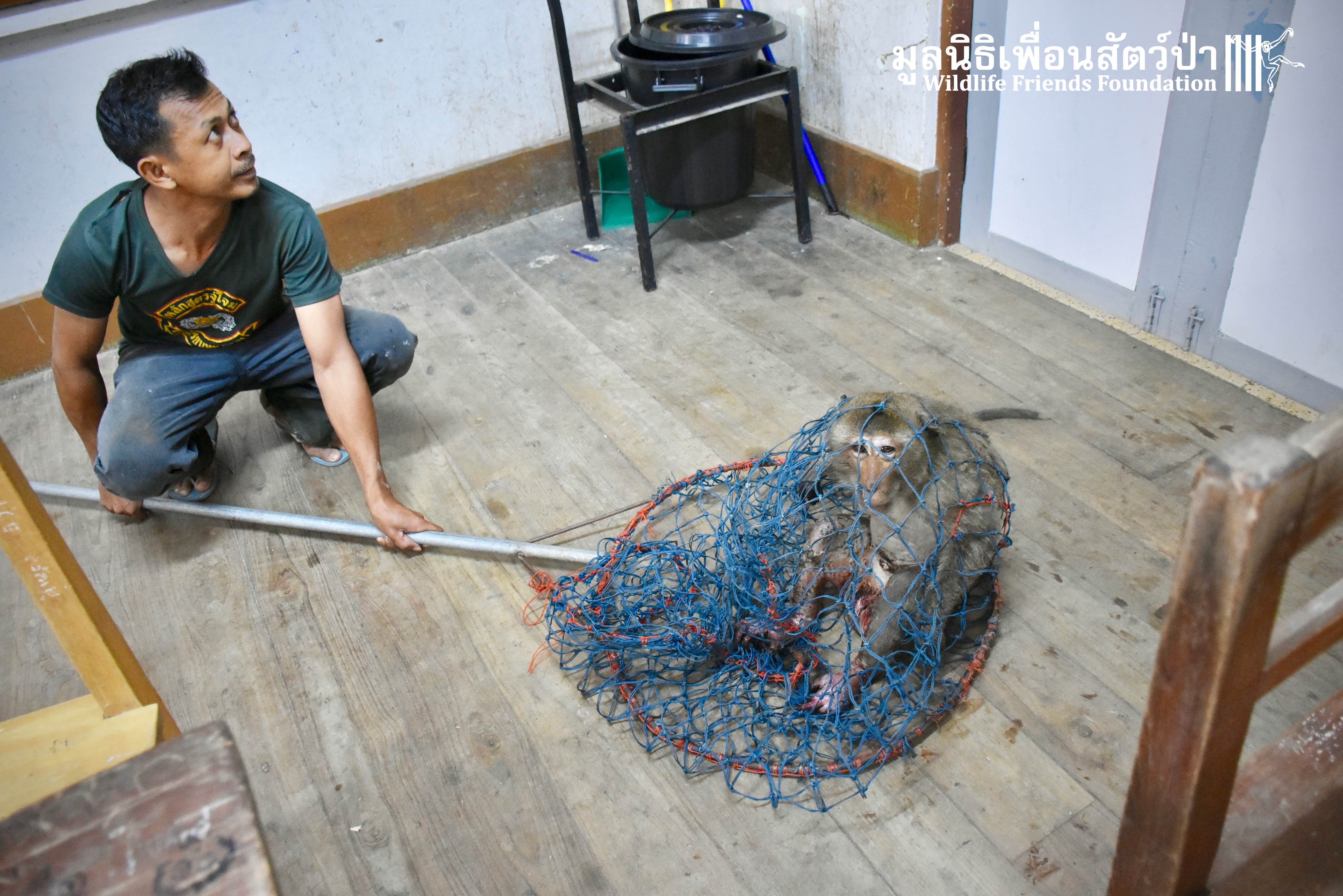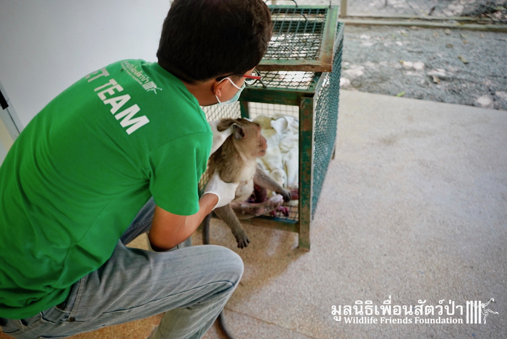 Yesterday we were called out to a monkey in urgent need of help. A wild adult male long-tailed macaque (Macaca fascicularis) had found refuge in a classroom of primary school after being electrocuted on exposed power lines. The school called us for help so the WFFT Wildlife Rescue Team headed out straight away. Upon arrival to the scene the team found a stressed animal that had sustained third degree burns to his arms and legs. A macaque locked in classroom is very dangerous animal. The team managed to capture him and rushed him back to WFFT for urgent veterinary treatment. We have named him ‘Gaston’. Gaston is currently under intensive care at the WFFT Wildlife Hospital. We are unsure if he will survive this horrifying ordeal. We will do everything we can to give him the best chance. Please send positive thoughts for Gaston. We will keep you posted.
