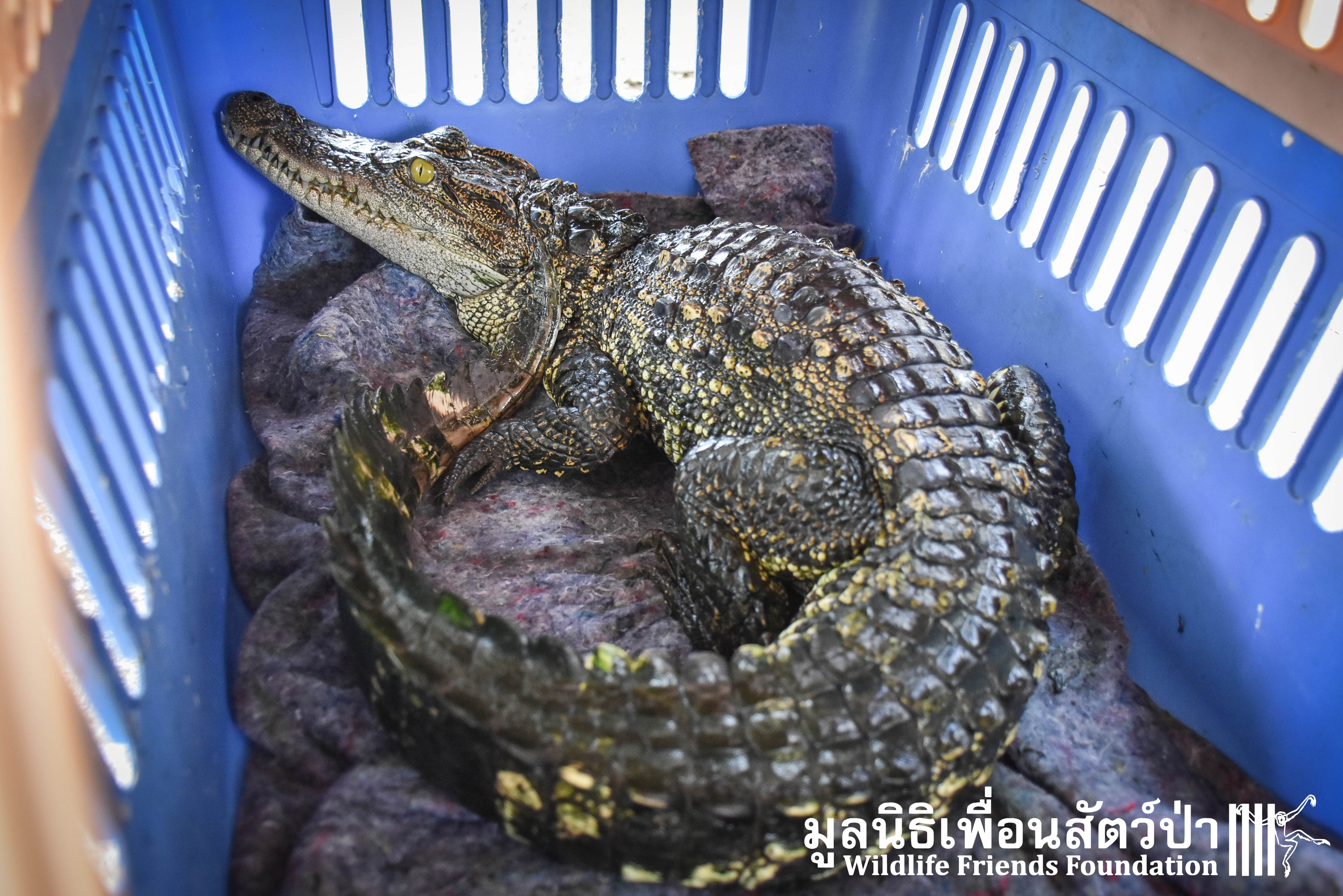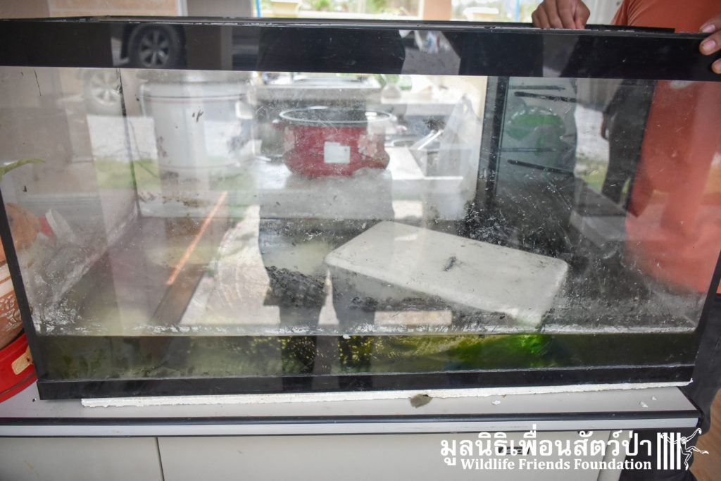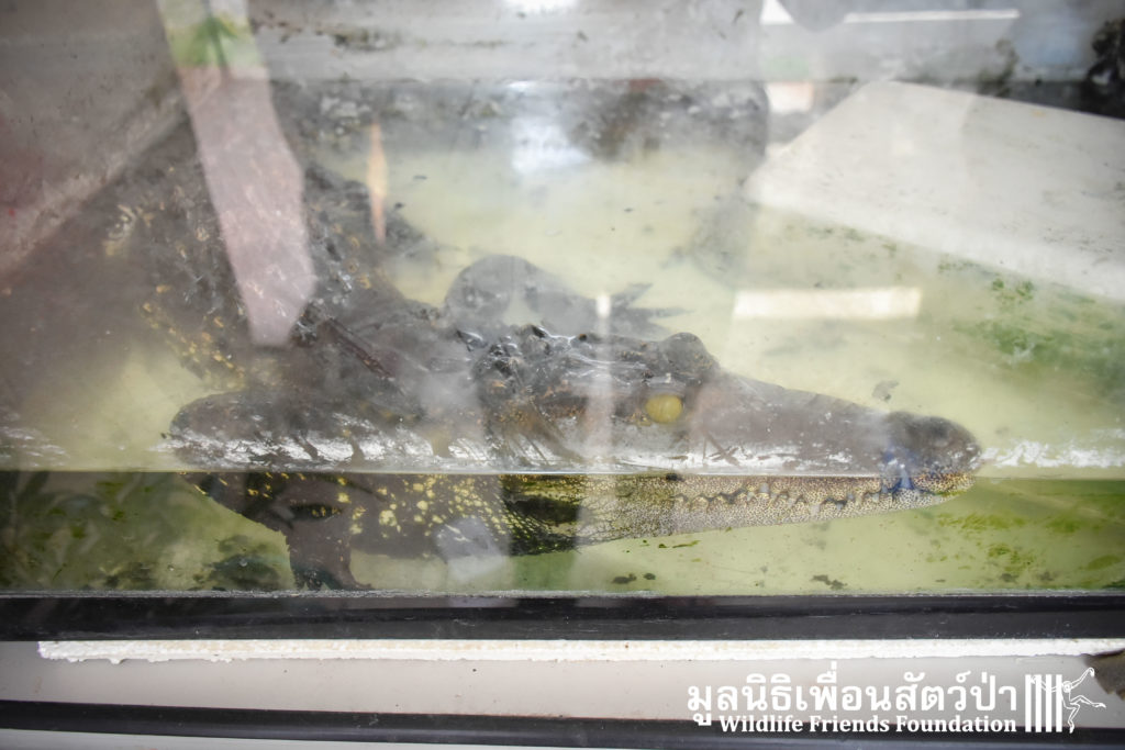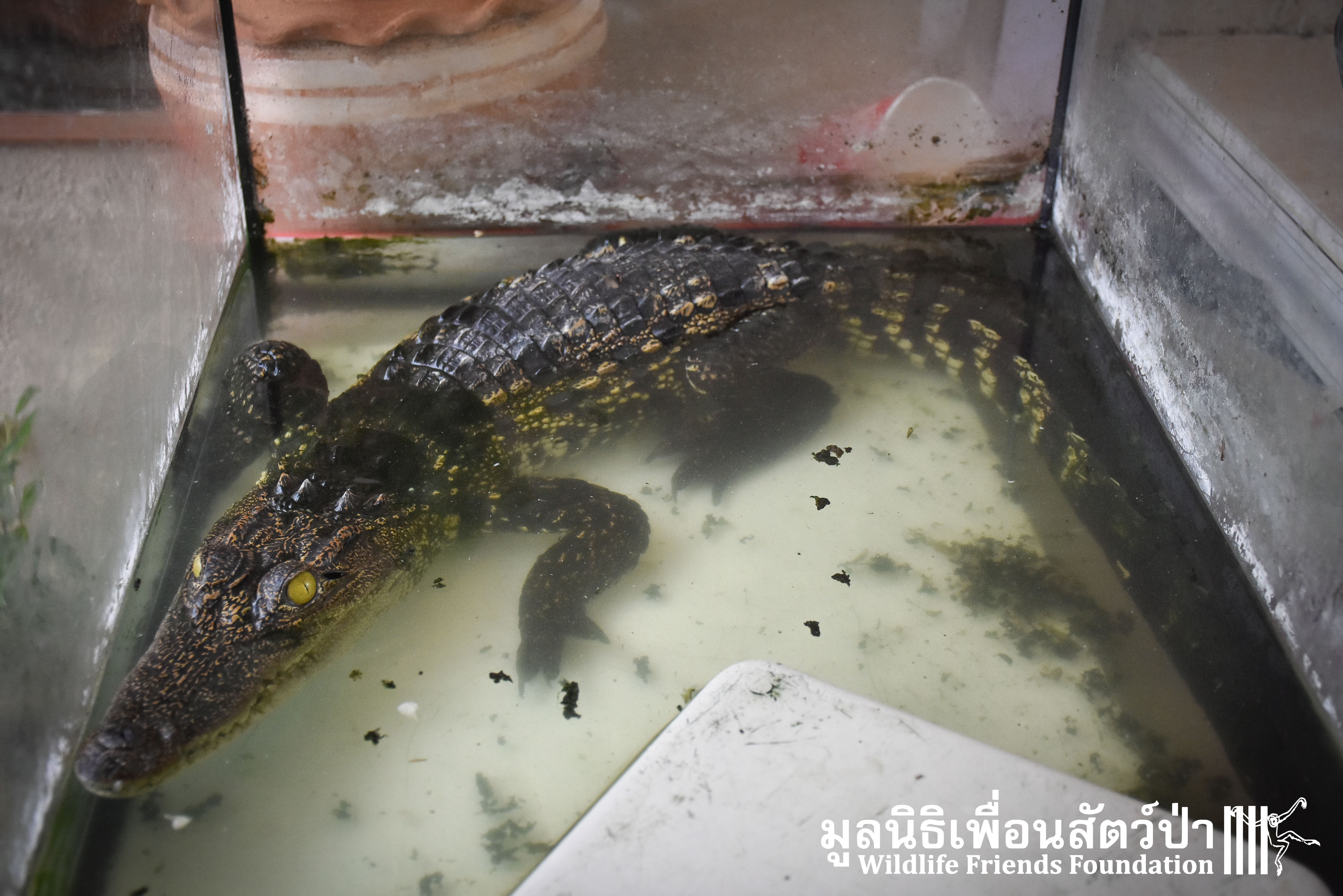 A few days ago we received a call from a lady who had a rather dangerous unwanted pet, a 3-year-old Siamese crocodile (Crocodylus siamensis), the WFFT Rescue Team headed out to investigate. The lady who had the crocodile told us that it was given to her son 3 years ago as a very small baby, since then it has lived in a small fish tank in her garden. As you can see from the pictures the crocodile had outgrown the inadequate home she had given him.