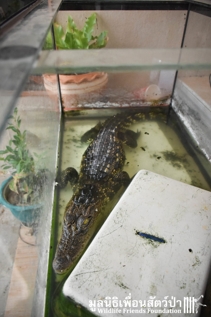 Keeping any wild animal as a pet is wrong and can have drastic consequences to wild populations of highly endangered species. Keeping large carnivorous predators as pets seems like madness, people often do not think that ‘the cute little’ animal will grow into something capable of causing death to its owner. Luckily for this little one, he is no longer confined to a tiny glass fish tank. We have named him Dory, he is settling into life at WFFT in a larger enclosure with a pool, rocks to climb and a dry area to bathe in the sun. He is currently next to another Siamese crocodile and we hope they will become firm friends in the future. Keep wildlife wild and not as pets.