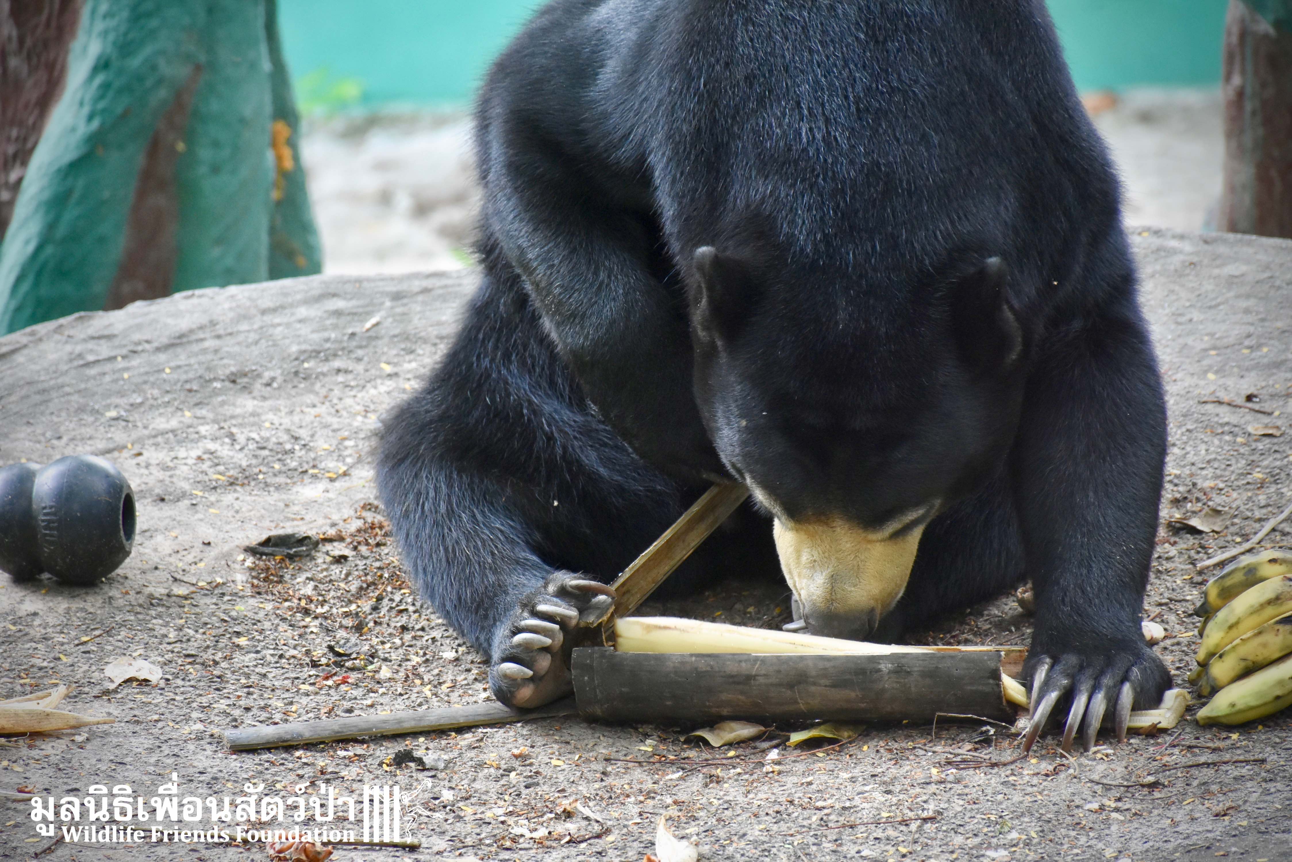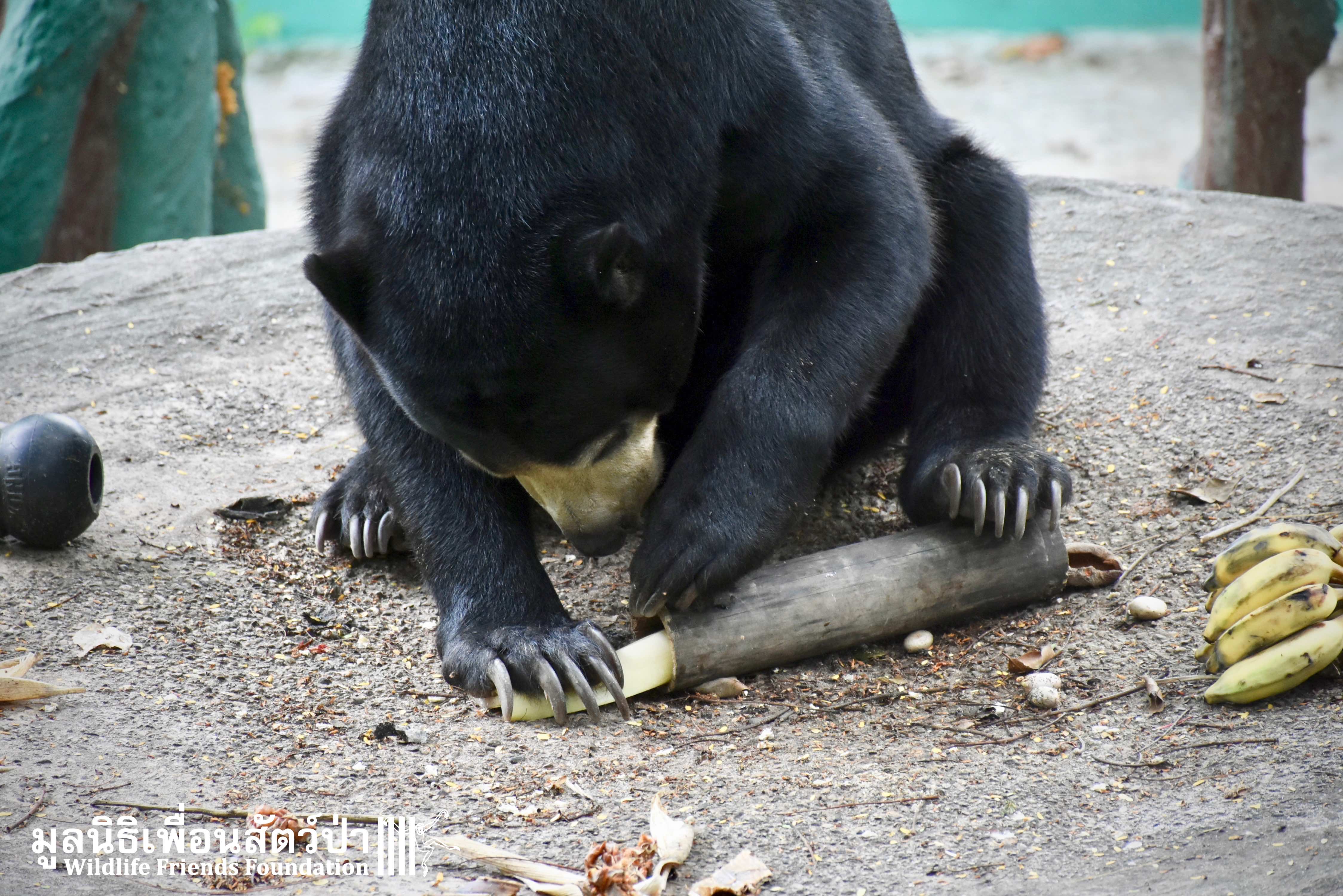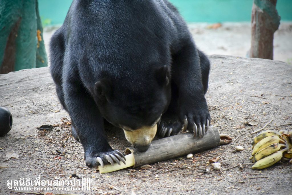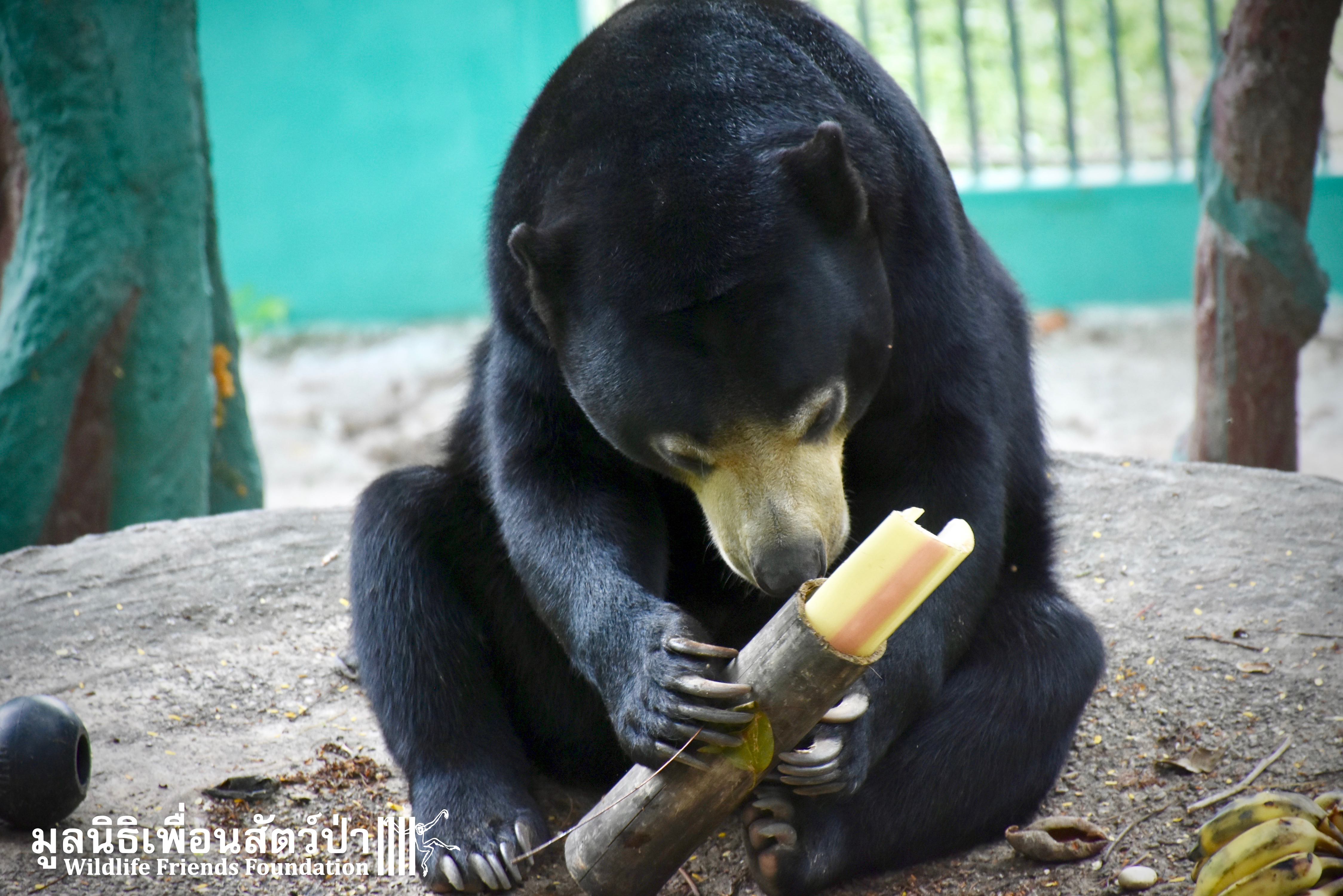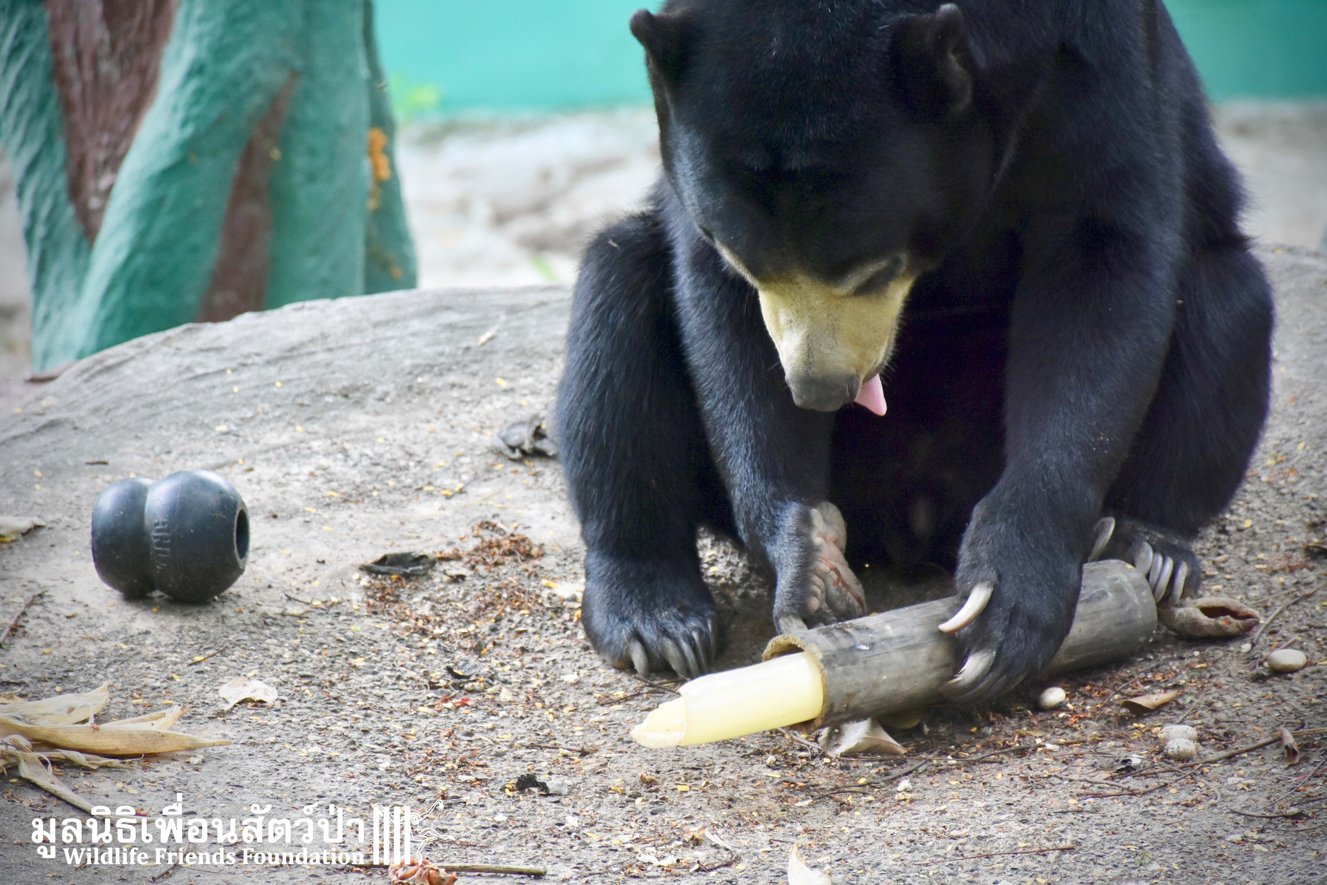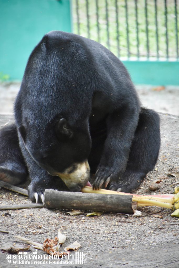 The least we can say is that our bears are more than bearly gourmets ! Our Wildlife Staff and volunteers know this ! Each day, in addition to their regular food, they have enrichments, like all the rescued animals of the WFFT center. Here to stimulated them and encourage their natural behaviour they receive treats too. And what better treat for a bear than honey?! And what better way than Bamboo sections to hide it and get our furry friends to rip it apart to reach the precious nectar, using claws and teeth. Thus providing mental and physical stimulation.