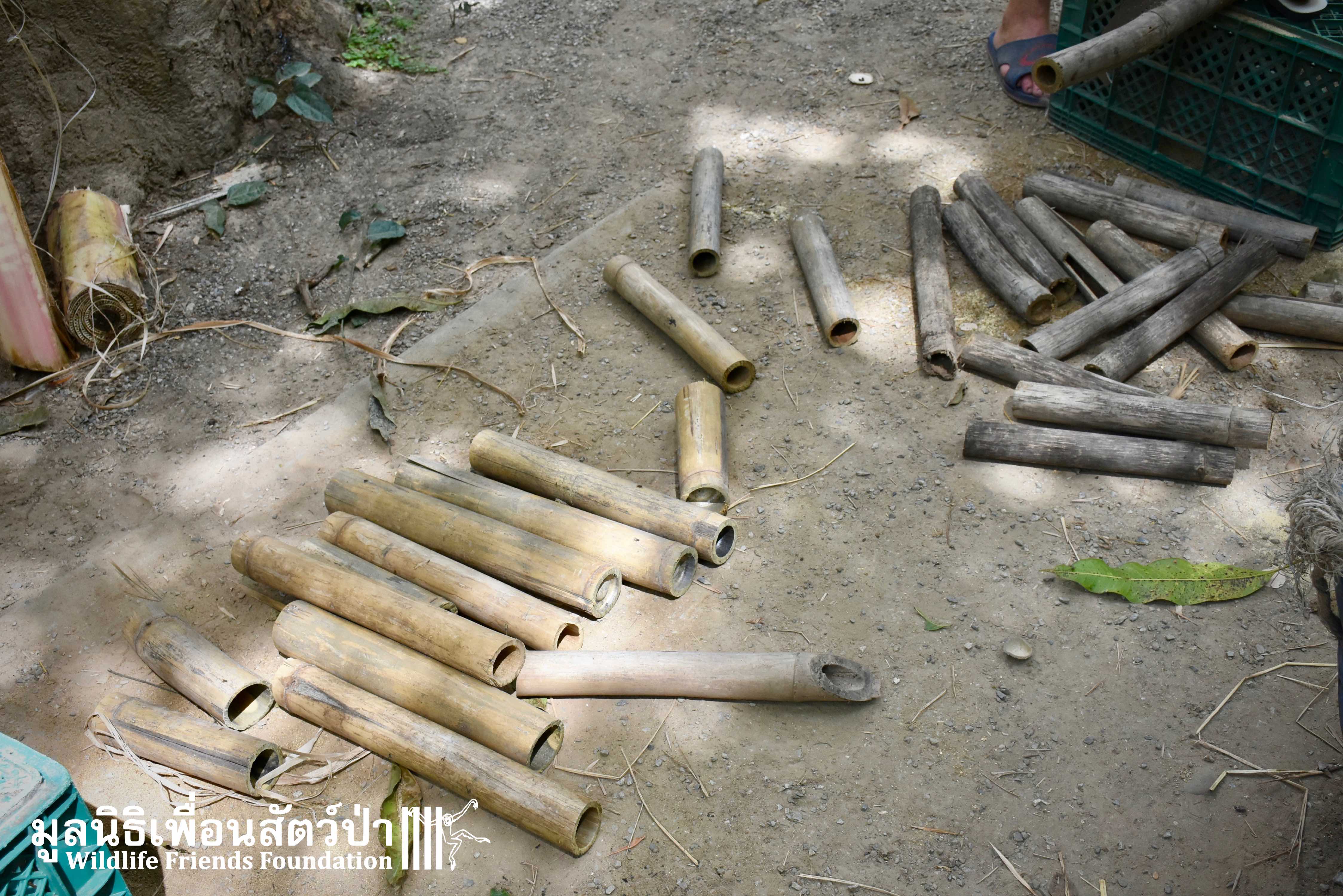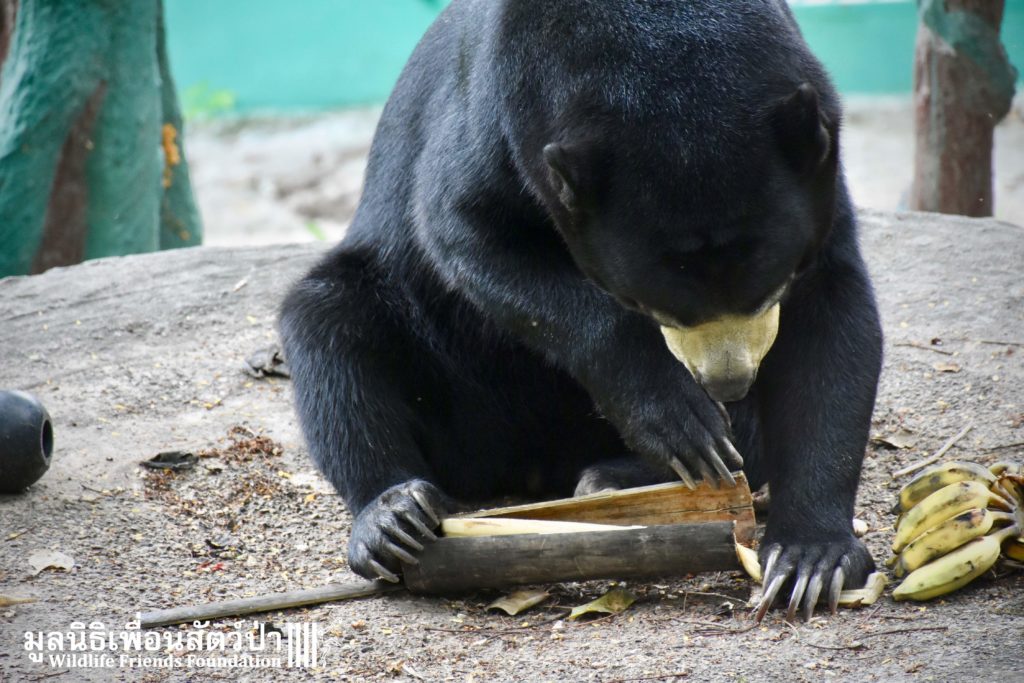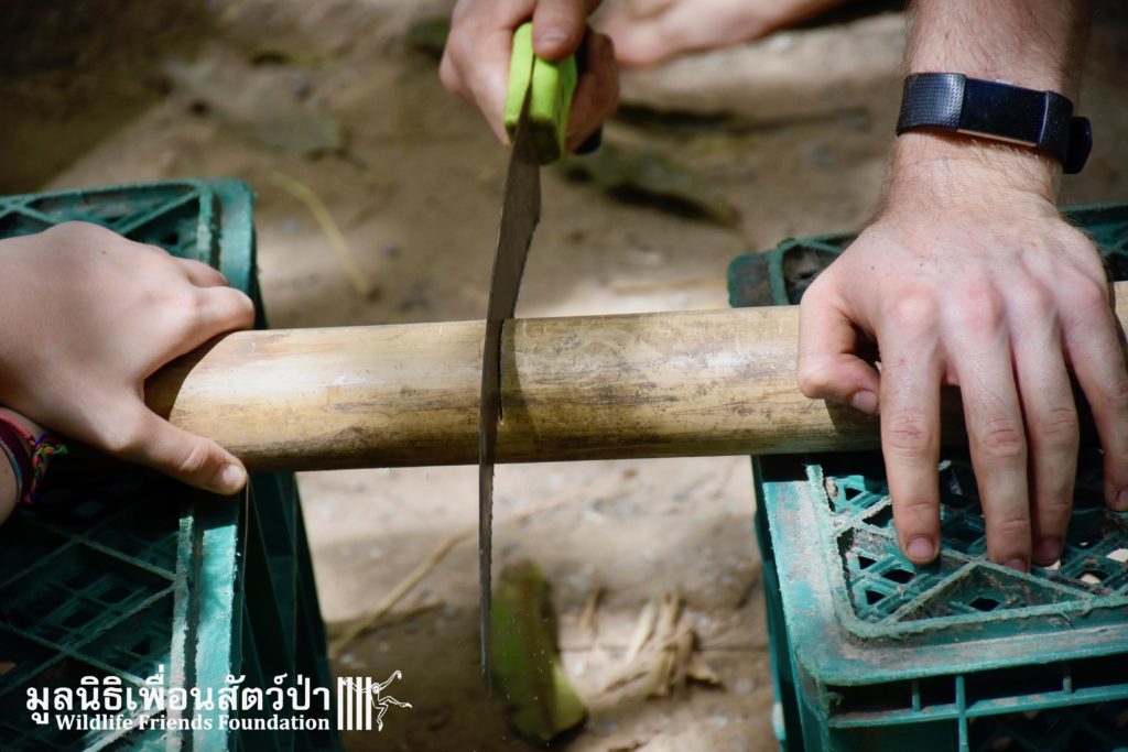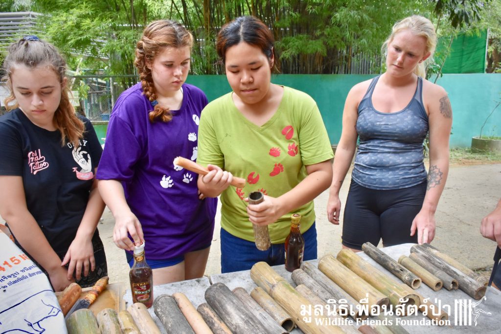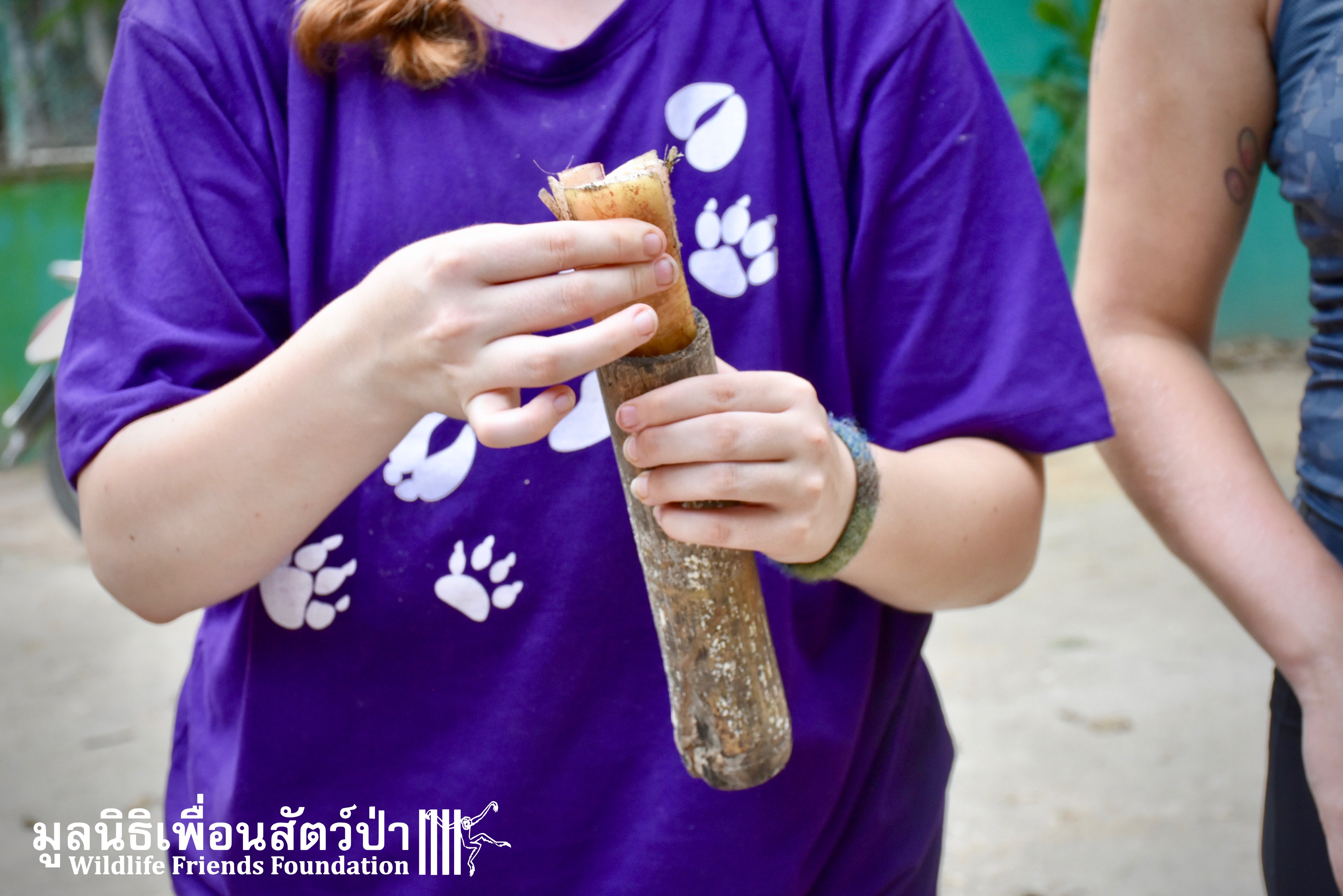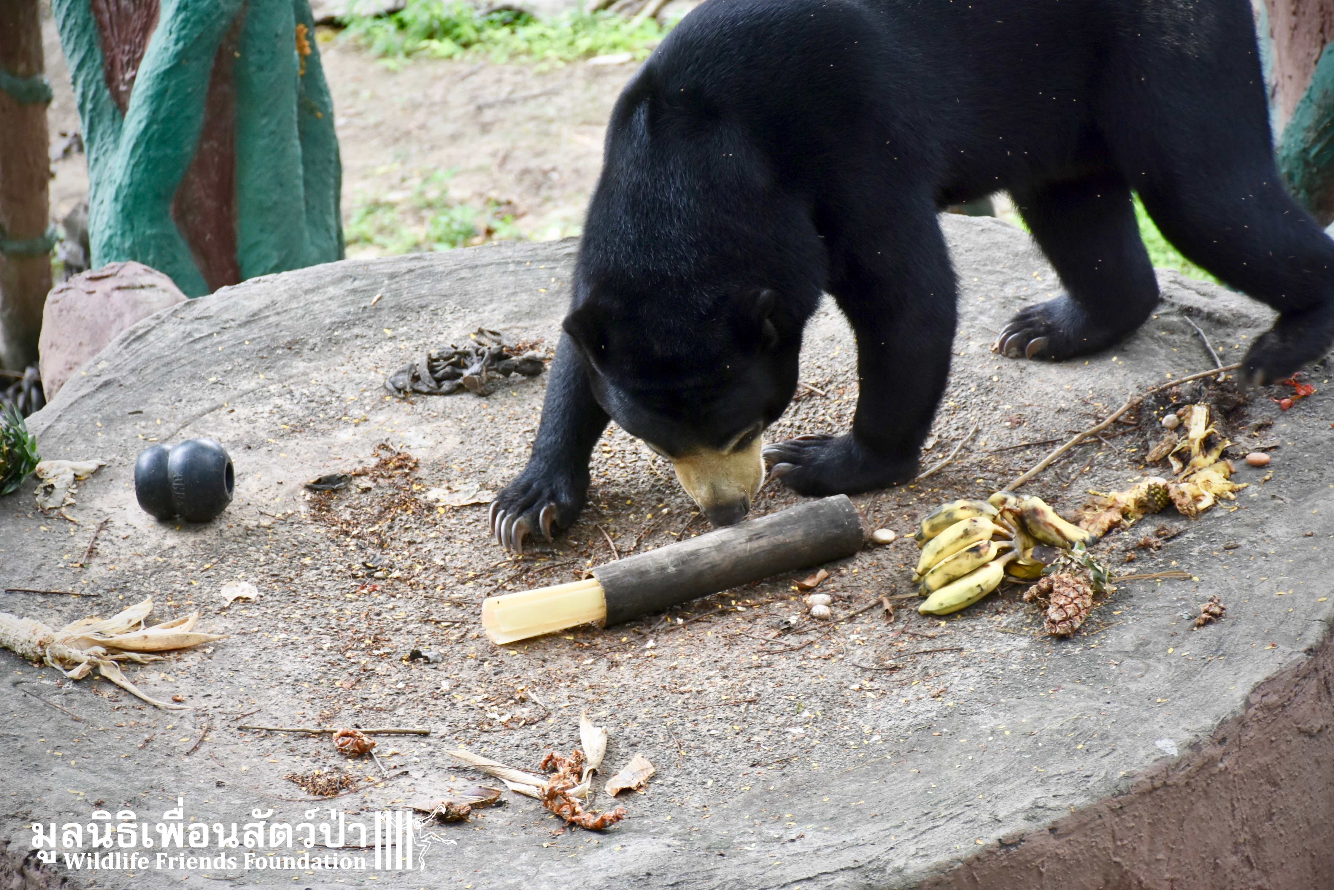 The least we can say is that our bears are more than bearly gourmets ! Our Wildlife Staff and volunteers know this ! Each day, in addition to their regular food, they have enrichments, like all the rescued animals of the WFFT center. Here to stimulated them and encourage their natural behaviour they receive treats too. And what better treat for a bear than honey?! And what better way than Bamboo sections to hide it and get our furry friends to rip it apart to reach the precious nectar, using claws and teeth. Thus providing mental and physical stimulation.