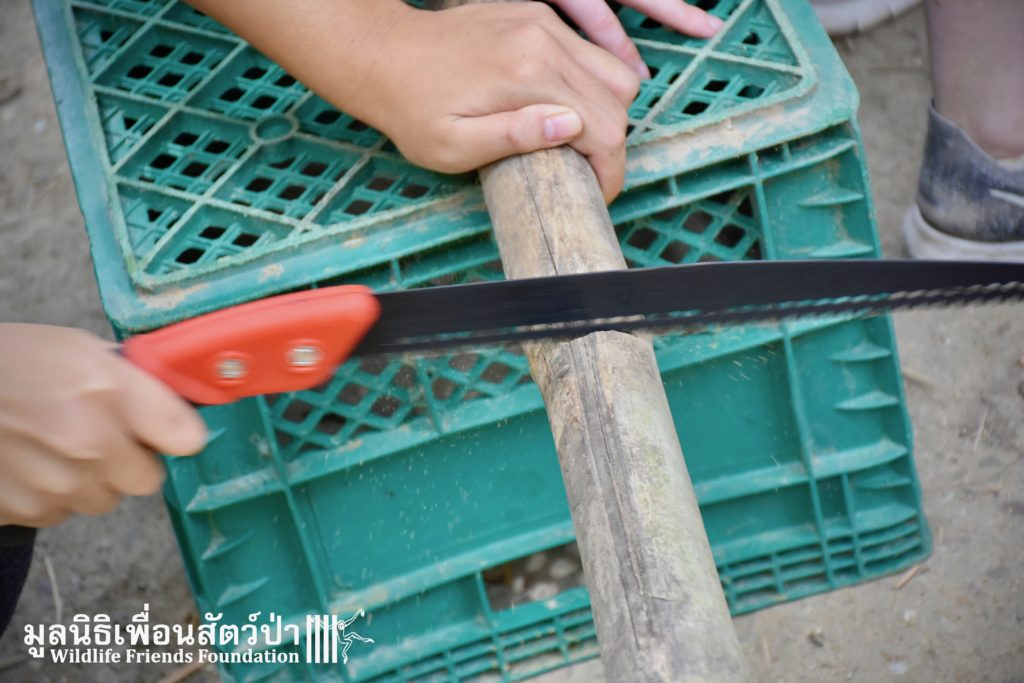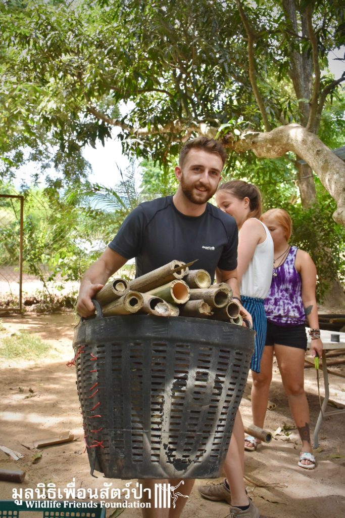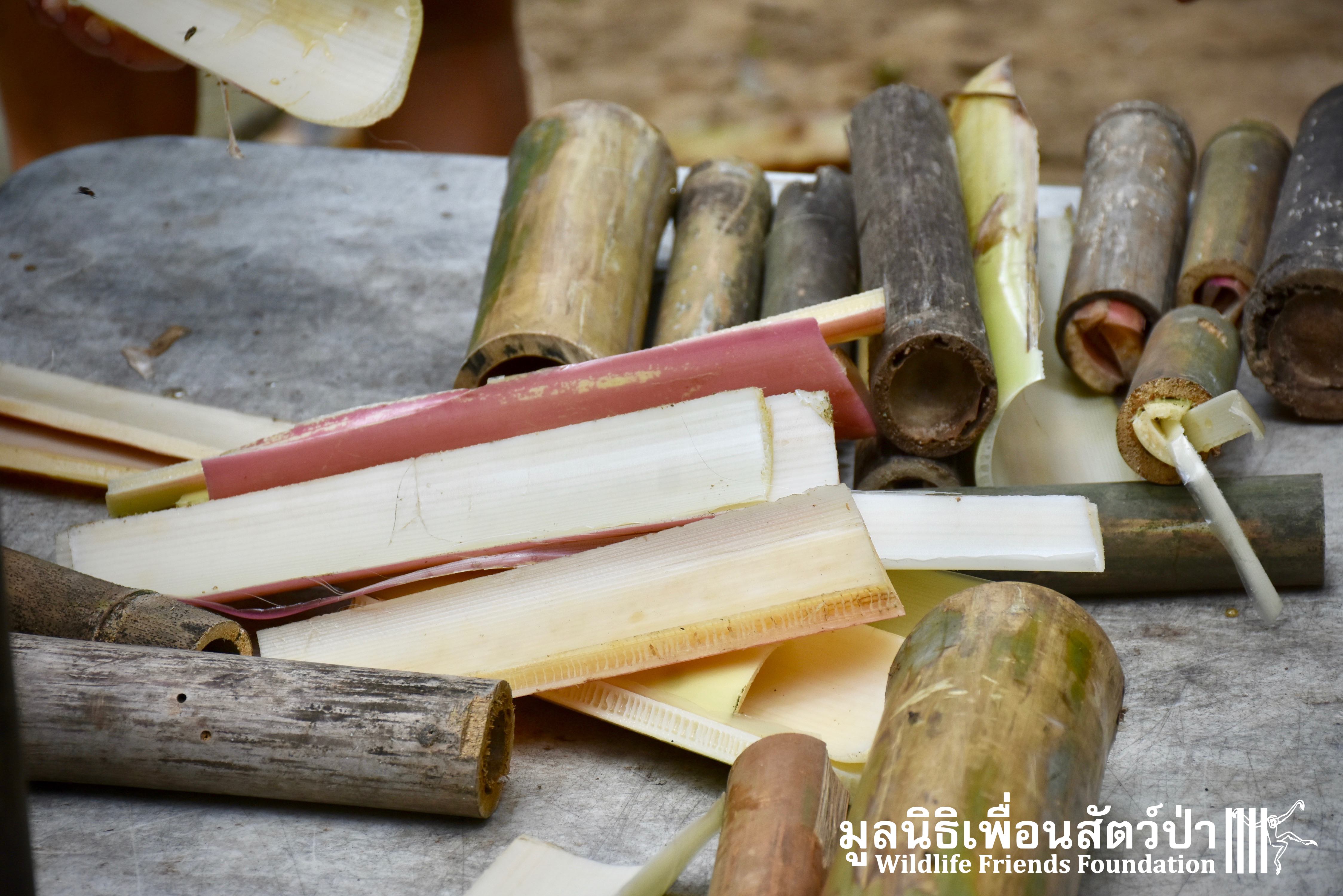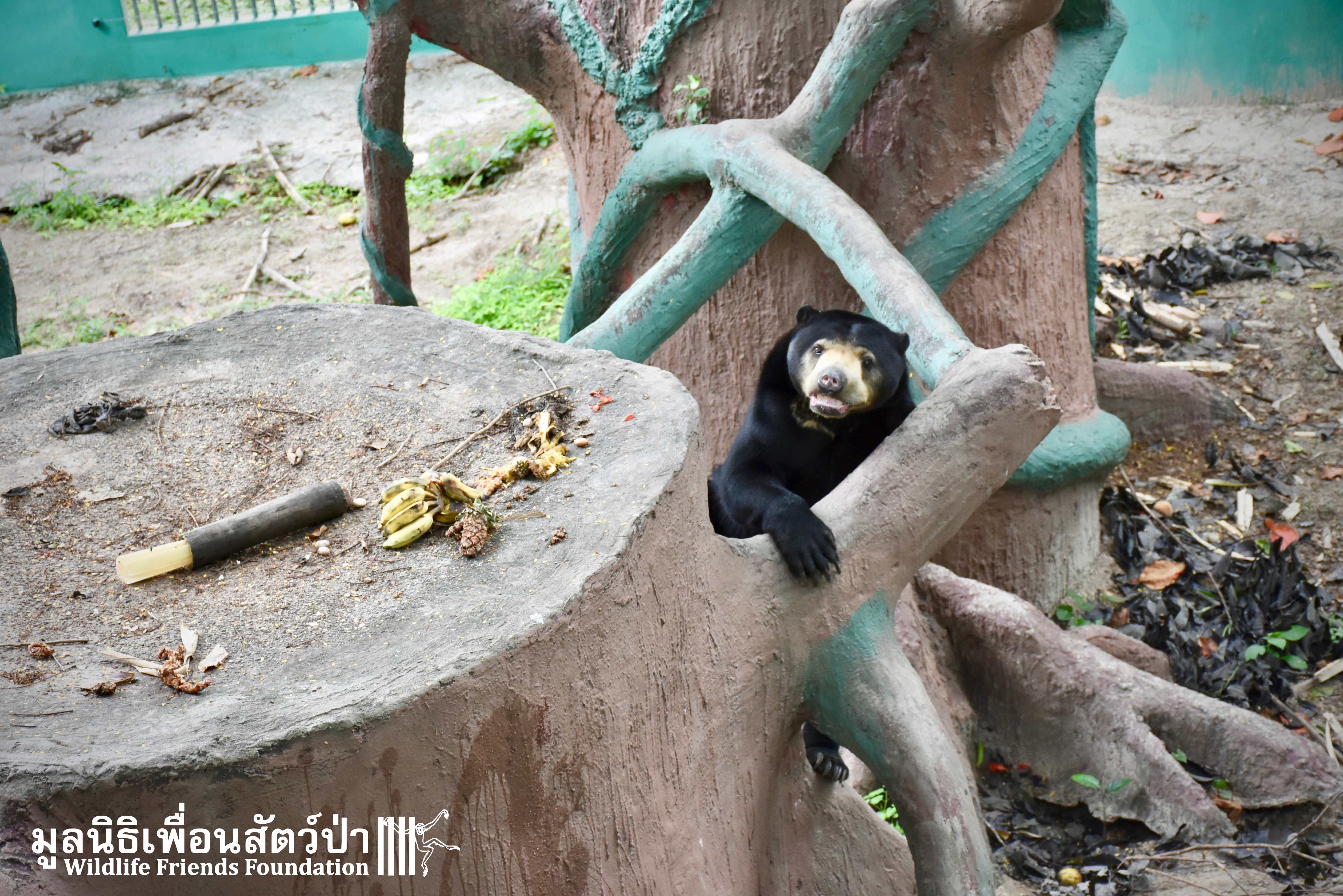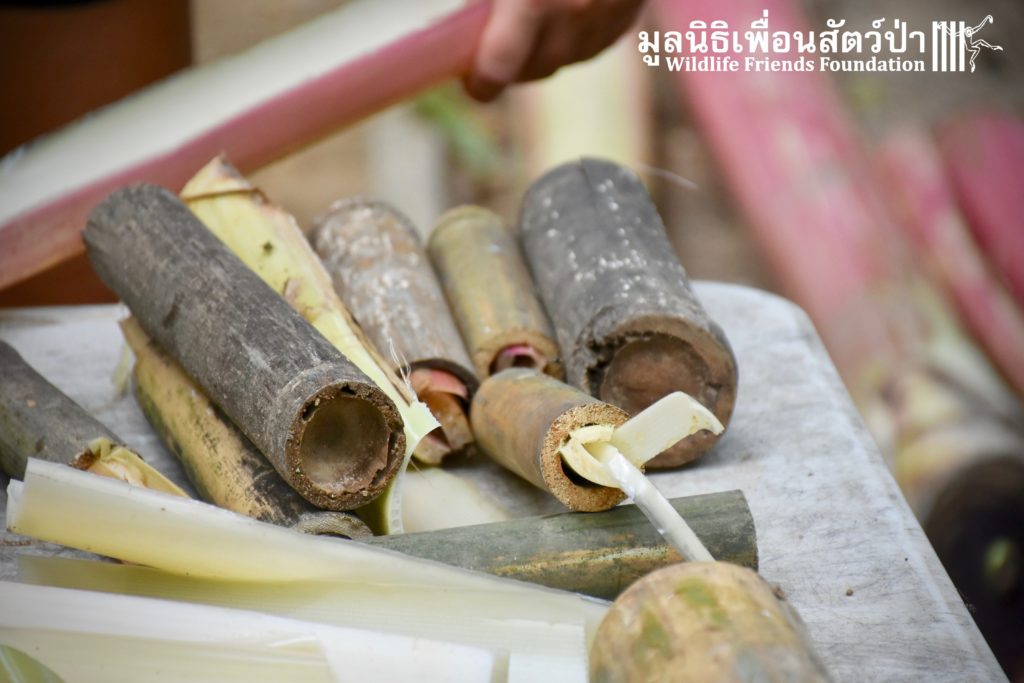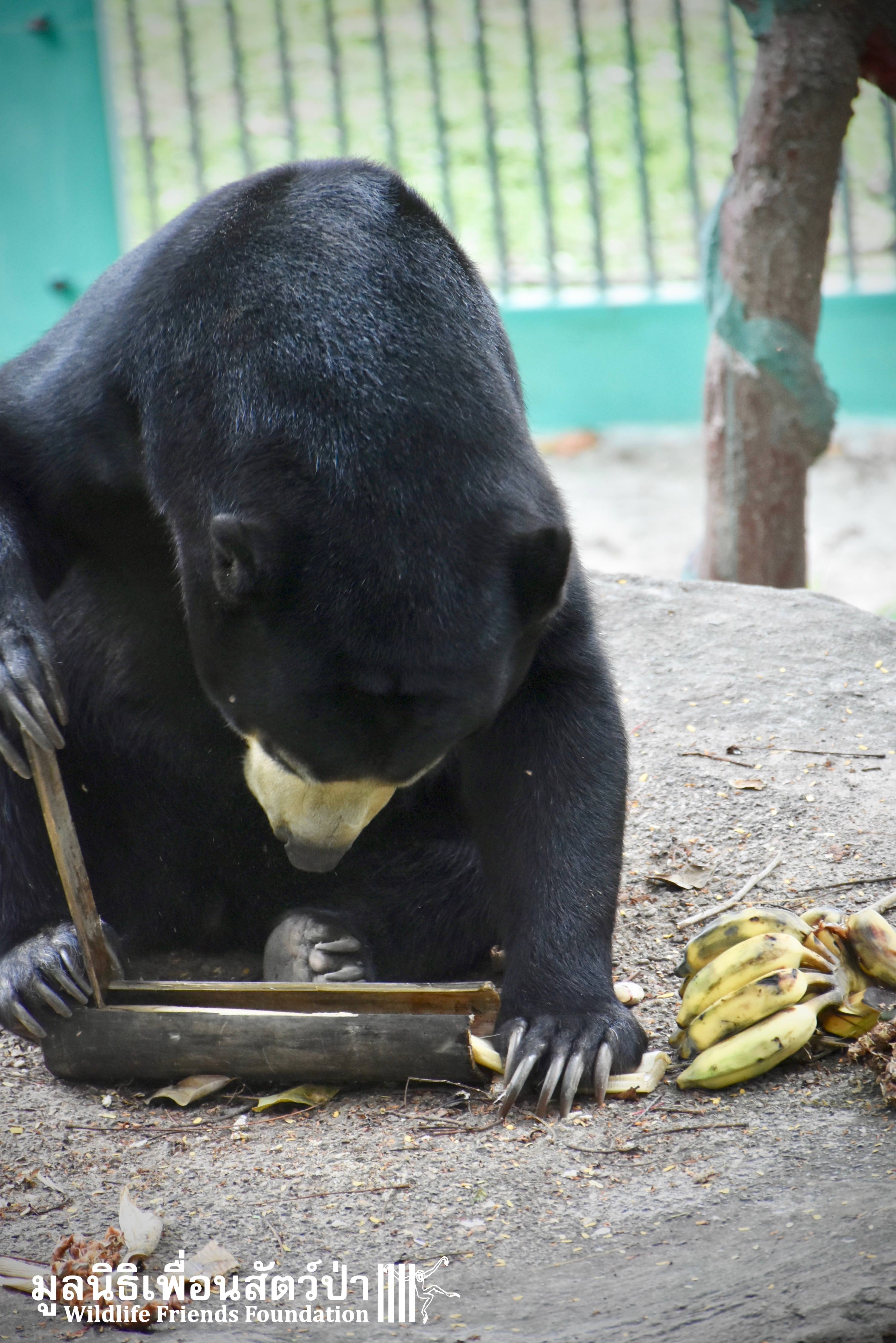 The least we can say is that our bears are more than bearly gourmets ! Our Wildlife Staff and volunteers know this ! Each day, in addition to their regular food, they have enrichments, like all the rescued animals of the WFFT center. Here to stimulated them and encourage their natural behaviour they receive treats too. And what better treat for a bear than honey?! And what better way than Bamboo sections to hide it and get our furry friends to rip it apart to reach the precious nectar, using claws and teeth. Thus providing mental and physical stimulation.