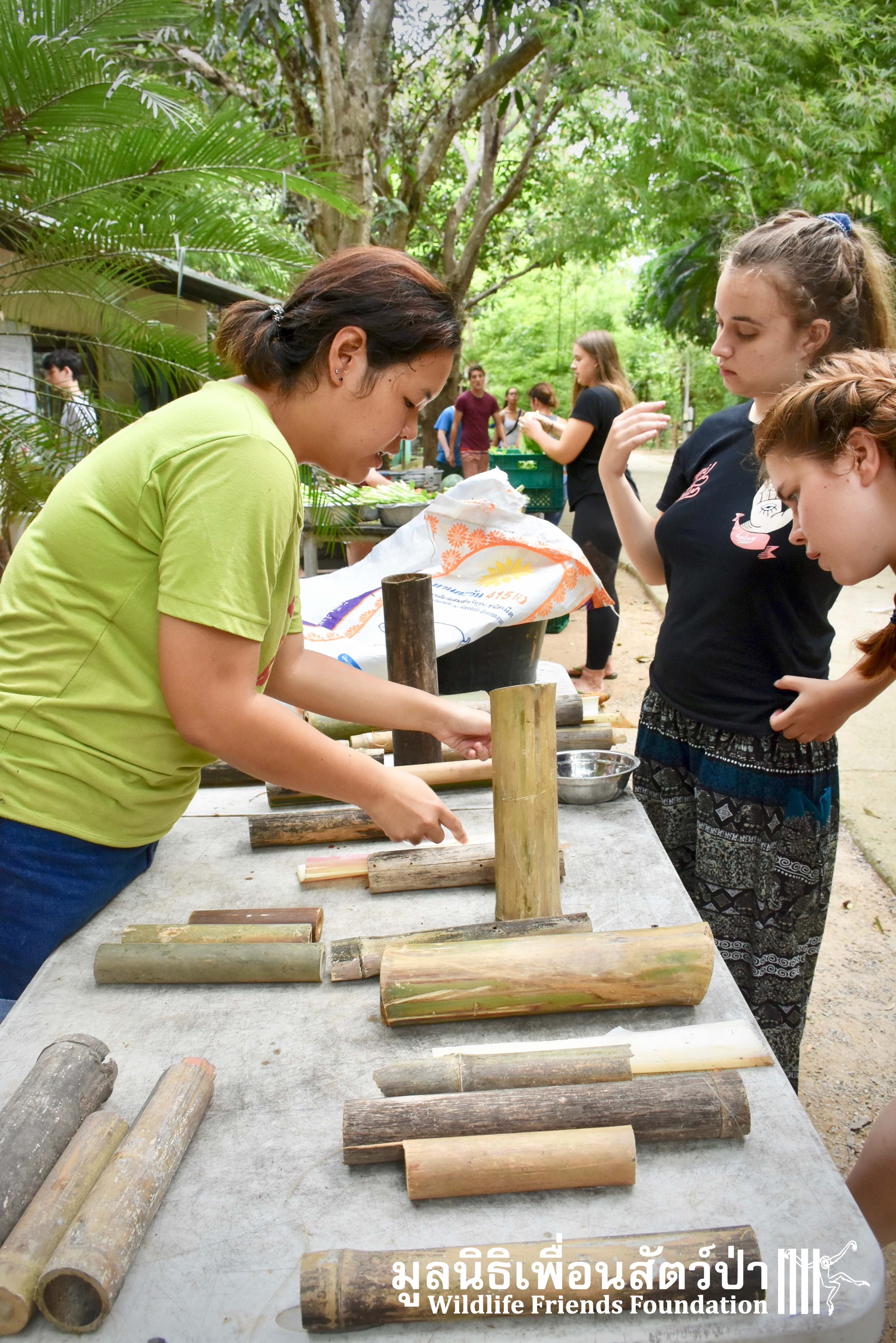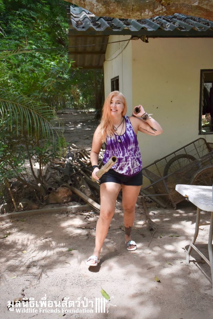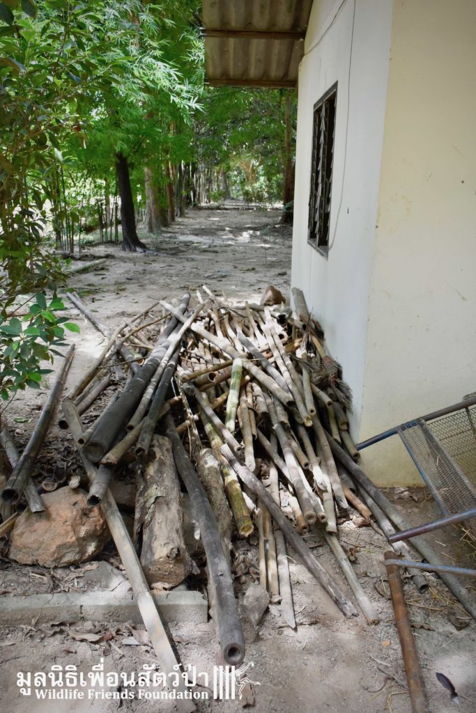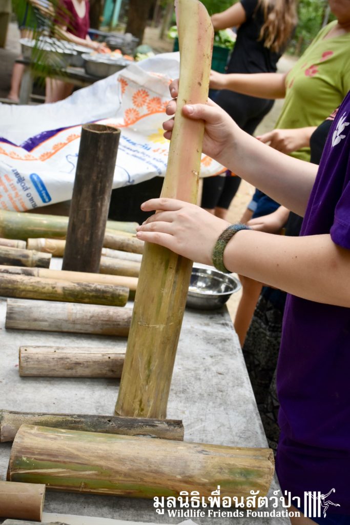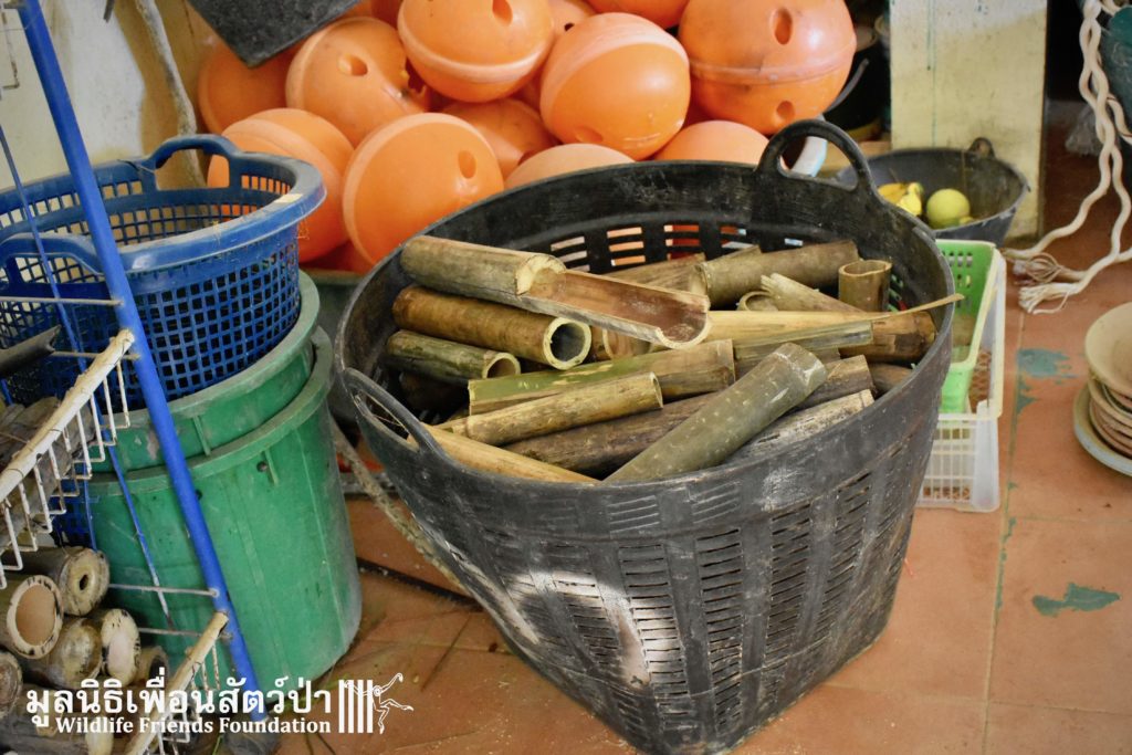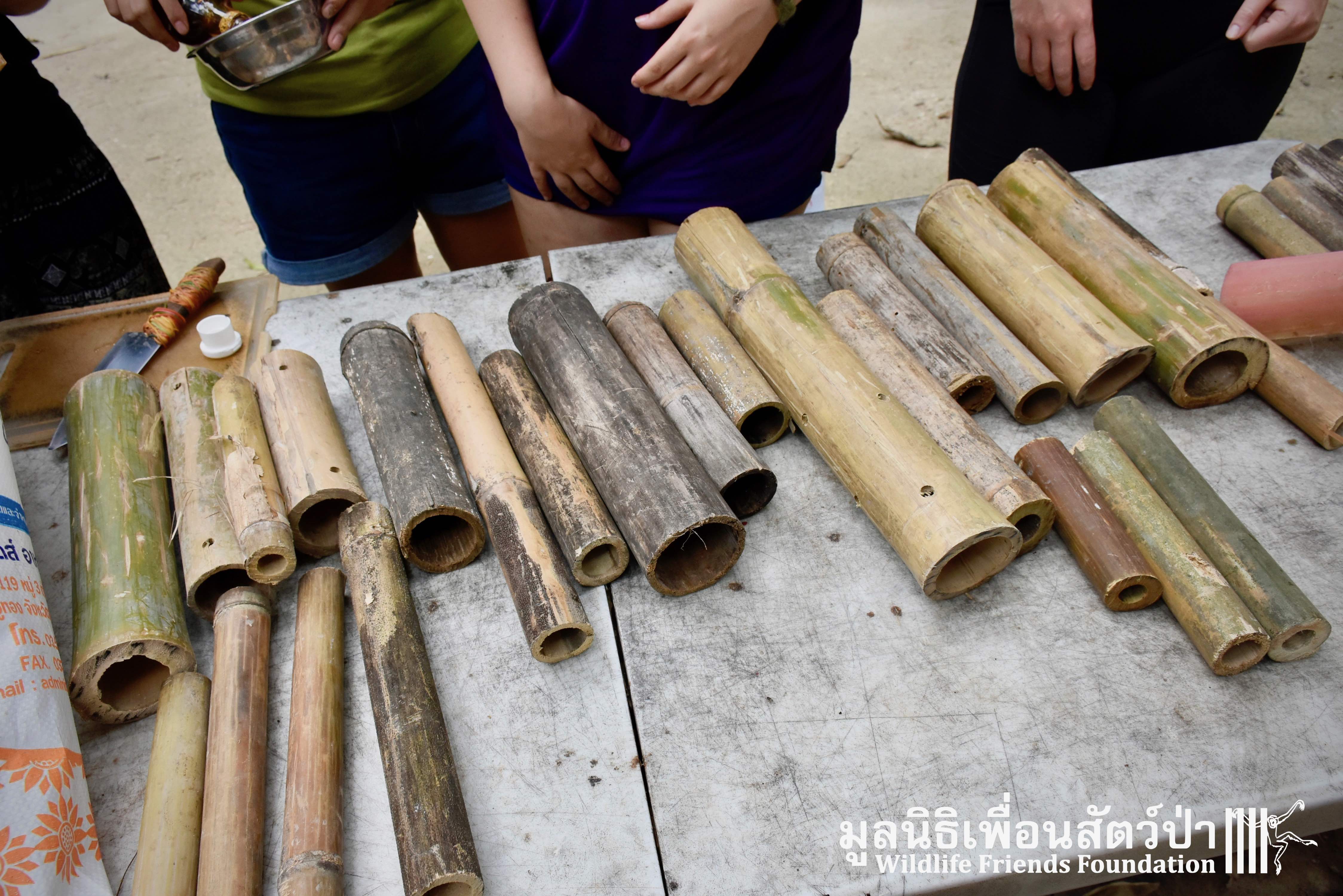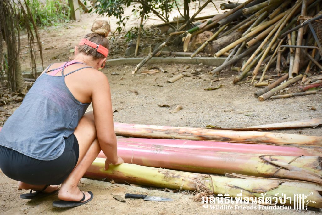 The least we can say is that our bears are more than bearly gourmets ! Our Wildlife Staff and volunteers know this ! Each day, in addition to their regular food, they have enrichments, like all the rescued animals of the WFFT center. Here to stimulated them and encourage their natural behaviour they receive treats too. And what better treat for a bear than honey?! And what better way than Bamboo sections to hide it and get our furry friends to rip it apart to reach the precious nectar, using claws and teeth. Thus providing mental and physical stimulation.