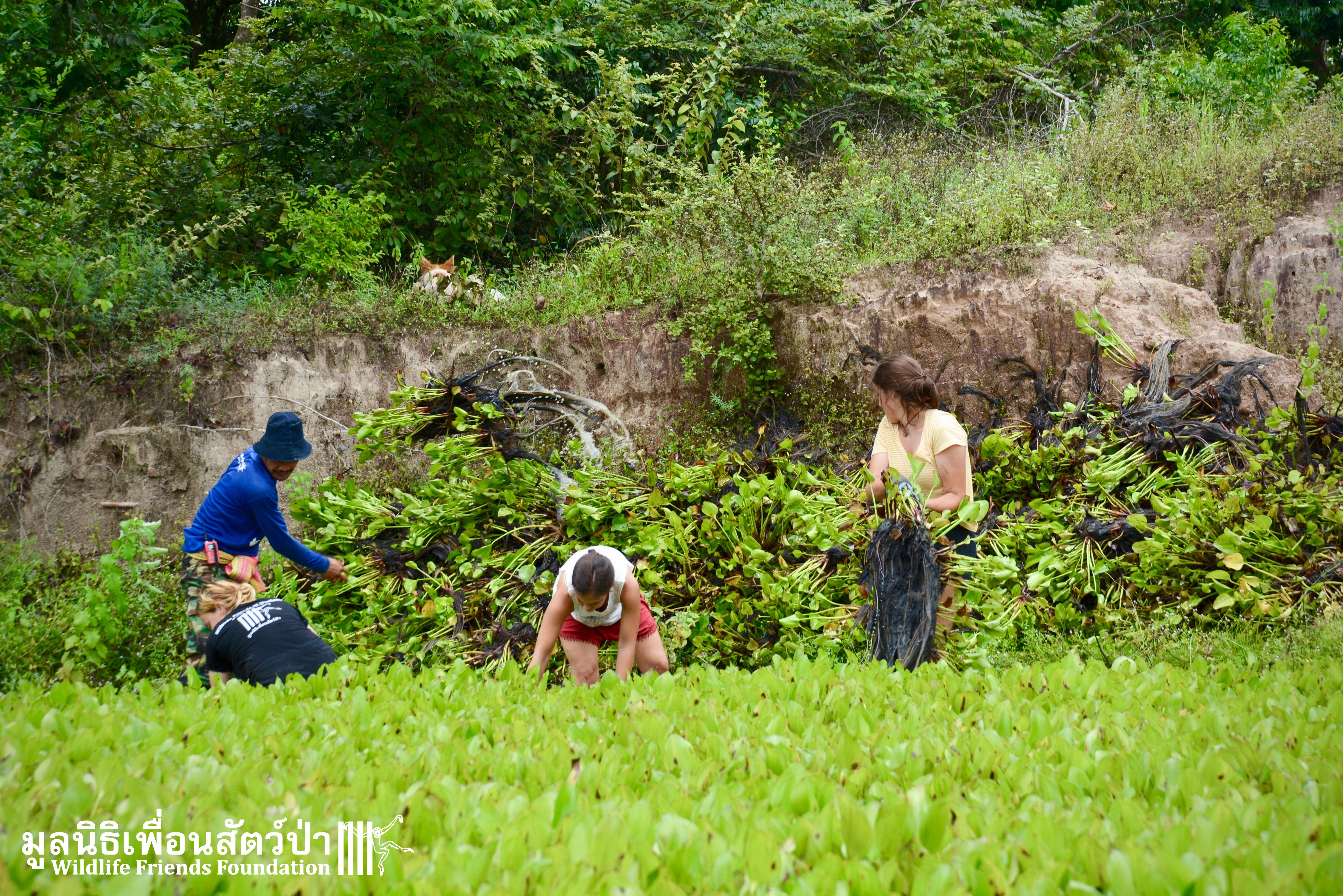 The lakes in our Project 4 elephant enclosures often become too overgrown with plants so we clear it on a monthly basis. In this particular case, we focused on the lake around a new gibbon island where a family of four endangered white handed gibbons were recently relocated. Because gibbons can’t swim and are thus afraid of water, the moat needs to remain clear to prevent them from attempting to tread on the dense aquatic foliage. For more on the gibbon story click here: https://www.wfft.org/