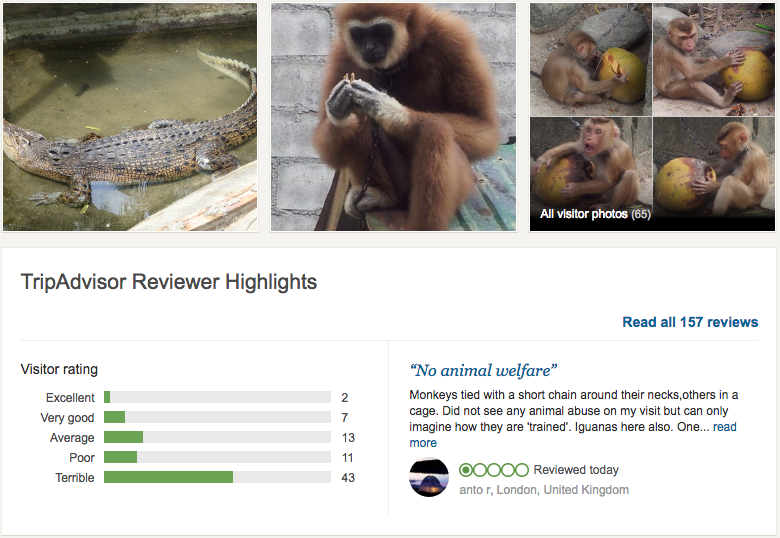 After several written and verbal complaints from people that visited the “Wildlife Conservation Centre” on Koh Samui, our founder Edwin Wiek visited the local monkey zoo, wildlife rescue centre, or wildlife conservation centre as they like to call themselves in various advertisements. This “zoo” turned out to be a hell for the poor animals living there, being kept in tiny cages, all on their own, while some are chained up all day and night. Most of the gibbons and monkeys are babies, while a few binturongs and leopard cats live in dirty cages, walking on chainlink covered with plywood. Some of the macaques are forced to perform tricks for the tourists who pay 200 to 300 baht per person to enter the zoo. Making a selfie with a macaque or gibbon will cost another 100-200 baht on top.