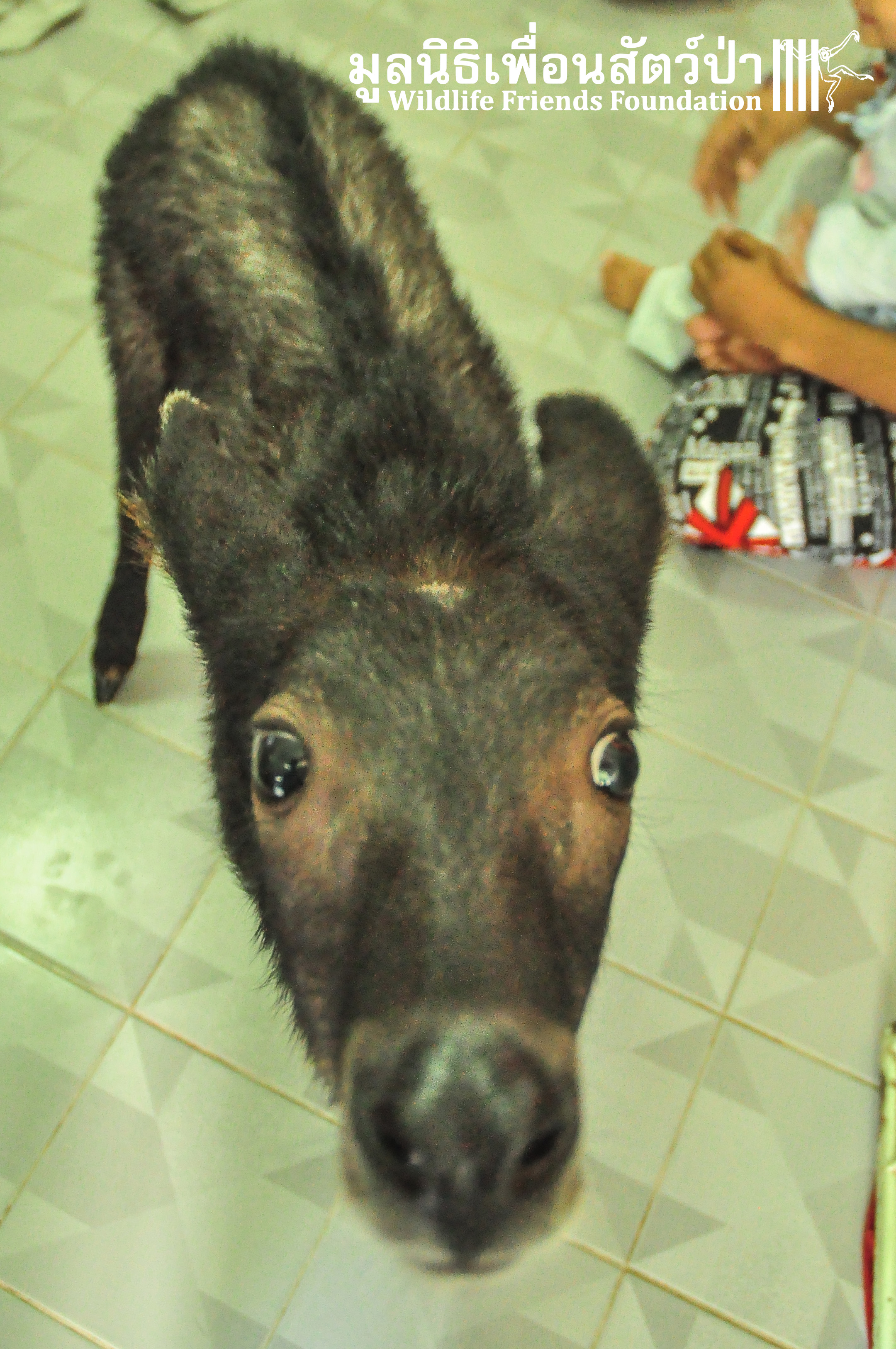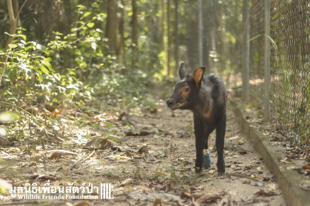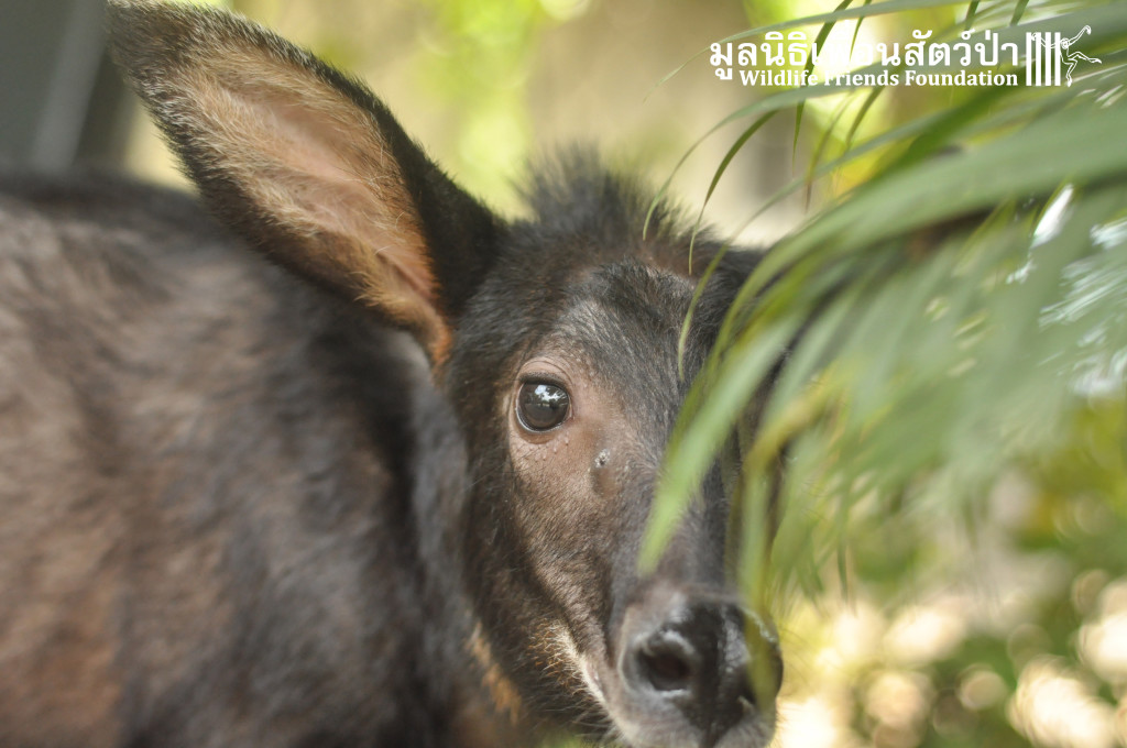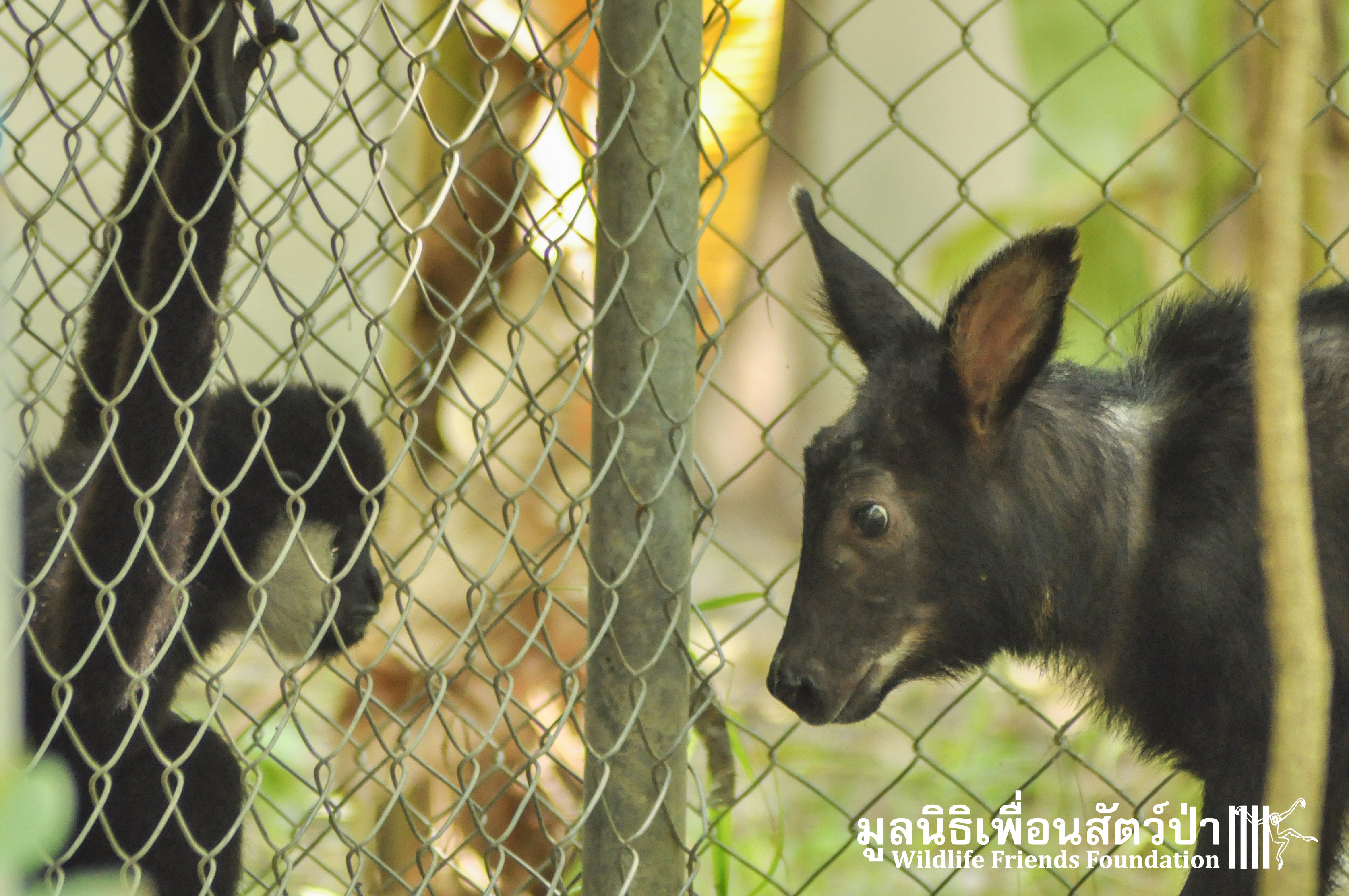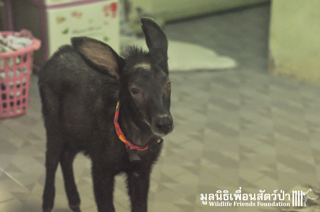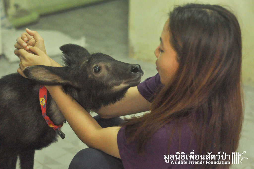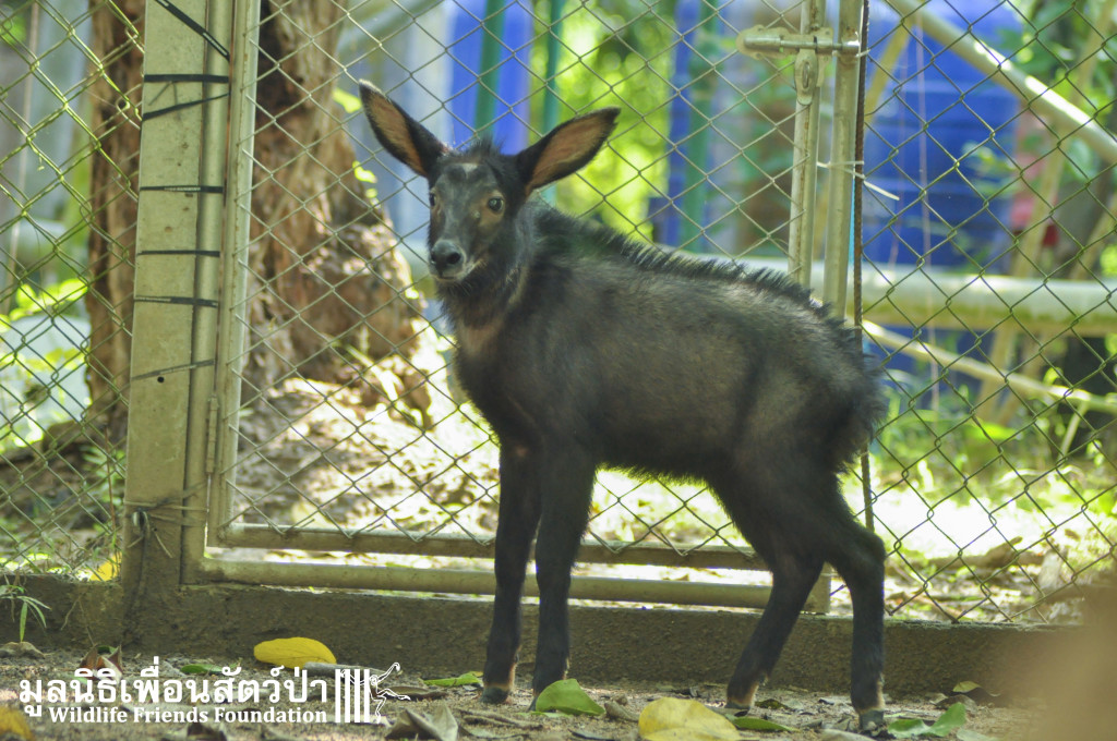 A few days ago we received a call about a 4-month-old baby mainland serow that was being kept as a pet inside someone’s house. His mother was most likely poached from the wild for meat; he was then sold to be a pet for 1000 baht. The WFFT Rescue Team went to collect him straight away, he is settling in well to life at the rescue centre. The mainland serow (Capricornis sumatraensis) is one of the most endangered animals in Thailand and is offered the strictest protection given to wildlife, as it is one of the 15 reserved wild animal species, which are defined by the Wild Animal Reservation and Protection Act of BE 1992. Originally widely distributed throughout Thailand, this species is now restricted to steep, forested limestone hills and cliffs, in areas relatively inaccessible to human encroachment and the range is highly fragmented. The meat, fur and various parts of the serow are highly prized by local people for food and medicinal purposes, so it is heavily hunted. Habitat loss primarily from agricultural expansion, but also piecemeal clearance for firewood and timber is also a serious long-term threat in some areas. We hope that in the future Dam will form a friendship with our resident serow Bruno.