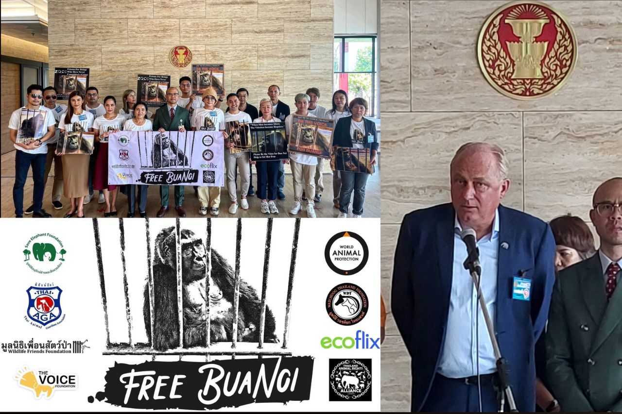 On Wednesday the 22nd of February, WFFT’s Founder Edwin Wiek joined a small protest at the Thai Parliament to push for animal welfare law changes and the immediate closure of the infamous PATA zoo. This zoo on top of a shopping mall in central Bangkok keeps Buanoi, the lone single gorilla, many other great apes and monkeys from all over the world, and other endangered and protected wild animals, even though the zoo had its zoo license revoked over 3 years ago.