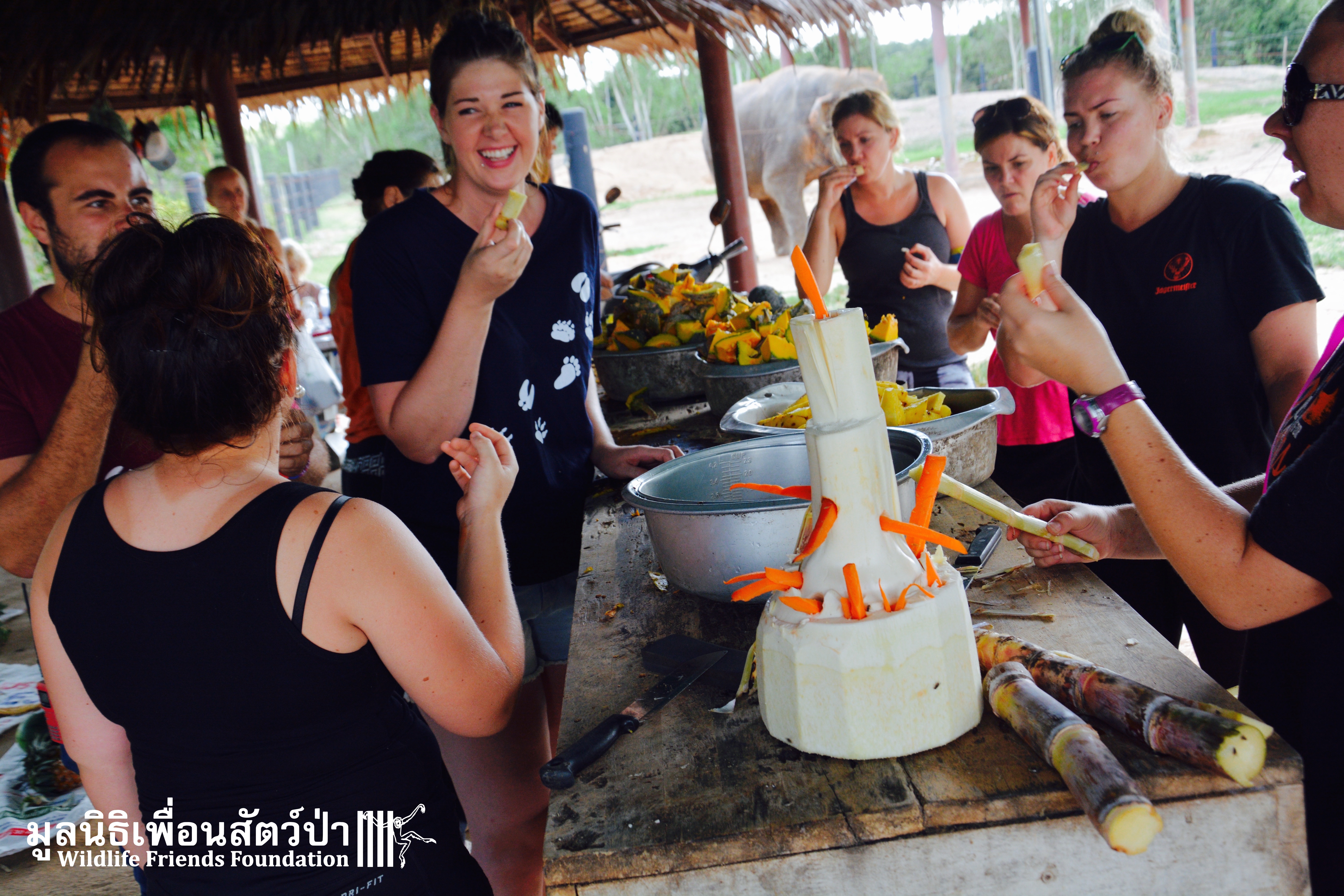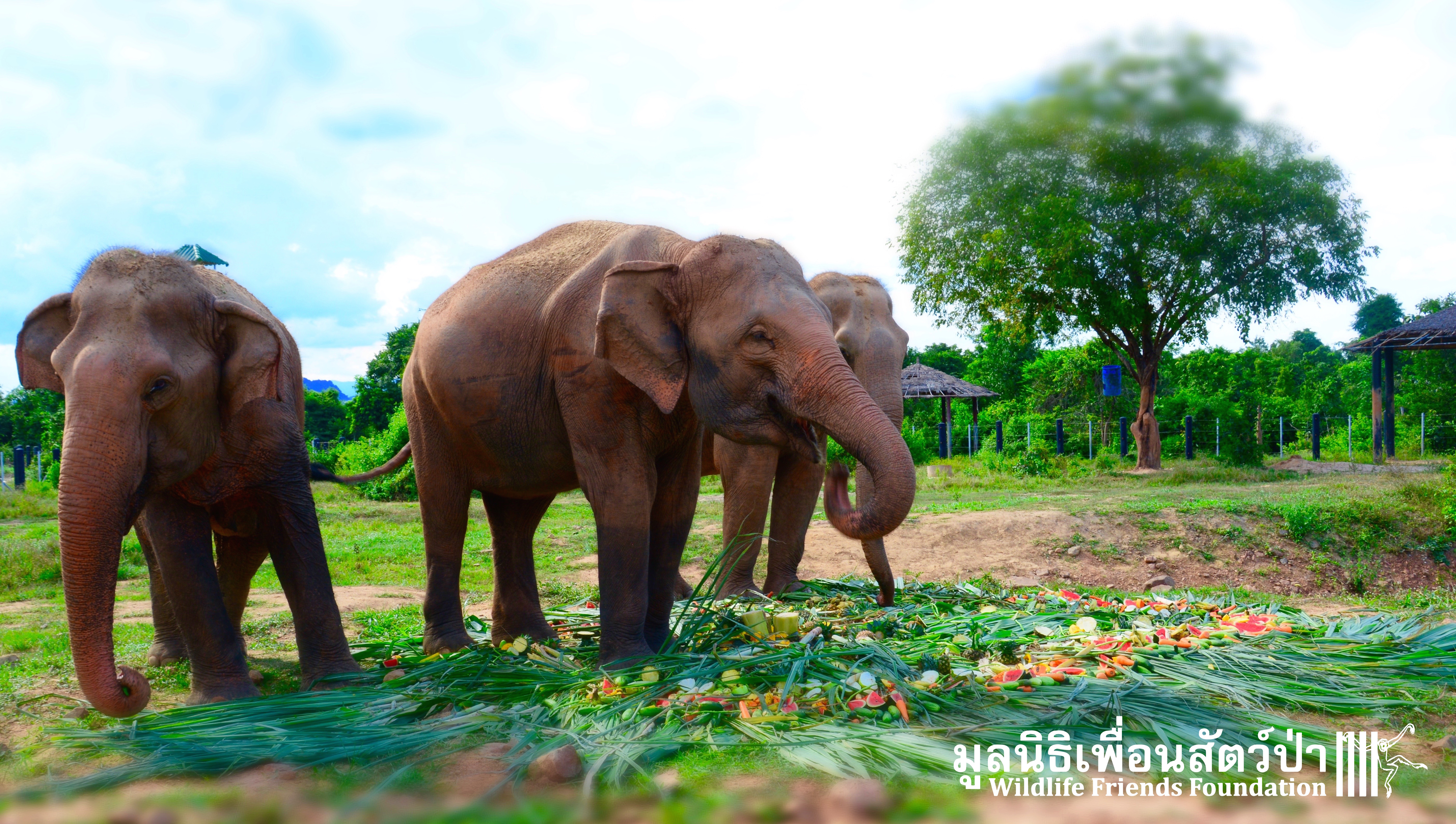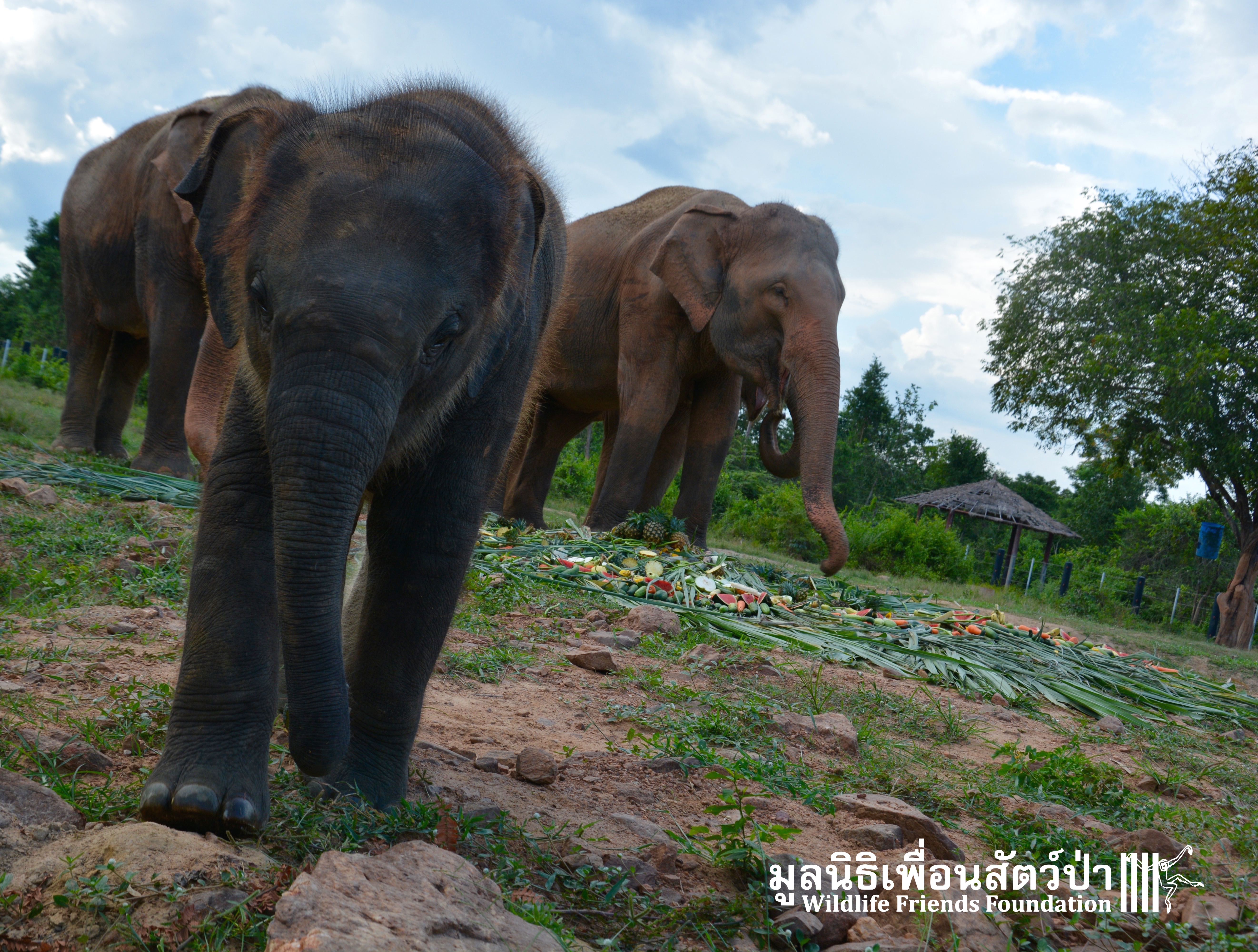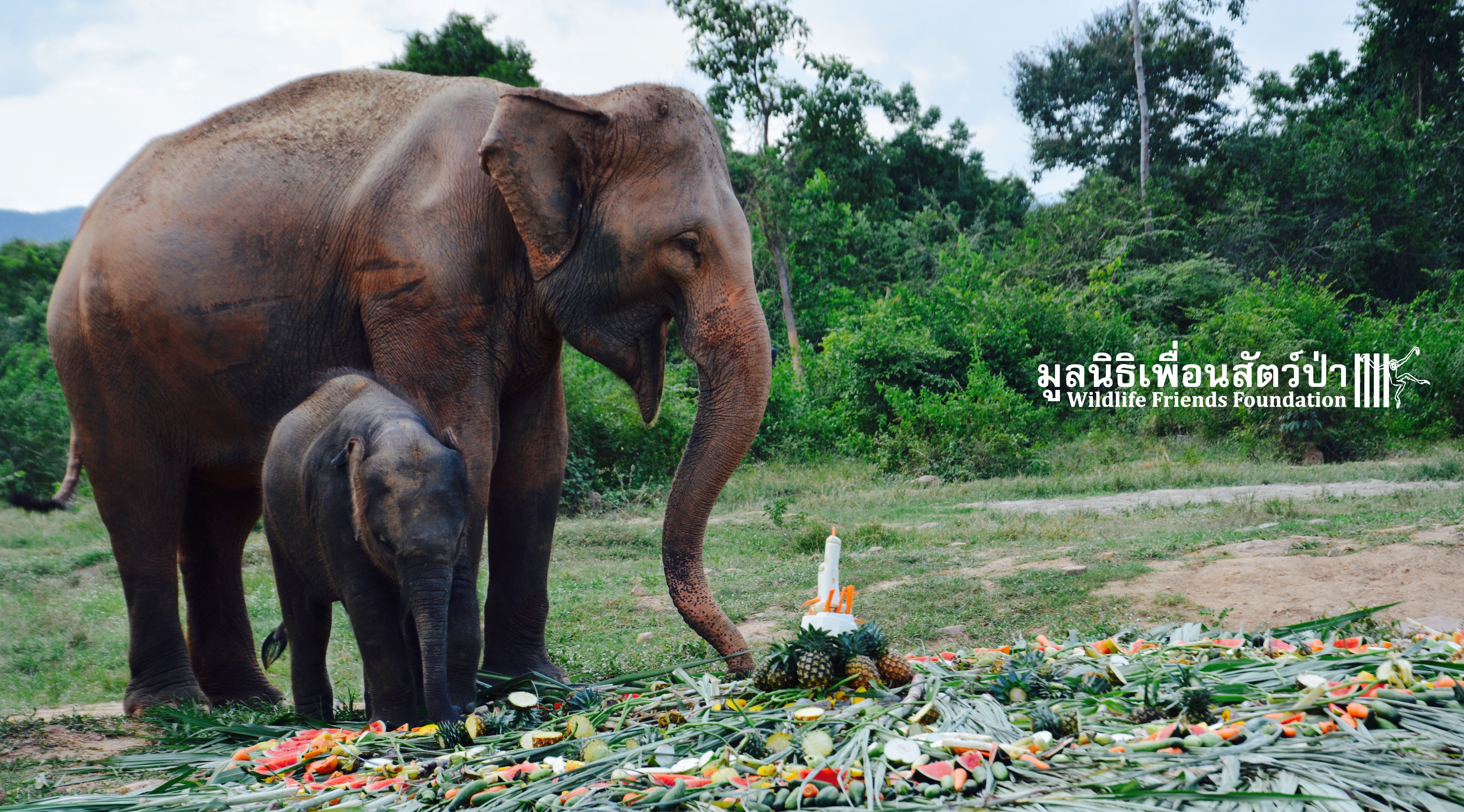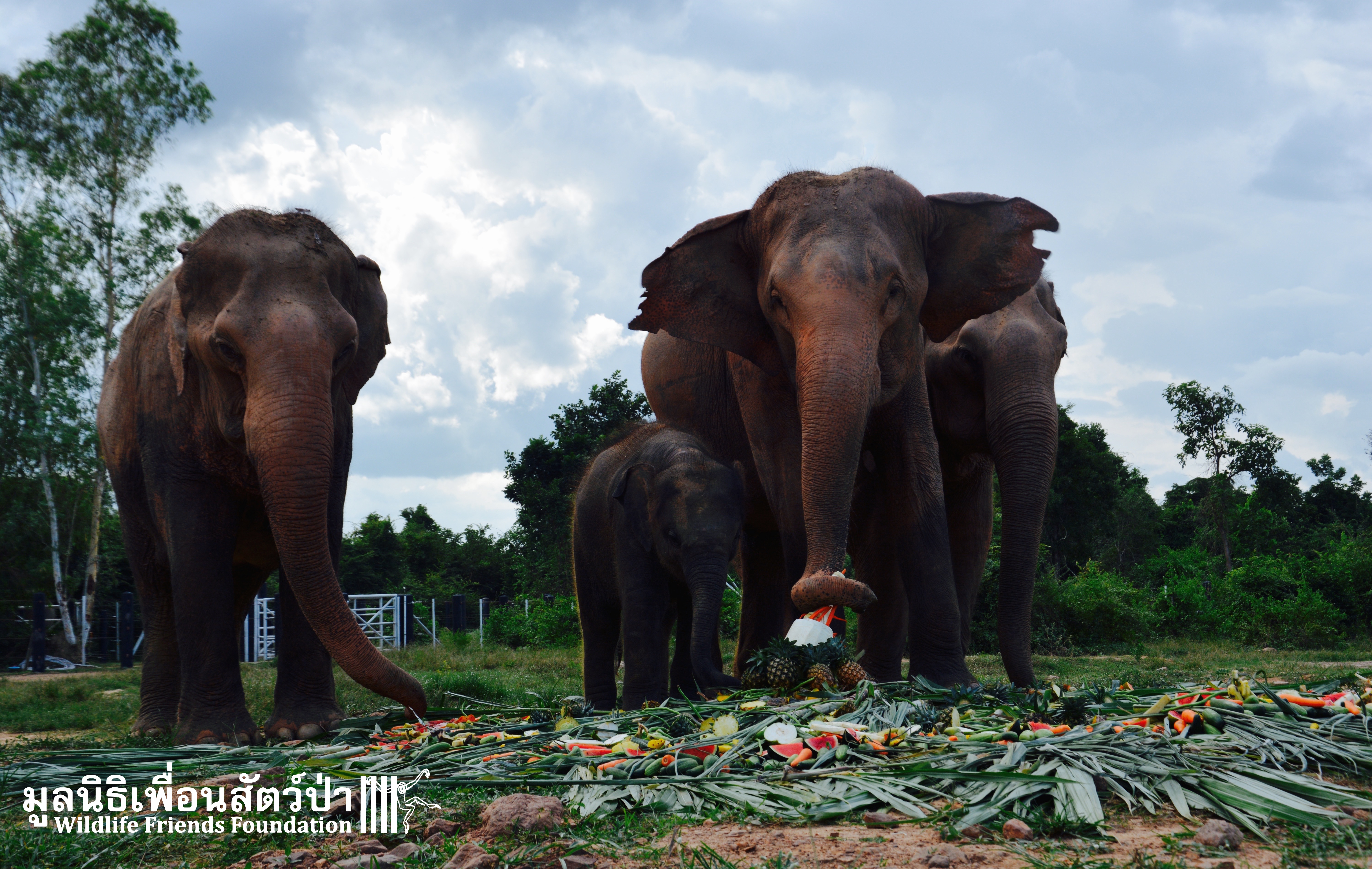 We recently celebrated baby Princesses (Pin’s) 1st birthday with a festivity of balloons, mountains of fresh fruit and an expertly carved bamboo birthday cake. Pin, her mother Pun and her two ever attentive aunties; Kaew Petch and La Ong Dao went into the grassland area of the WFFT Elephant Refuge while volunteers and the WFFT team lovingly prepared the birthday treats. Pin and Pun where rescued 5 months ago from a trekking camp where Pin was for sale. Pun gave birth to two calves previously, these calves were taken away from her at a young age. It was so heartwarming for us to be able to share the special day of her baby reaching a year of age together with her, and we very much look forward to many more happy birthdays! Among the guests at the party was Joan Pearson, a long-term supporter of WFFT whose generosity and fundraising has allowed us to progress to where we are now. Without the help of Joan and her friends we would not have been able to progress so profoundly as a foundation or provide such fantastic care for all the elephants at the elephant refuge. We would like to extend our deepest gratitude to Joan and her friends for everything they have made a possibility for us here at WFFT. Pin and her little family came running over to the birthday cake and spent the afternoon enjoying the treats whilst being wished a happy birthday by a chorus of adoring volunteers, guests and staff members. Wishing a very happy 1st birthday to beautiful Princess!!!
