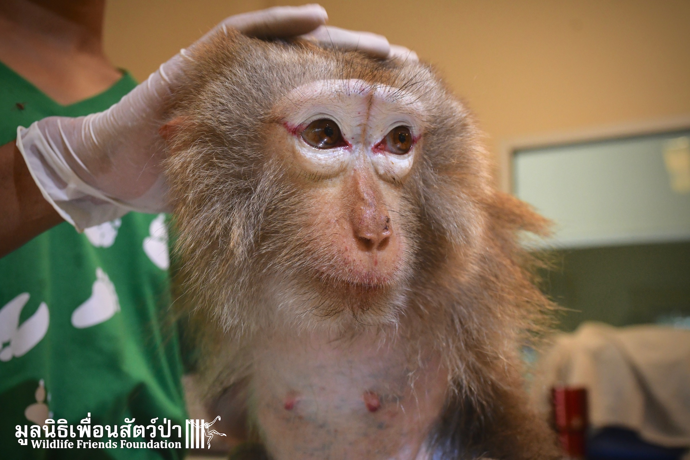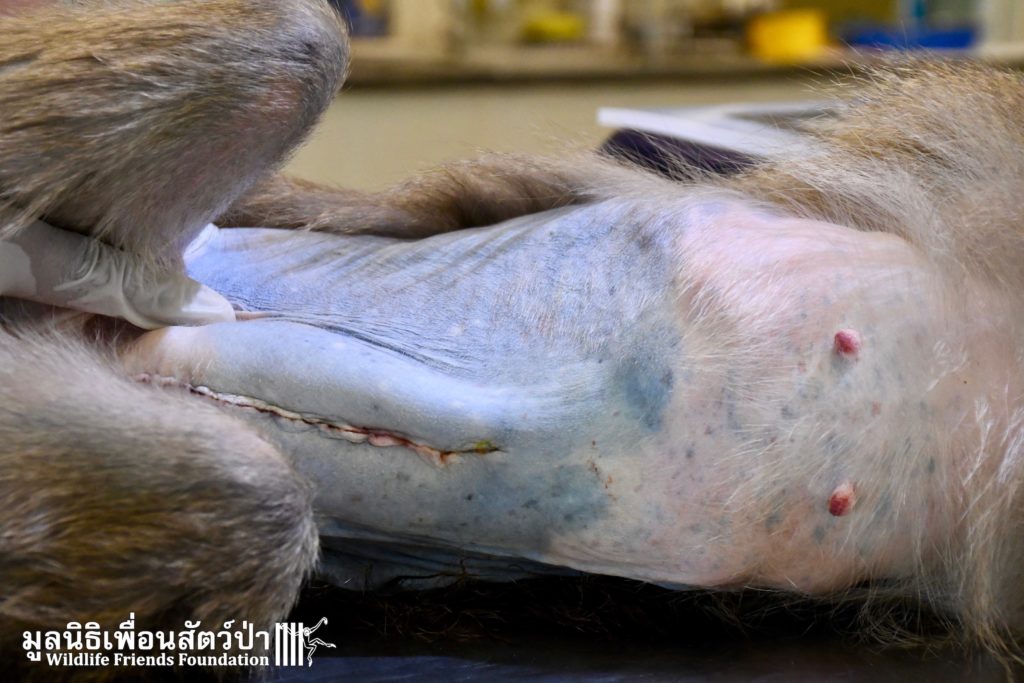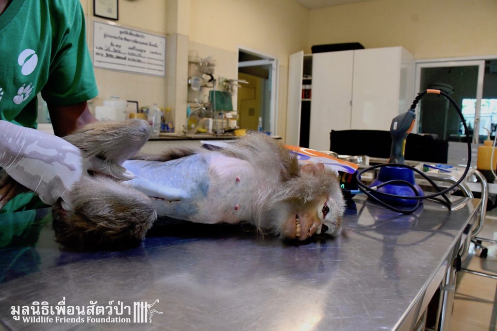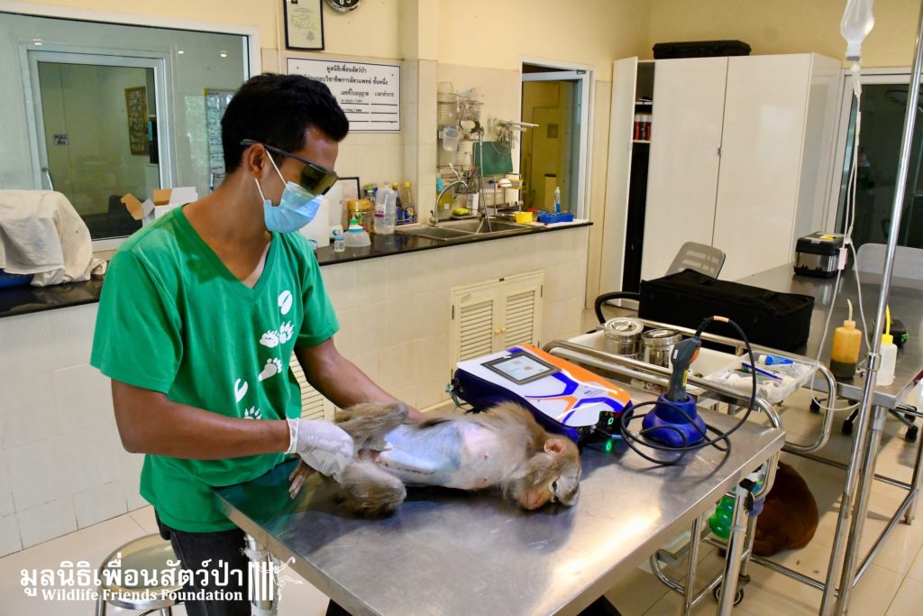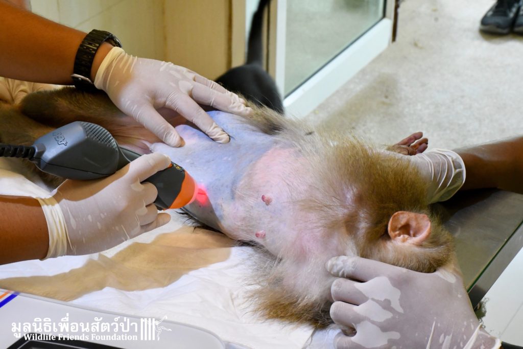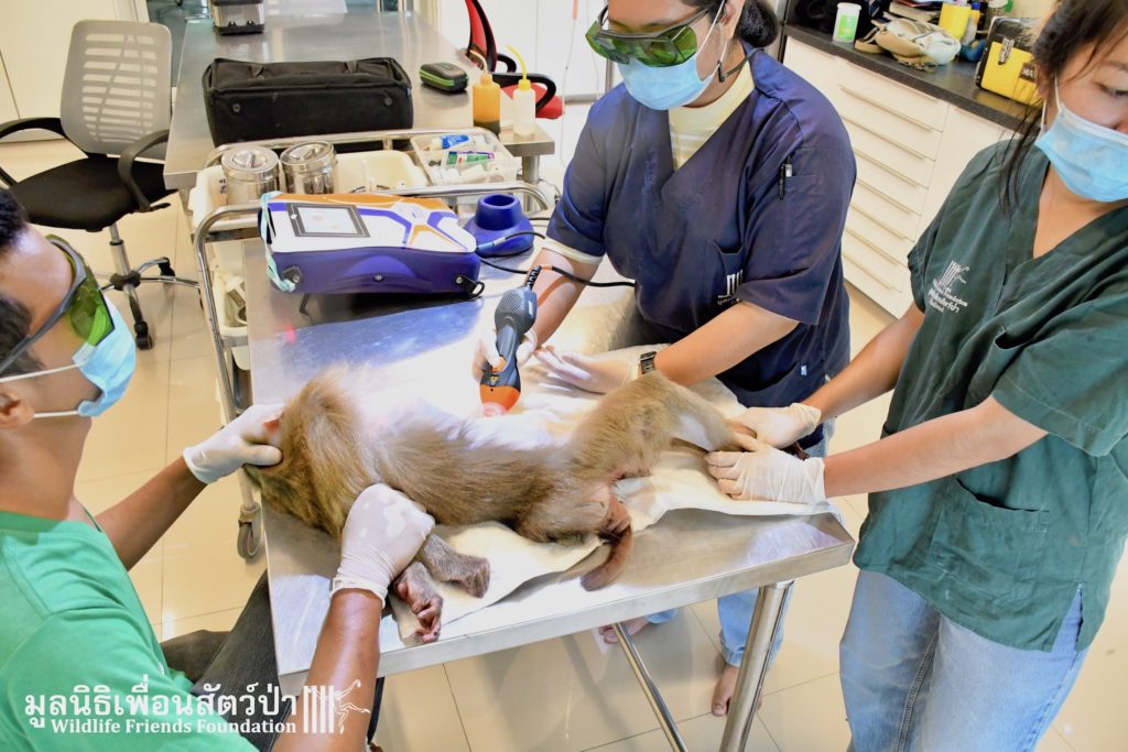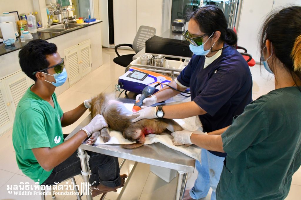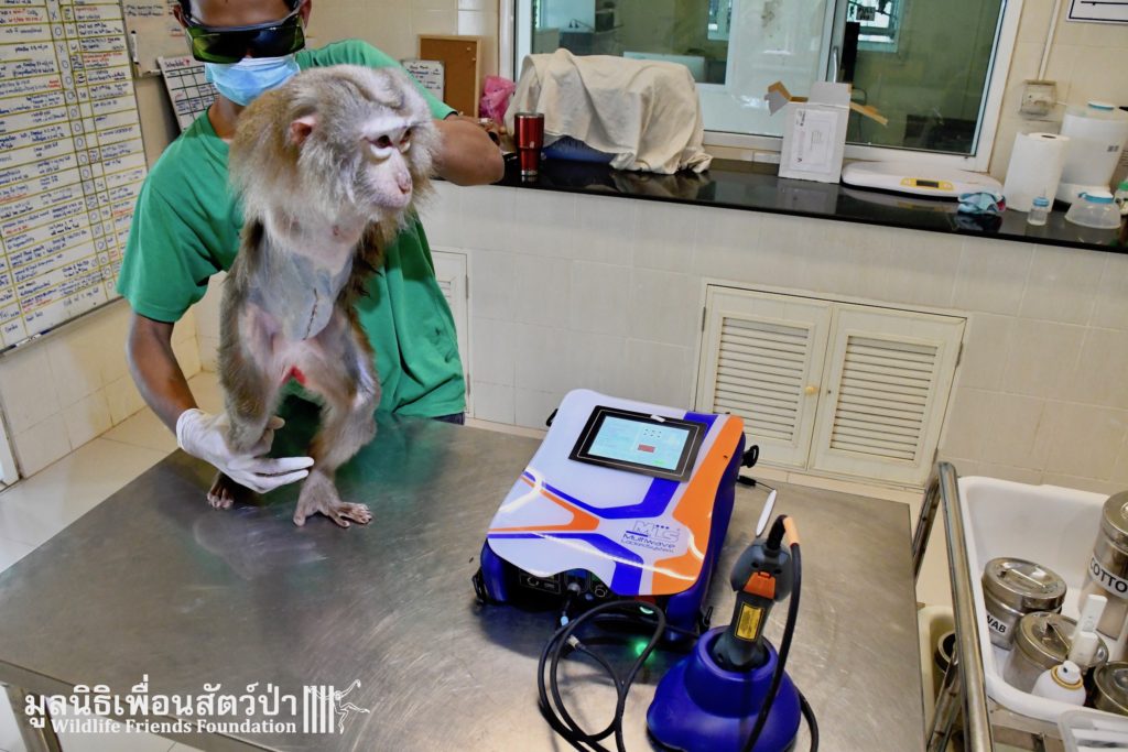 Yui the elderly Northern pig-tailed macaque had a large mass growing on her uterus, it was causing a lot of discomfort. The mass had to be removed; the incision to remove this mass left a large wound, which needs cleaning every day. We have been lucky to have a demo Laser Therapy Machine during this time to help her wound heal. However the machine was only here for a short period of time. Due to the vast improvements have seen using this machine we have rented it for one more month as its currently far out of our budget to purchase it. It costs 30,000 THB (1000 USD) per month to rent or 1.25m THB (42,000 USD) to purchase. We would like to rent it until we can afford to purchase one on a permanent basis.