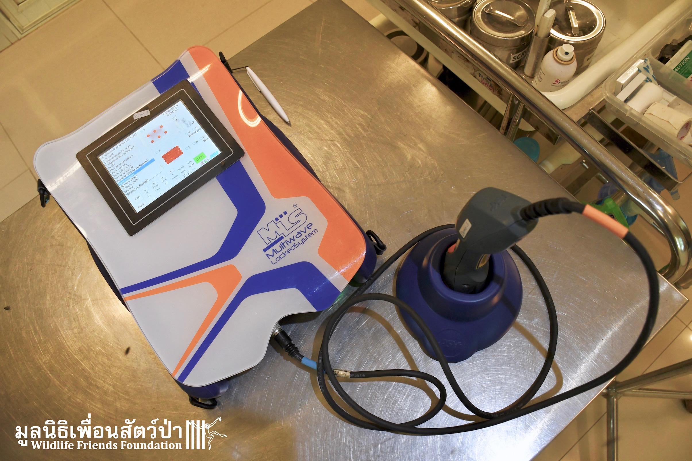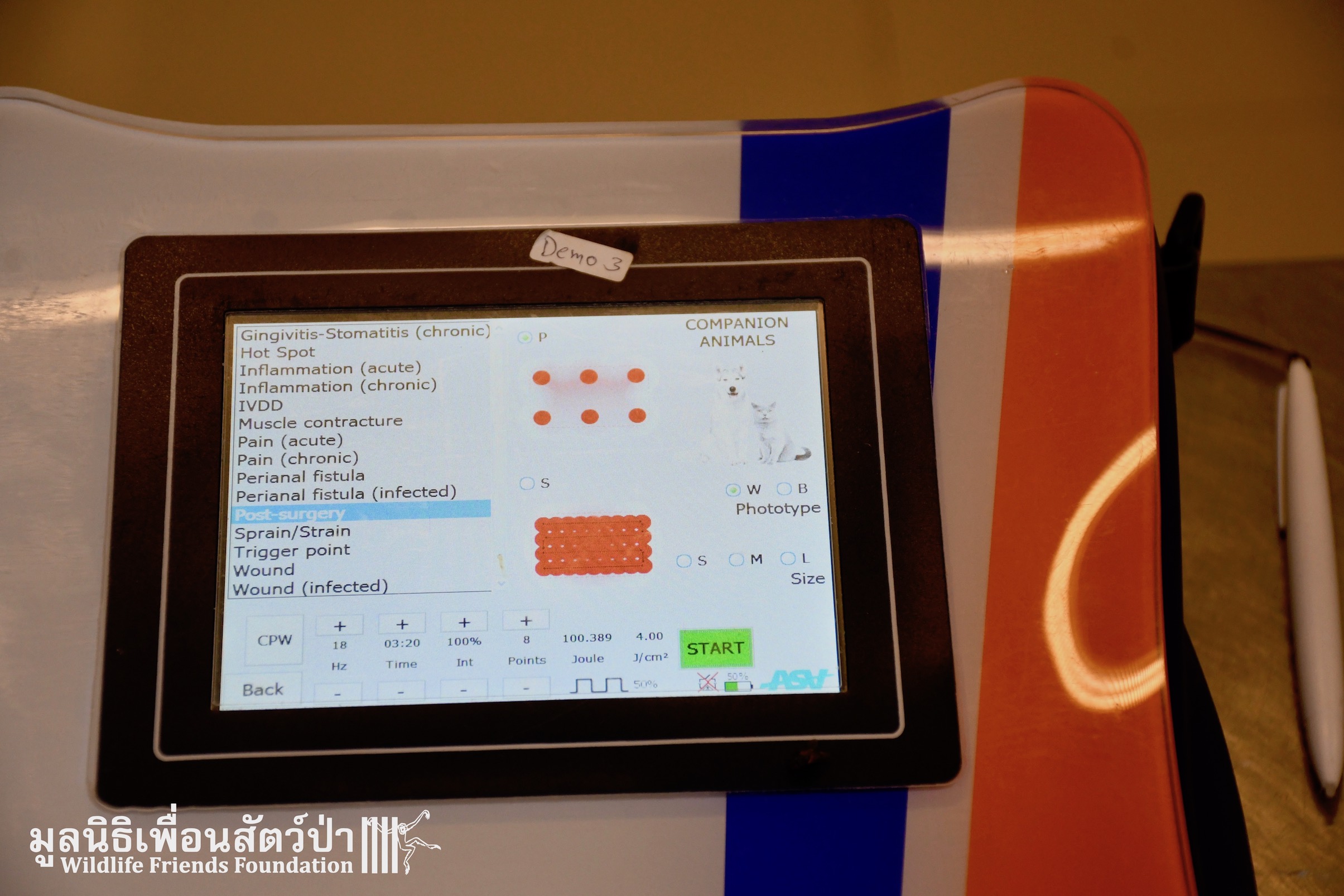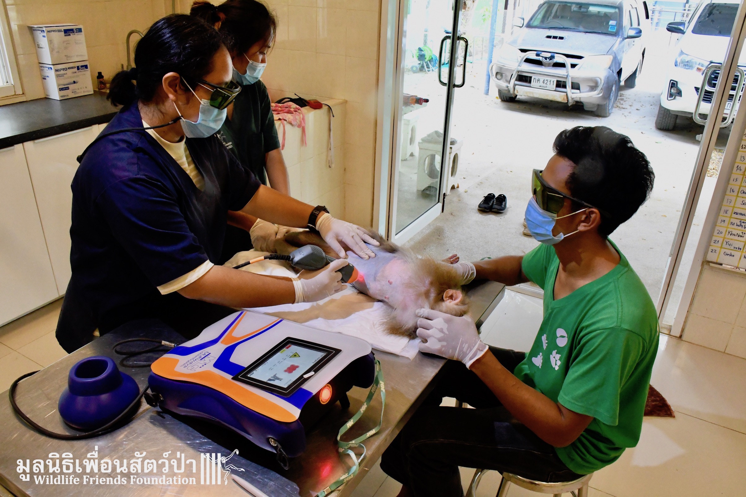(Scroll down for English) เครื่องเลเซอร์บำบัดเพื่อสัตว์ของเรา “ยุ้ย” ลิงกังเหนือวัยชรา เกิดมีก้อนเนื้องอกขึ้นที่มดลูกของเธอ มันทำให้เธอรู้สึกไม่ค่อยสบายตัวนัก และจำเป็นที่จะต้องตัดออก ทำให้ยุ้ยเหลือบาดแผลขนาดใหญ่เอาไว้ซึ่งจะต้องทำความสะอาดบาดแผลสม่ำเสมอทุกวัน แต่โชคดีของยุ้ยที่เราได้ใช้เครื่องเลเซอร์บำบัดแบบสาธิตในช่วงเวลานี้ เพื่อช่วยทำให้แผลดีขึ้น แต่น่าเสียดายที่ว่าเครื่องนี้จะอยู่ให้เราใช้งานได้ในช่วงระยะเวลาสั้นๆเท่านั้น หากแต่เราได้เห็นประสิทธิภาพ และการเพิ่มศักยภาพในการรักษาให้สูงขึ้นเป็นอย่างมากจากการใช้เครื่องเลเซอร์บำบัดนี้ เราจึงตัดสินใจเช่าเครื่องนี้มาใช้ประโยชน์เพิ่มอีกหนึ่งเดือนเท่านั้น เพราะเรามีข้อจำกัดเรื่องงบประมาณเกินกว่าที่จะดำเนินการซื้อมาประจำการถาวรได้ ด้วยค่าเช่าในอัตรา 30,000 บาท (1,000 เหรียญสหรัฐ) ต่อเดือน หรือ ราคา 1.25 ล้านบาท (42,000 เหรียญสหรัฐ) ในกรณีสั่งซื้อ อย่างไรก็ตามเรายังคงต้องการเช่าเครื่องเลเซอร์บำบัดนี้ จนกว่าที่เราจะมีความสามารถจัดซื้อมาอย่างถาวรได้ เรายังมีสัตว์ชนิดต่างๆ ที่อยู่ในความดูแลของเรา ไม่ว่าจะเป็นช้าง และสัตว์ป่าอื่นๆ ที่จะได้รับประโยชน์จากเทคโนโลยีเลเซอร์บำบัดนี้ และแน่นอนว่า หากเรามีสัตว์ที่เจ็บป่วยในอนาคตก็จะสามารถได้รับประโยชน์จากเทคโนโลยีนี้เช่นกัน การรักษาด้วยเลเซอร์บำบัดเป็นวิธีที่ดีเยี่ยมที่จะบรรเทาความเจ็บปวด ลดอาการอักเสบ และเร่งกระบวนการรักษาให้เร็วยิ่งขึ้นได้ หากท่านสามารถช่วยให้เครื่องเลเซอร์บำบัดนี้อยู่กับเราได้ยาวนานยิ่งขึ้น หรือช่วยให้เราได้มีโอกาสซื้อมาประจำแบบถาวร ได้โปรดให้ความกรุณาติดต่อเรา ได้ที่ info@wfft.org หรือบริจาคโดยตรง ได้ที่ www.wfft.org/donate/. โดยท่านสามารถแจ้งความจำนงให้การสนับสนุนเครื่องเลเซอร์บำบัดได้ เราขอแสดงความขอบคุณอีกครั้งสำหรับผู้ที่ให้การสนับสนุนและมีอุปการะคุณทุกท่าน