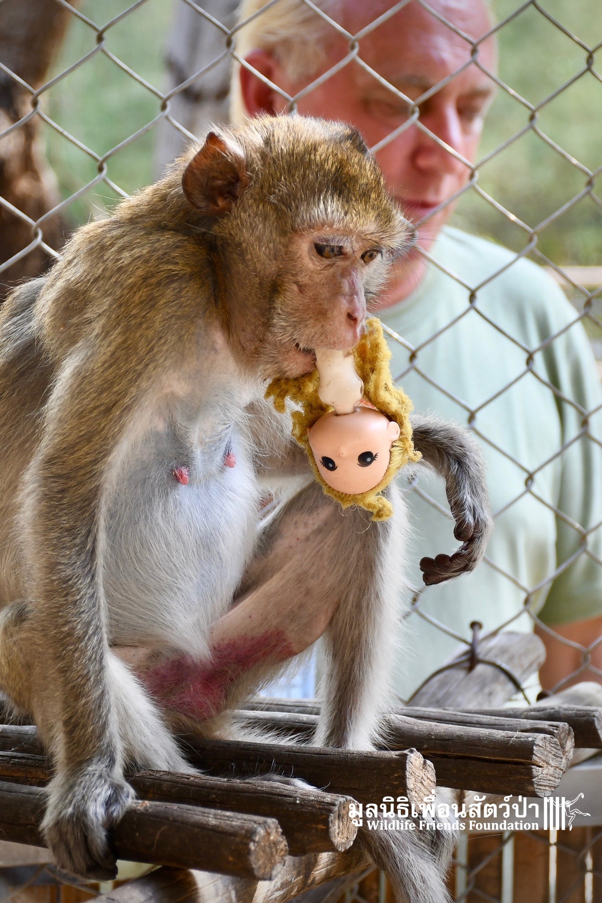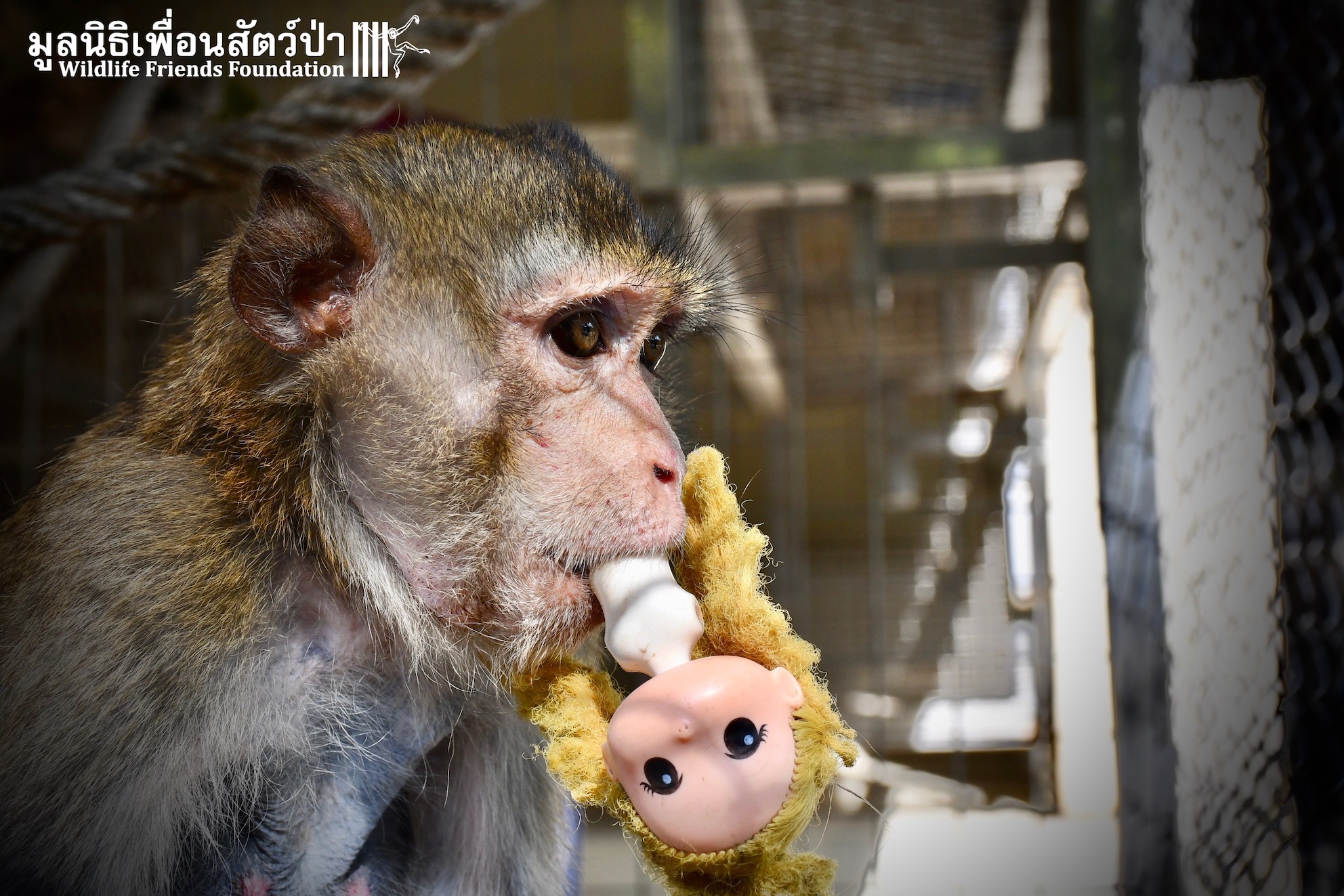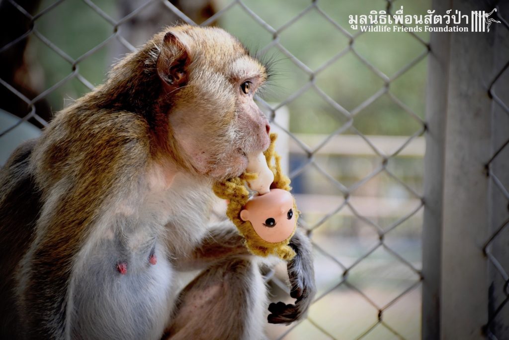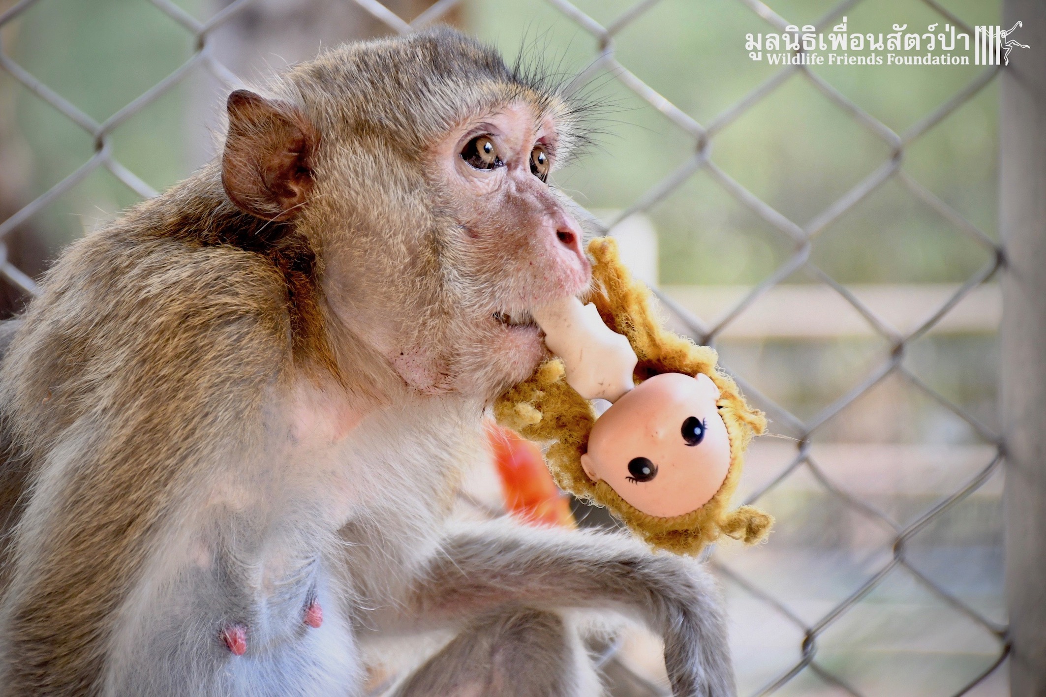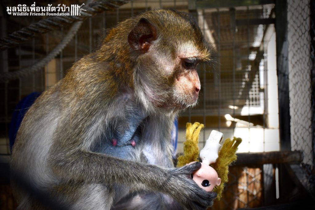 Maruay has been with us for 2 weeks now, she is undergoing a quarantine period at the WFFT Wildlife Hospital along with her two dolls. These dolls have been her only source of comfort over the years and she is very upset if separated from them. Imagine having no other friends, no other monkeys to socialize with, and some plastic dolls as a replacement. Luckily here at WFFT we have some other elderly monkeys which we hope to introduce her to in the not to distant future.